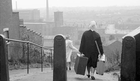 The kitchen sink films, made in Britain in the sixties, are notable for showing working class people going about their ordinary lives. They’re mostly black and white, and uniformly gorgeous. They’re often filmed on location with natural lighting, and set in the cramped twisting streets and alleys that wind behind rows of small houses–an inescapable maze of damp bricks and neighborly surveillance. A stifling space.