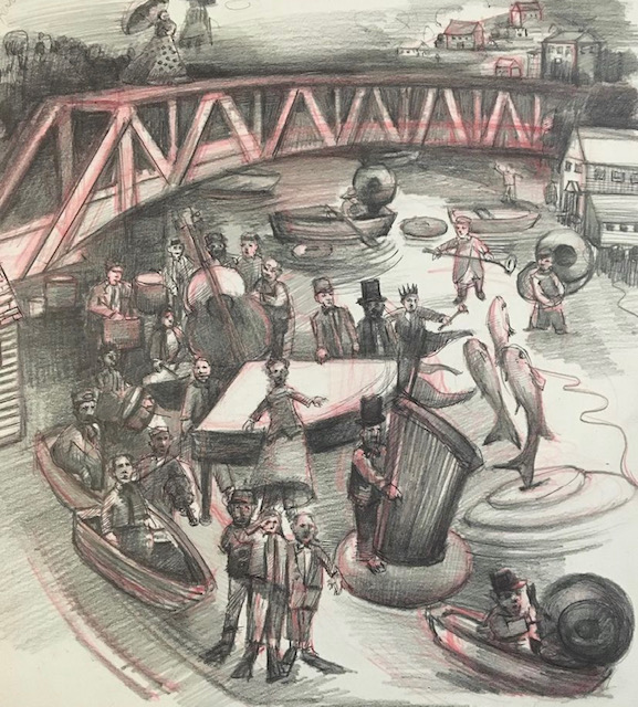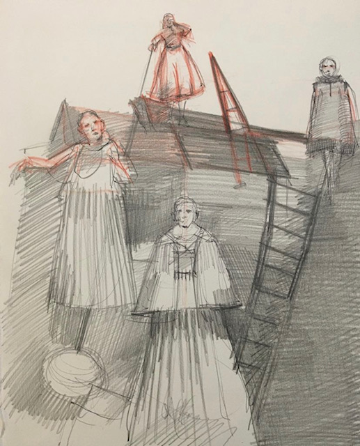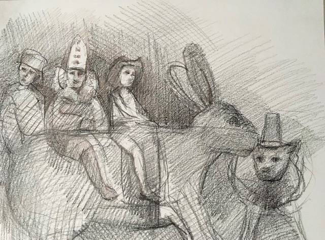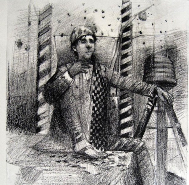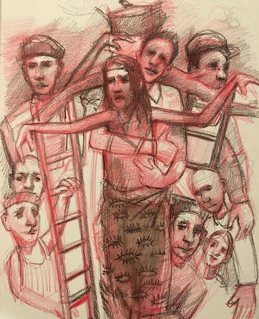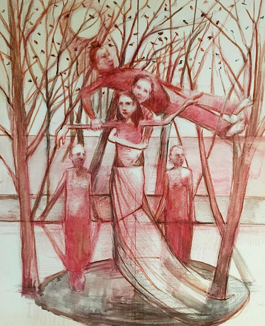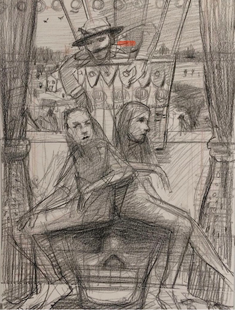 Choreographed, the figures evolve from the efforts they make to define the precipice of engagement. The rhythms of awareness can lead to celebration or exploration. Both of which I choose to populate my paintings with. I think salvation comes to these characters as the painting evolves from efforts they make to define the precipice of engagement. These drawings/under paintings offer a setting, that will possibly tease out some resolution. The ingredients of each work must be explored to allow the narrative to develop. This is a process open to change. I will develop the characters in relationship to their surroundings. The surroundings are often littered with useful symbols that elaborate on the emotional information, a painting may require for completion. The ingredients of a painting are negotiable, possibly to achieve an outcome that entertains, the satisfaction that results from a painting’s energy and conclusion is the mystery each contains.