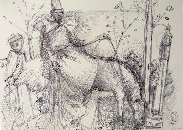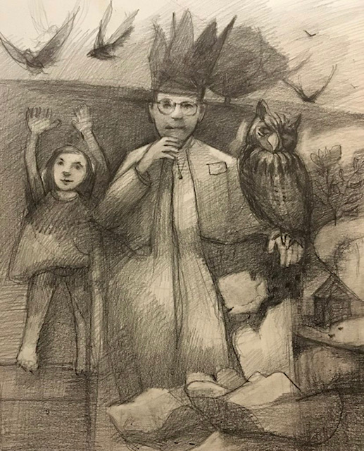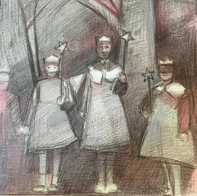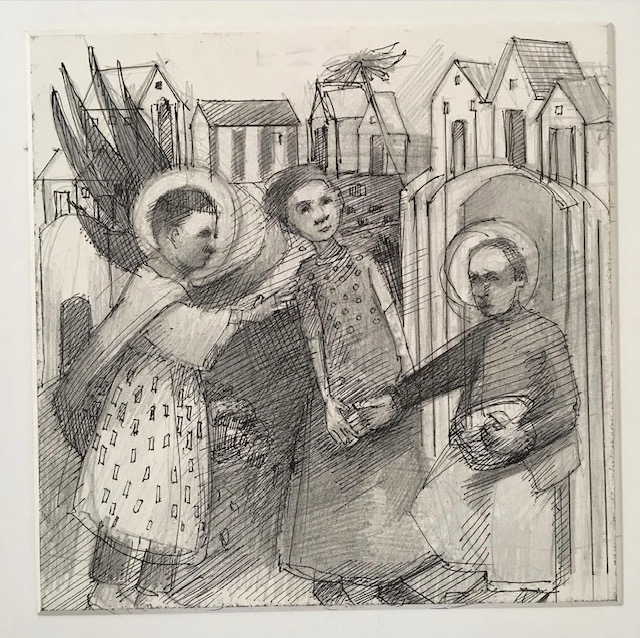James Feehan’s “night drawings” exist in a dreamlike world where anything is possible, inhabited by a certain cast of characters: saints, circus performers, a new version of the commedia dell’arte, or people who have stepped bodily out of old photographs. We find shadowy towns or cities and mysterious people in the background, with strange and delightful structures throughout. The images teem with a pattern of iconography; saintly or angelic garb, halos, attitude, gesture, expression. But these slightly saintly folk are ordinary people, on some level. Eccentric, maybe, but not all that unlike the rest of us. The characters and symbols are familiar like people we meet in recurring dreams. And as one does with a recurring dream, we find ourselves wanting to understand the symbolism, to decode motifs that run throughout the images and the mythologies that connect the works.