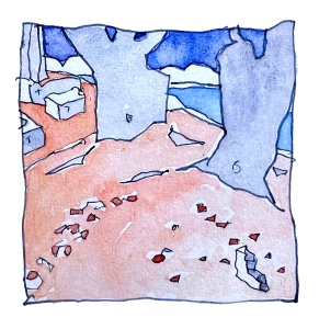 More small coastal villages. I suppose the road follows earlier footpaths, winding through the hills. I was impatient drawing, the houses become colored blobs with shadows and peaked roofs, the palms a scrawl.