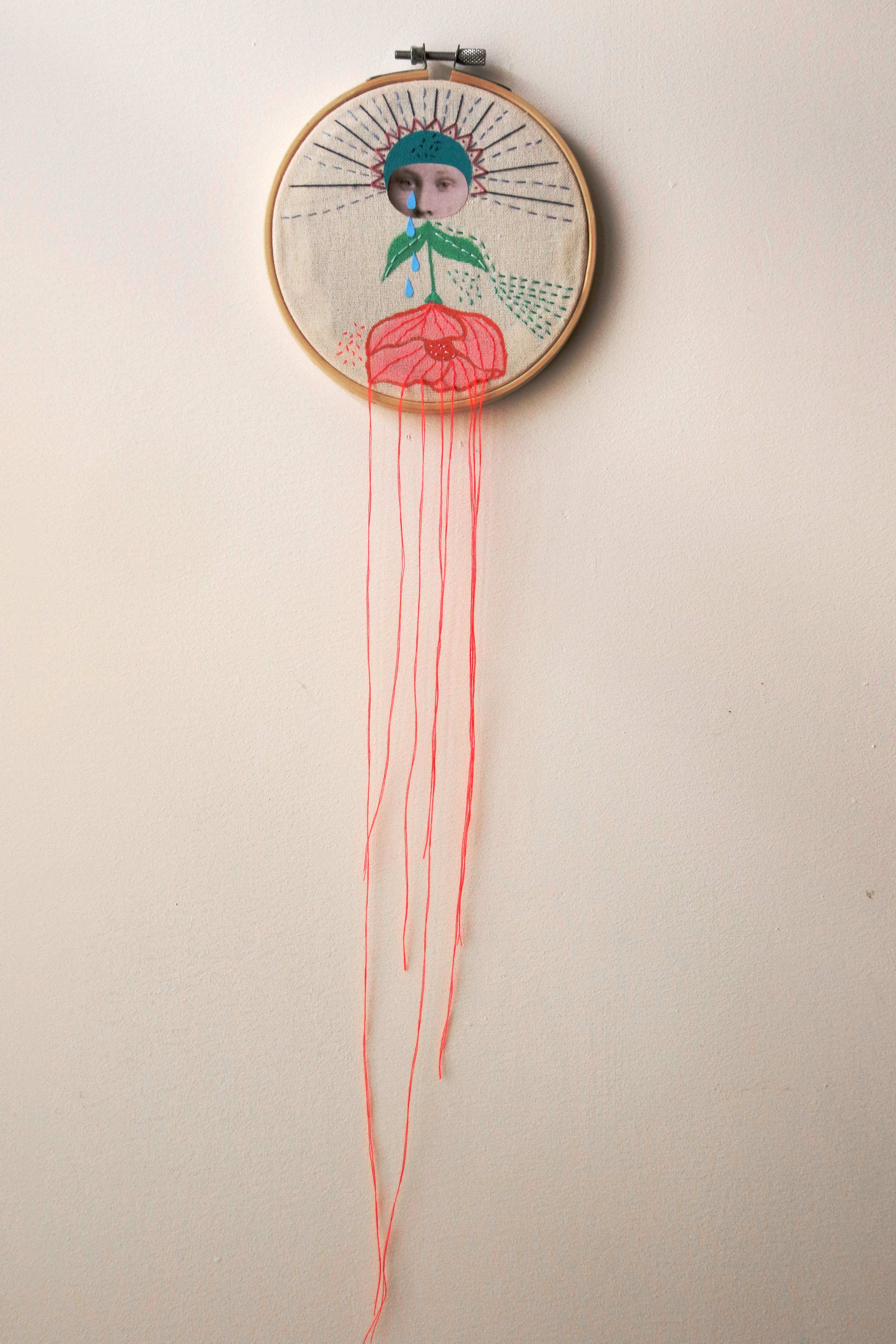 I understand that your background is in filmmaking. I wonder how this informs your sense of composition? There’s so much movement and life in each image that it seems to extend beyond the traditional framing of a still picture, sometimes by actual embroidery thread, sometimes by pieces of narrative thread. Do you feel that you approach your work cinematically?