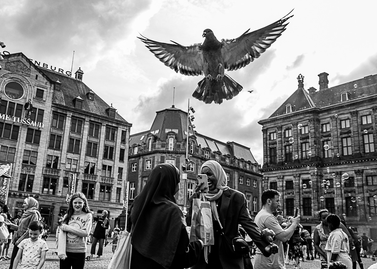 When composing a street shot I try to fill up my frame of my wide angle lens. Usually, that means having different subjects on different spots within my frame. So, since things in front of my lens are not usually in the same plane that creates an absurdity with respect to the size of my subjects. Juxtaposing is another way to create such effects and can be very difficult to detect on the street at first. When I started composing, I would mostly try to allocate a specific spot within the frame for each one of my subjects. After studying the photographs of many of the modern masters of juxtaposition I now sometimes question whether a photograph can be even more powerful when the subjects are laid on top of each other rather than perfectly next to each other without any overlap. It’s an ongoing process and personal development in my work. Yes, humor and absurdity are things that draw my attention as well as beauty in the always-changing-geometry of the subjects moving in front of you second after second.