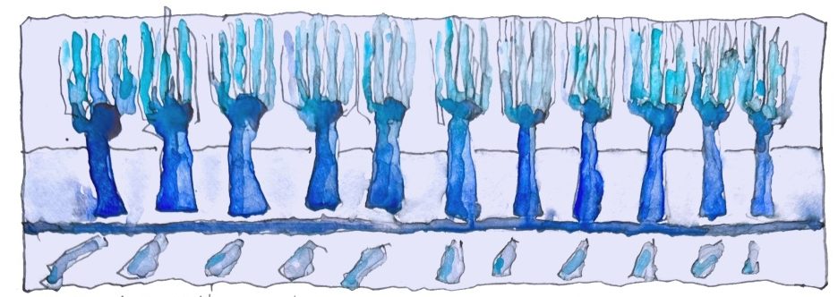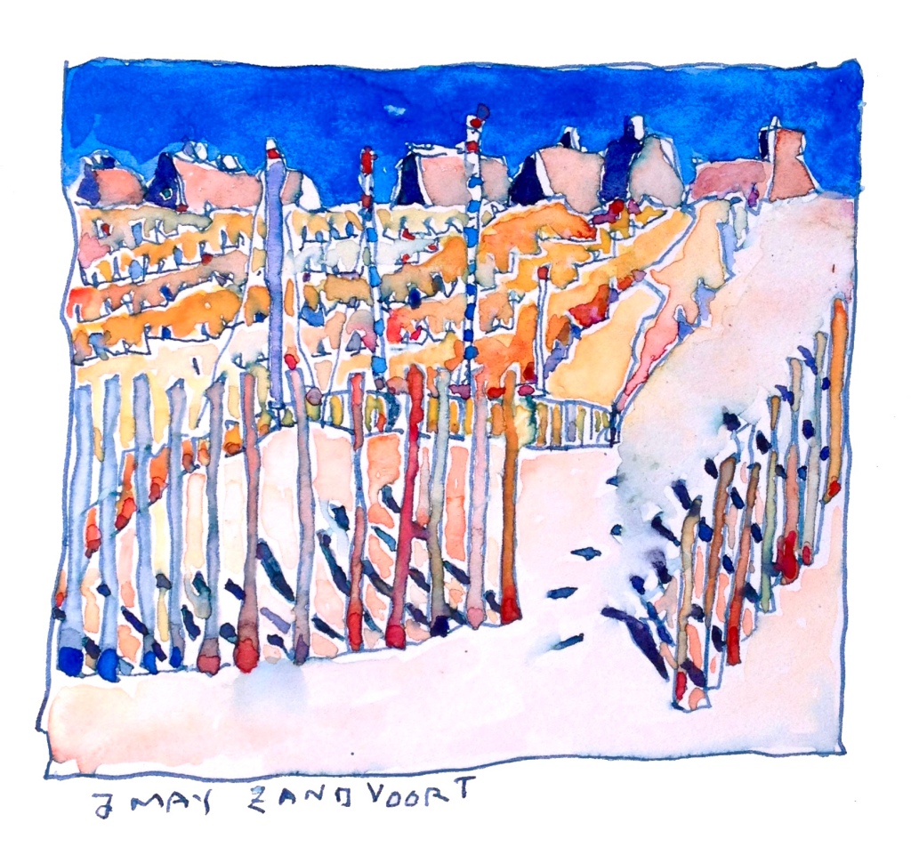 I had just started drawing with a Japanese blue ink (Sailor Sei-Boku). The color goes well with all the Dutch water. You can almost match the ink color with a mixture of French ultramarine and Indian red.