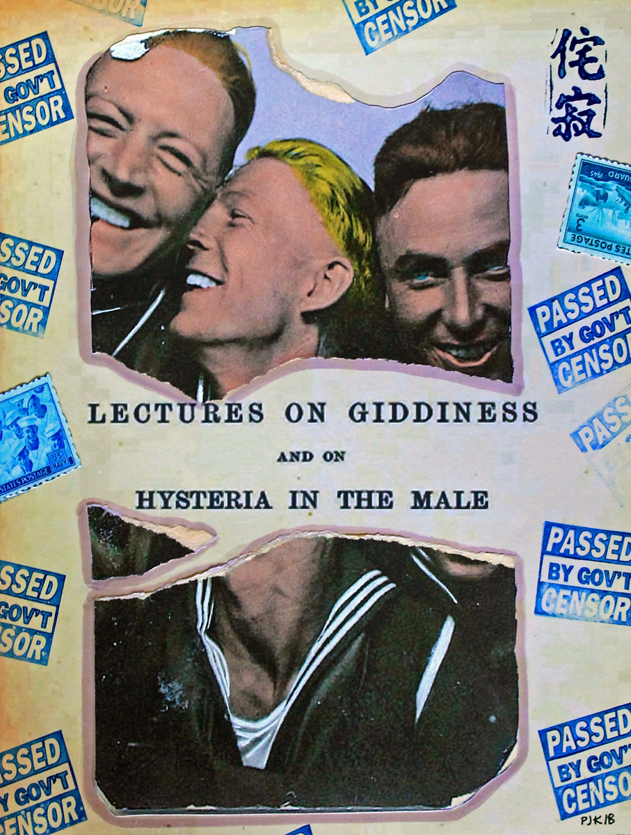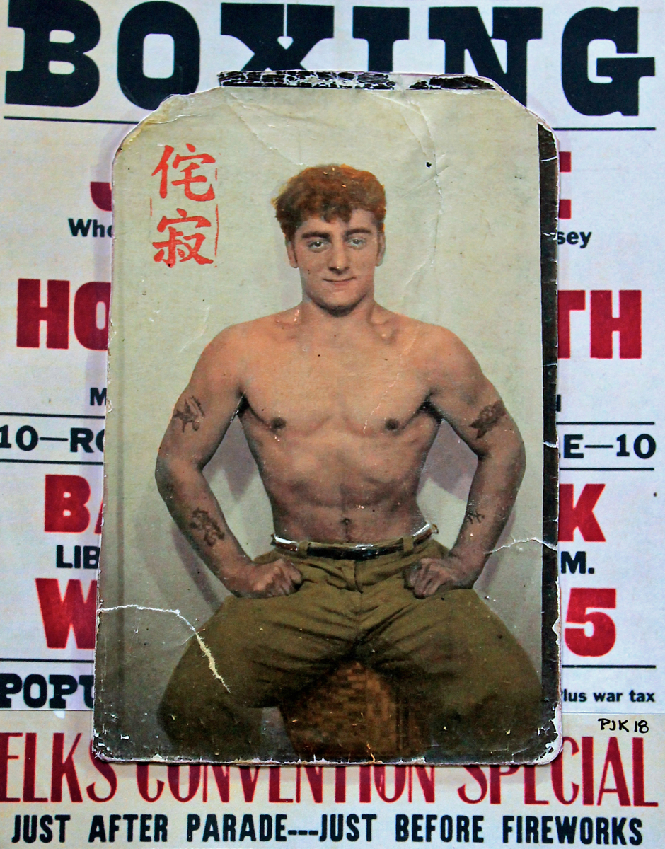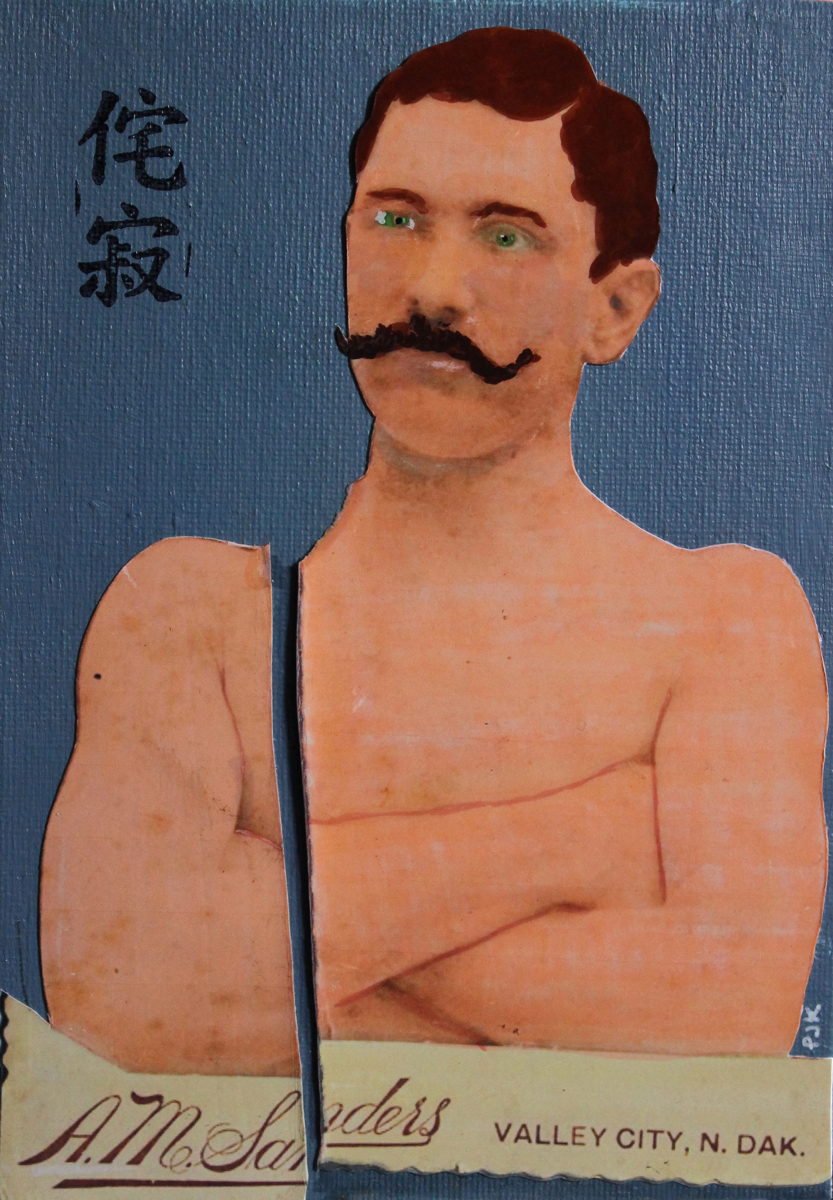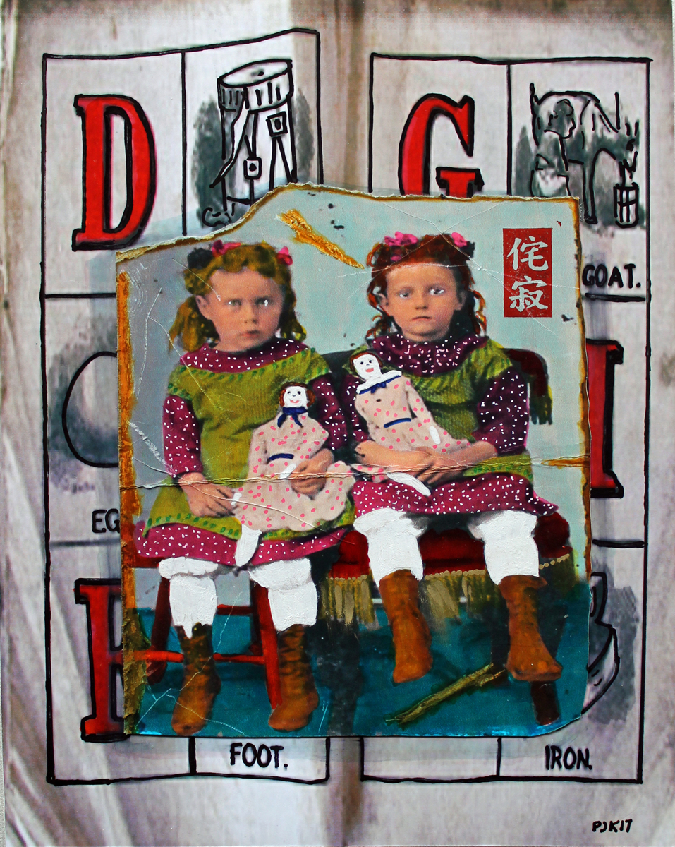 Everybody Likes Butch is a 7.5×5.5 work on paper. A b&w studio photo was blown up, cut out, hand-colored (prismacolor markers, paint pen) and mounted on a 1947 children’s book cover.