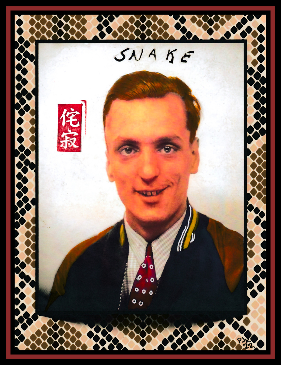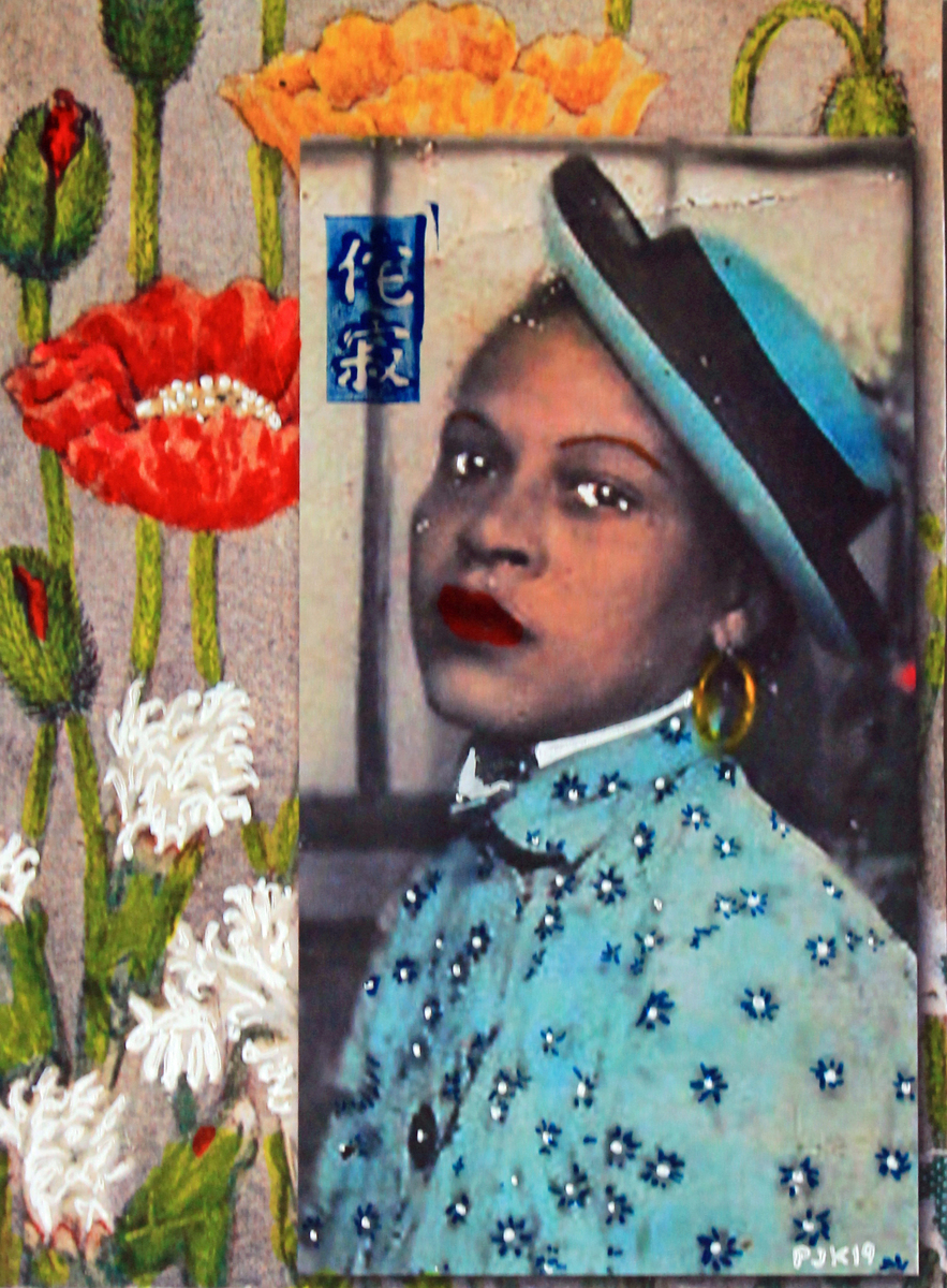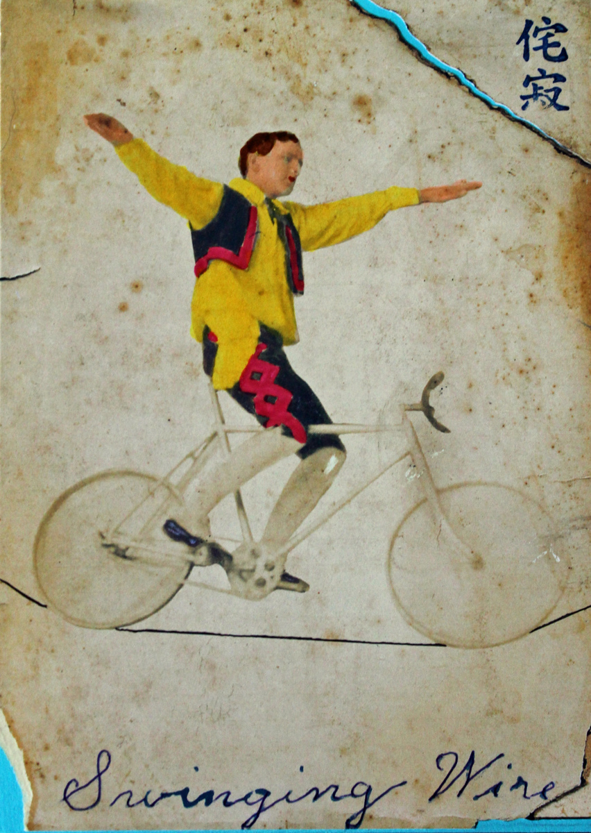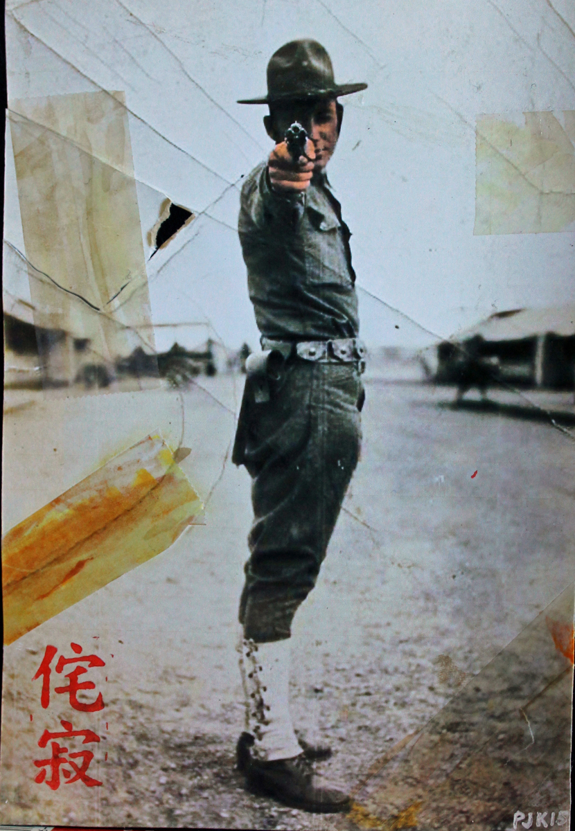Everybody Likes Butch is a 7.5×5.5 work on paper. A b&w studio photo was blown up, cut out, hand-colored (prismacolor markers, paint pen) and mounted on a 1947 children’s book cover.