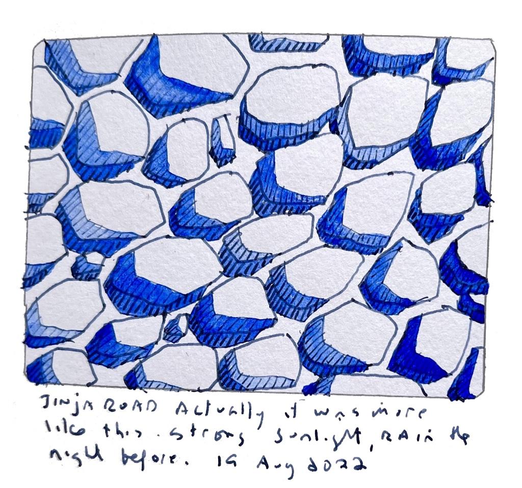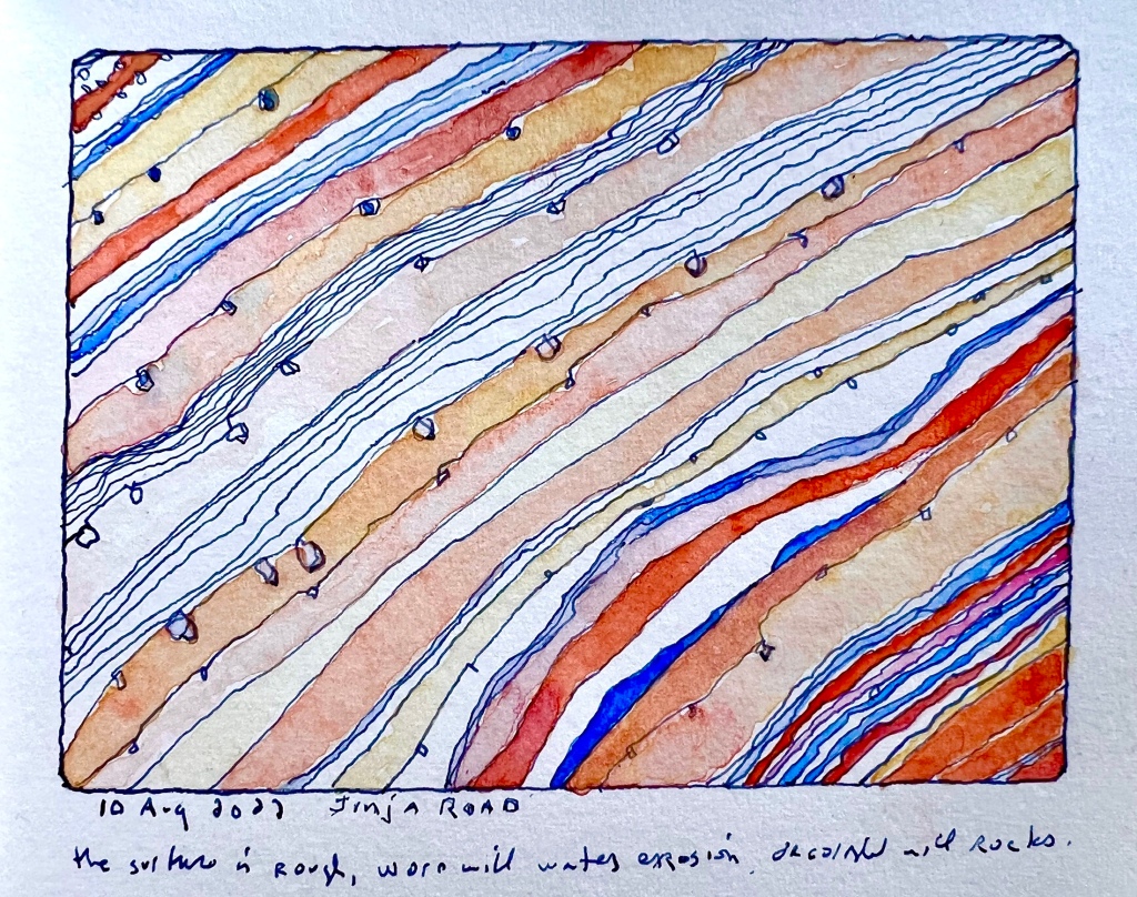Dirt roads + hills + rain = erosion. No pavement, and if so, poorly maintained, cracked and also eroded. Everywhere the surface was changing, crumbling to dust, washing away.
