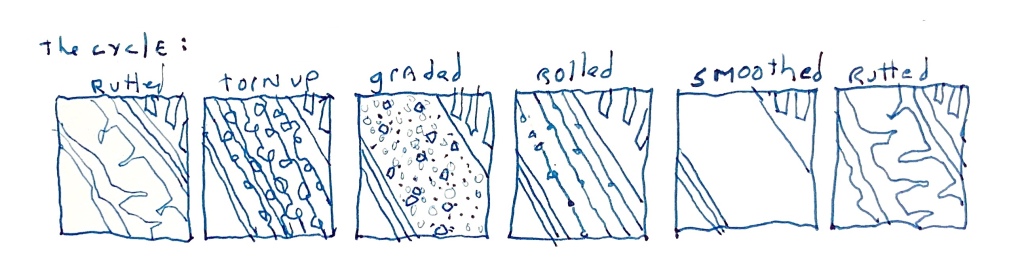 At some point the road was impassable. They would bring in large machines, the first had teeth that tore up the crust, the second machine graded the broken soil, the third machine rolled the surface flat. The road was now smooth for a short time until erosion started the cycle again.