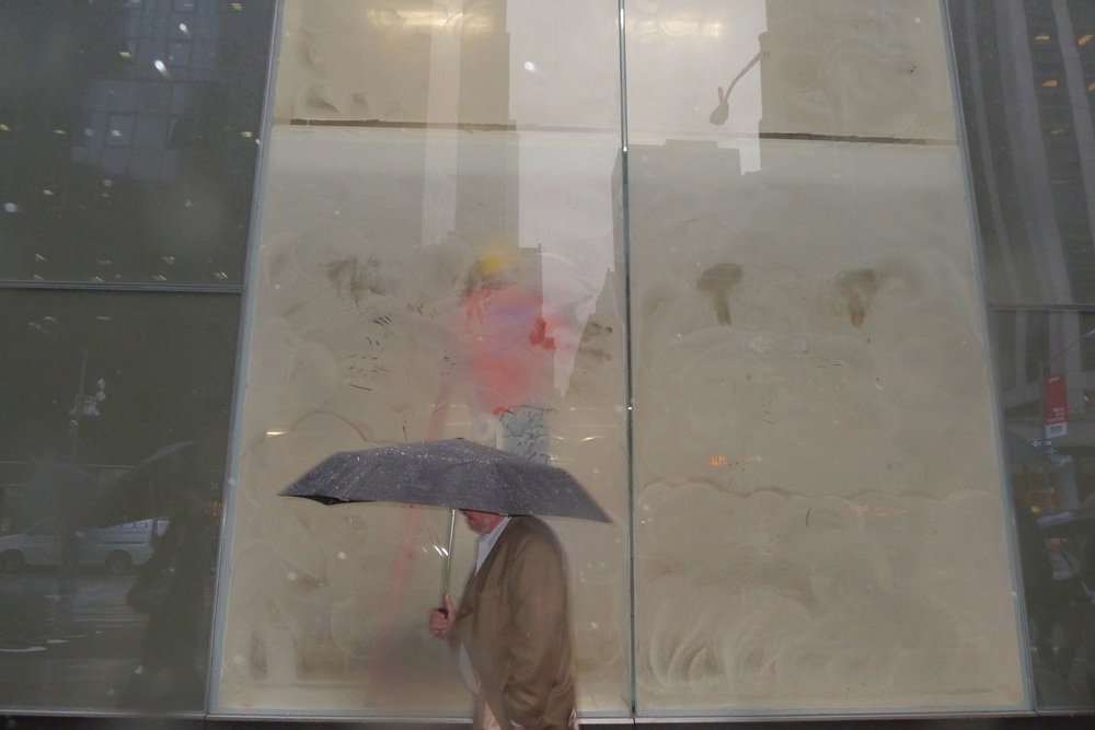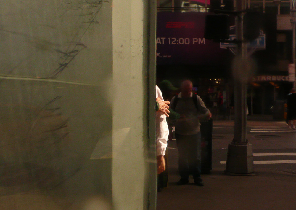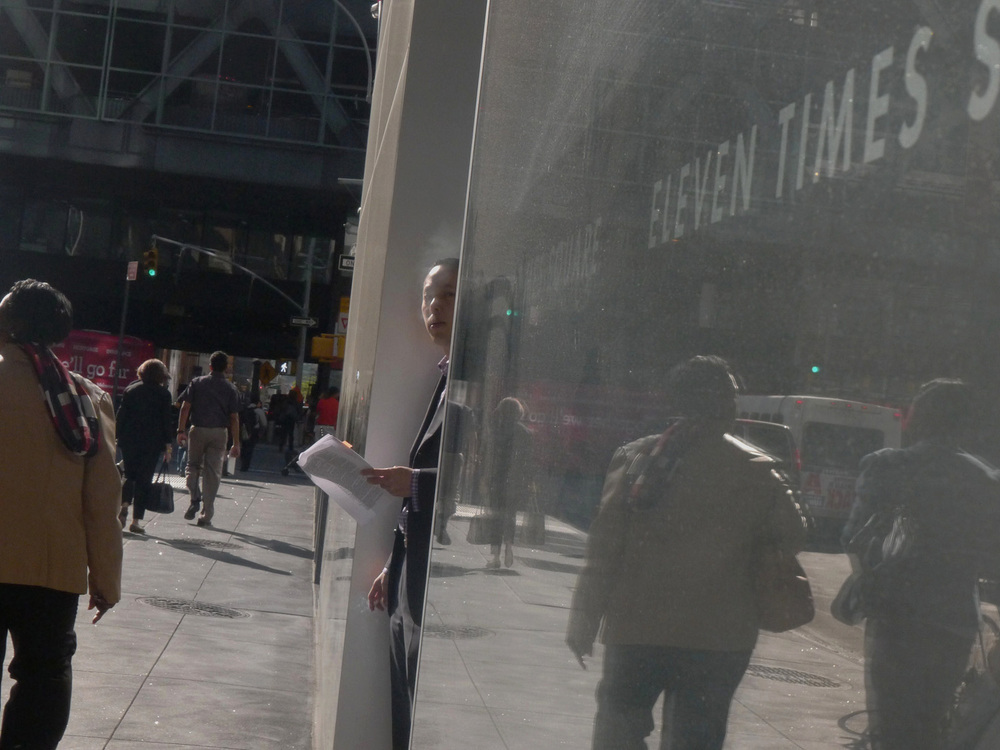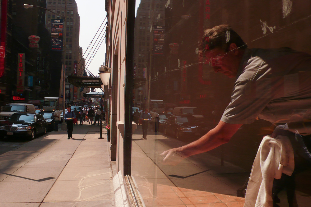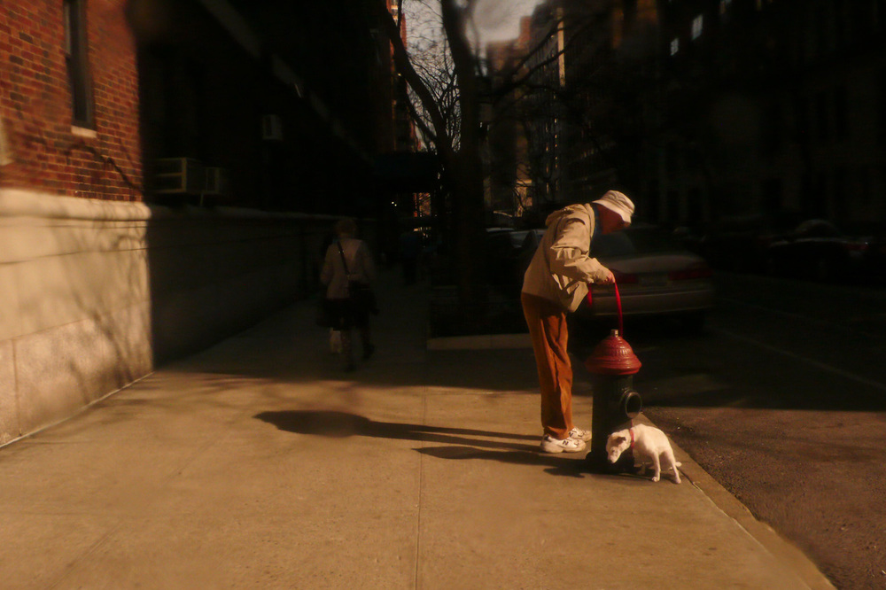 Similar question, but more about the actual focus of the images—about what is in focus and what is not. I’m reading Bernice Abbott’s introduction to The World of Atget, and her description of his vision of Paris reminded me of your vision of NYC. Many of Atget’s images have sort of ghostly creatures in them–I’ve always assumed it was because the long exposure didn’t allow for the movement of dogs or horses or people with no time to pose for a photograph. But in many of your photographs people are deliberately (and beautifully) out of focus, or seen in reflections, puddles, plastic wrap, or a blur of movement. I’m curious about your idea of capturing people and documenting the world that we live in.