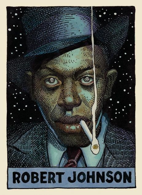 Robert Johnson, King of the Delta Blues. His story is so shadowy and full of myth, so full of beautiful, odd details that make him the legend that he is. He sold his soul to the devil; he learned to play guitar on dark nights in graveyards, aided by ghosts; he played facing the wall, away from the other musicians; he died young, in mysterious circumstances; he used a different name everywhere he traveled.