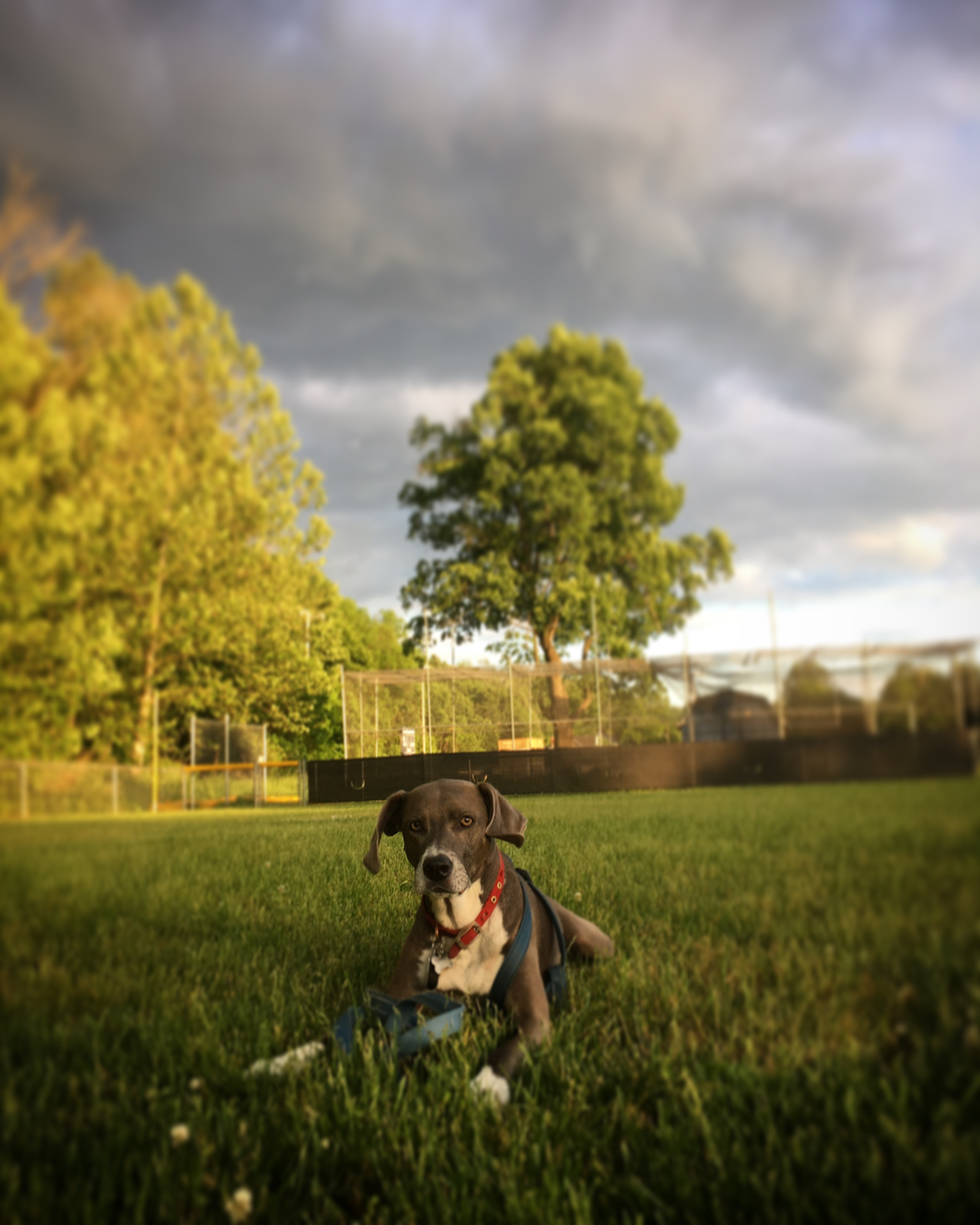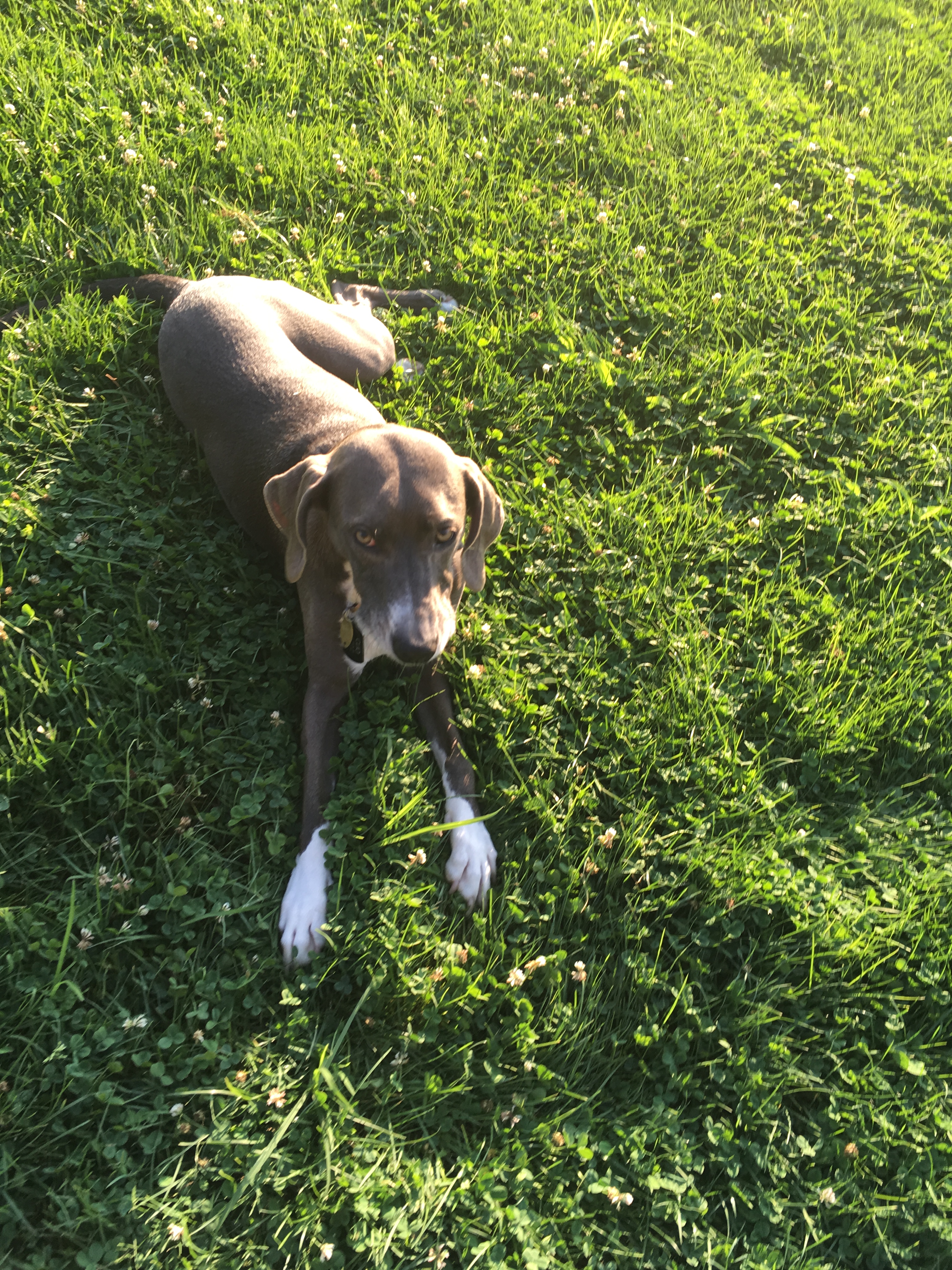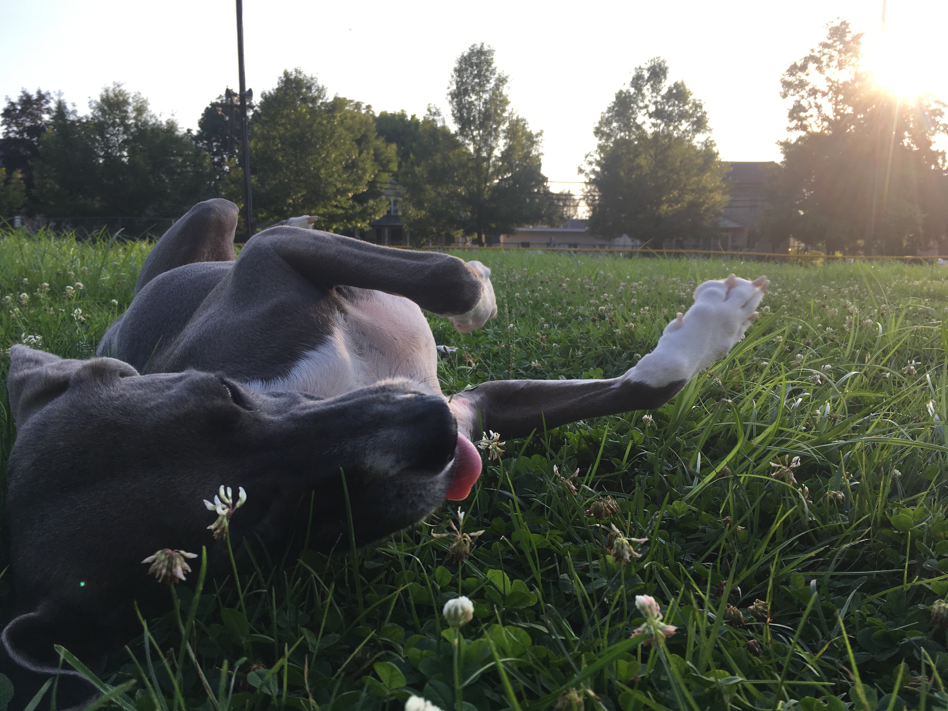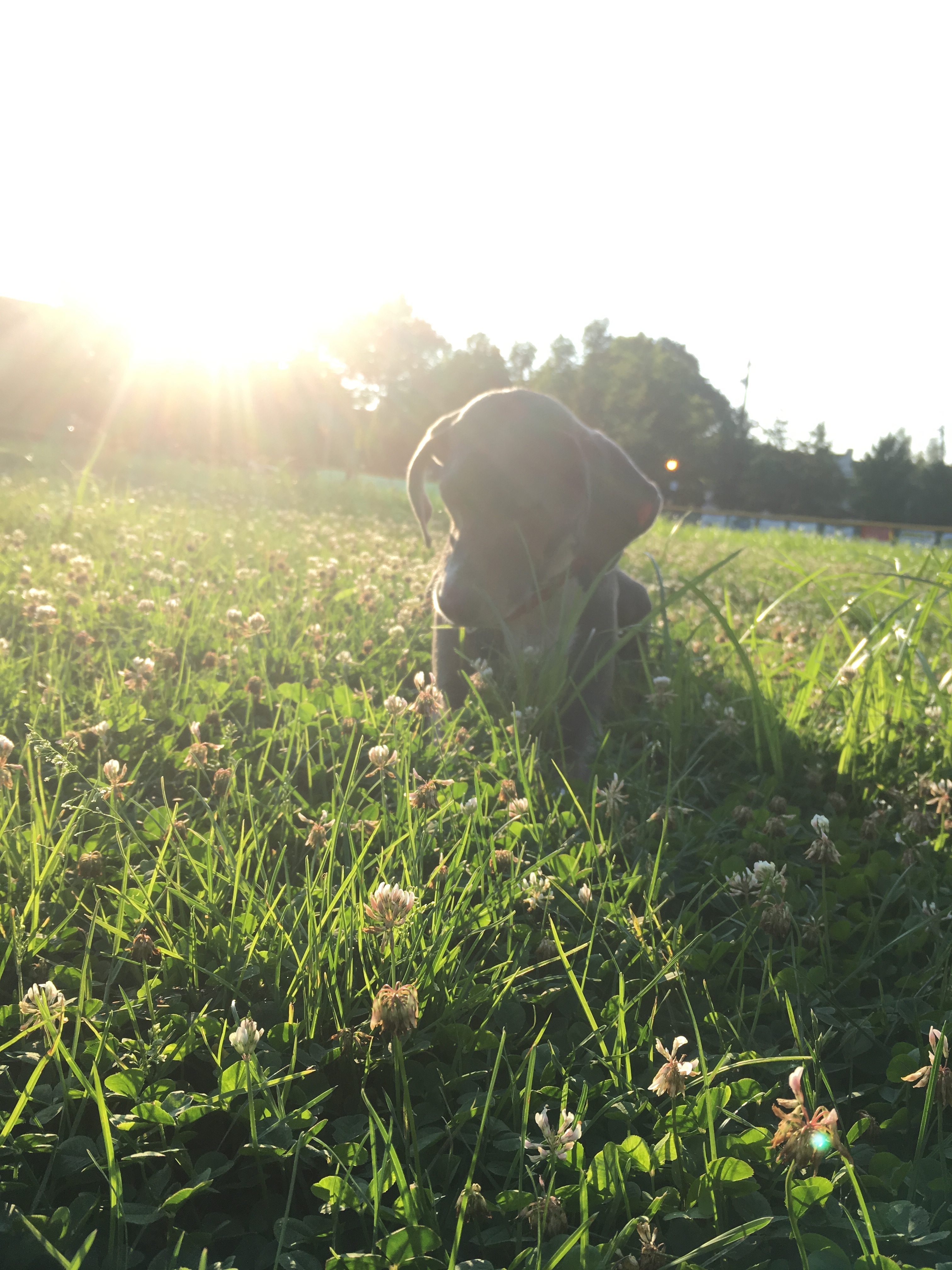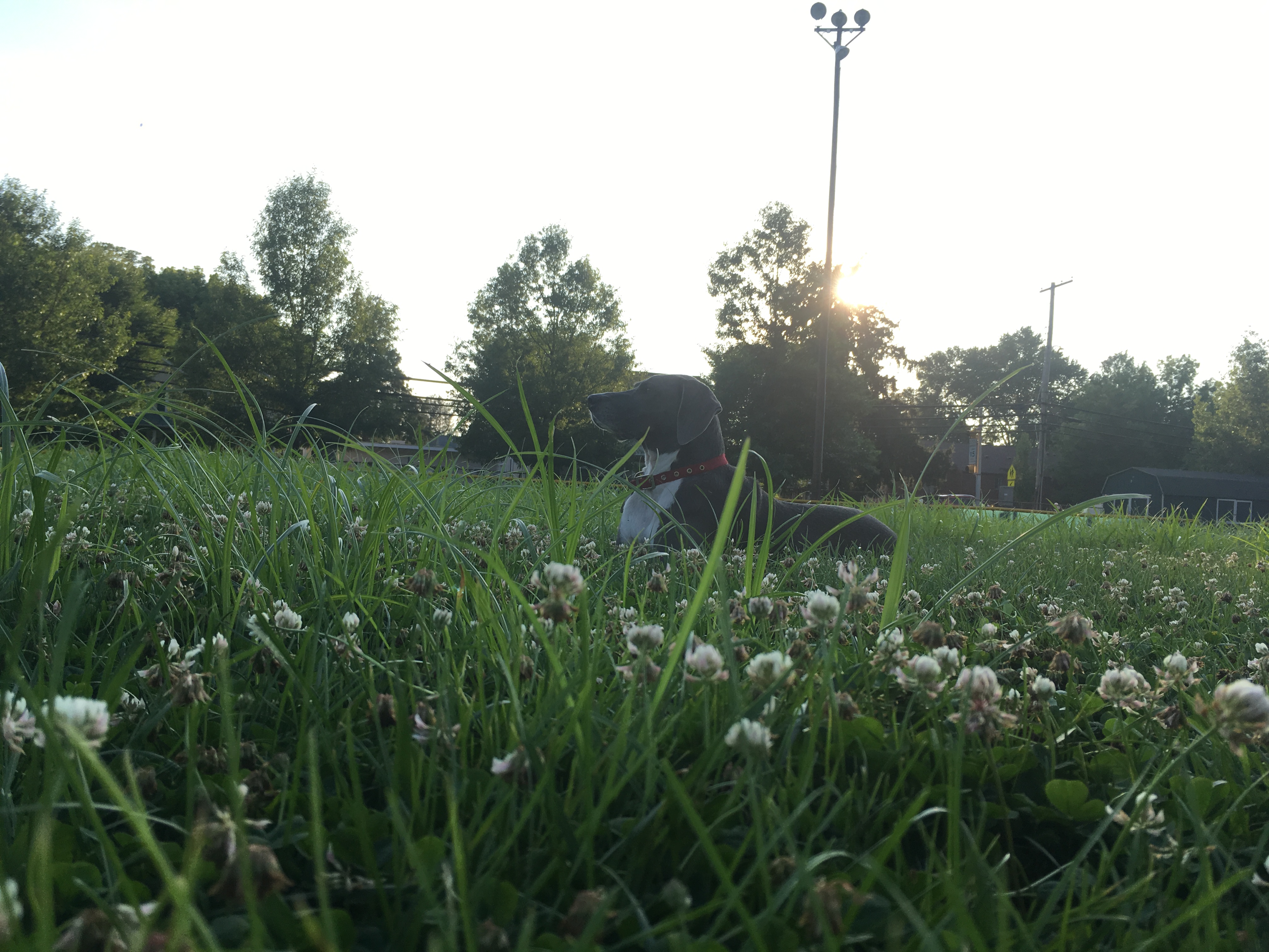 And then she stopped and rested in the rabbit grass, and looked up at me, all glowing eyes and clover-dew wet otter fur. She rested on her elbows and put her nose in the air, her ribs rising and falling and rising and falling with each deep breath as she tried to identify a dog moving along the far edge of the field, out of her sight but not out of mine. We’ll be gone by the time it reaches us, but she doesn’t care. And it occurred to me that there’s nowhere else I needed to be, nowhere more important than this place at this time, standing on a cool and warming June morning with Clio rolling in the clover. This is the first lesson.
