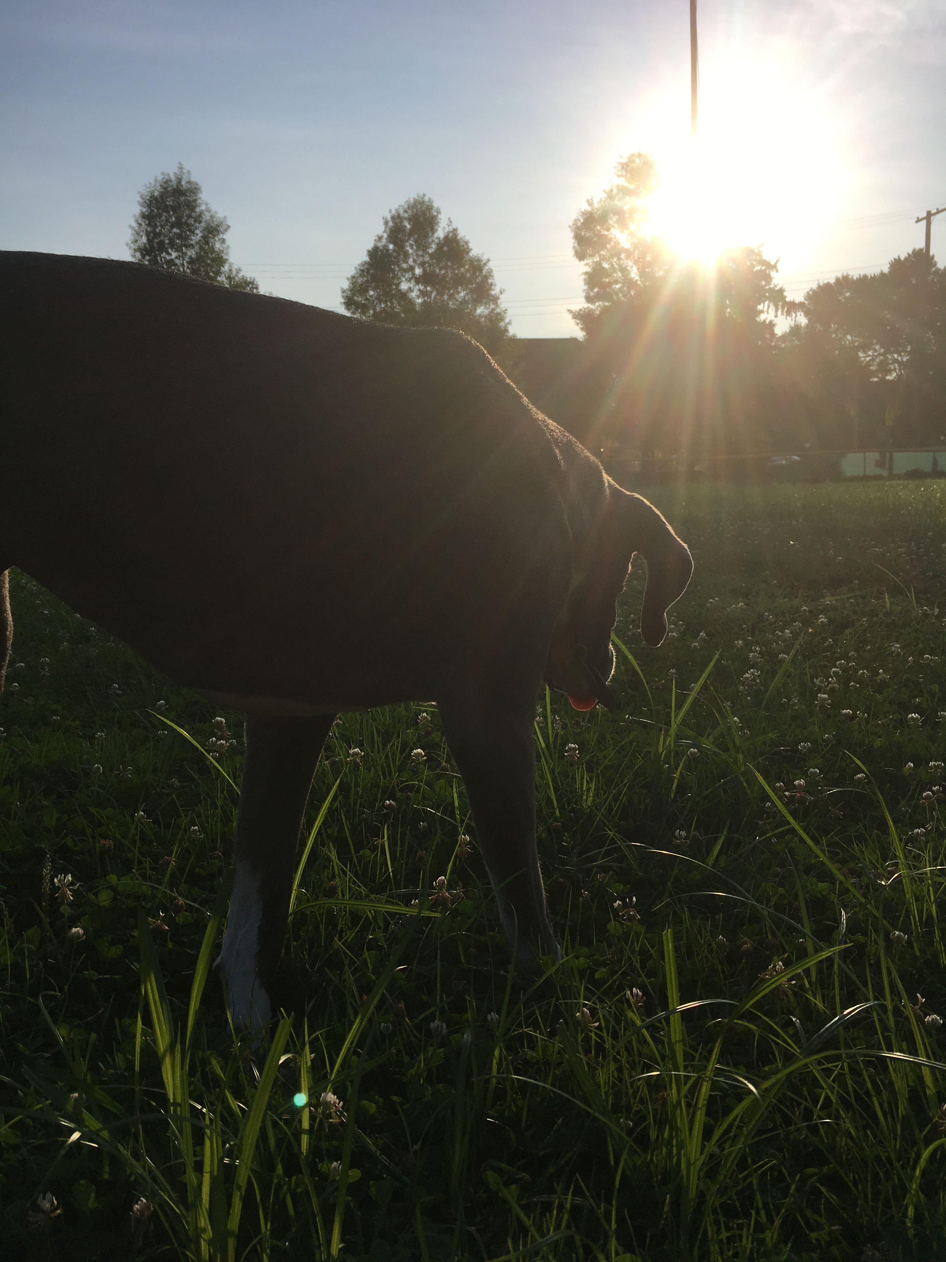 Coming home from the field at close of day we met a man with a loose limping stumble swagger walk. He said, “Why aren’t you running? You should be running? You’re always running.” I said, “Never in the evening only in the morning.” And I thought back to that very morning when Clio and I stood on the damp edges of the field, and she rolled in the clover, swimming through it, ecstatic. I stood holding her leash, and I was tethered as well to the haunting of the night past and the worries of the day to come. I thought about getting home, getting on with my day, because I am always running.