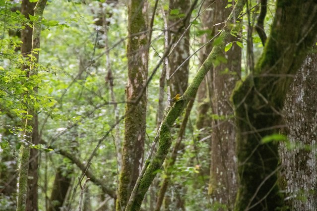 A few large, gorgeous wolf spiders worked their way through the leaf litter. I heard a repeated buzzy, high-pitched chirp on the same note and began scanning the lower canopy for prothonotary warblers, and there they were – several drops of lemony sunlight skimming through the leafy ends of tree branches.