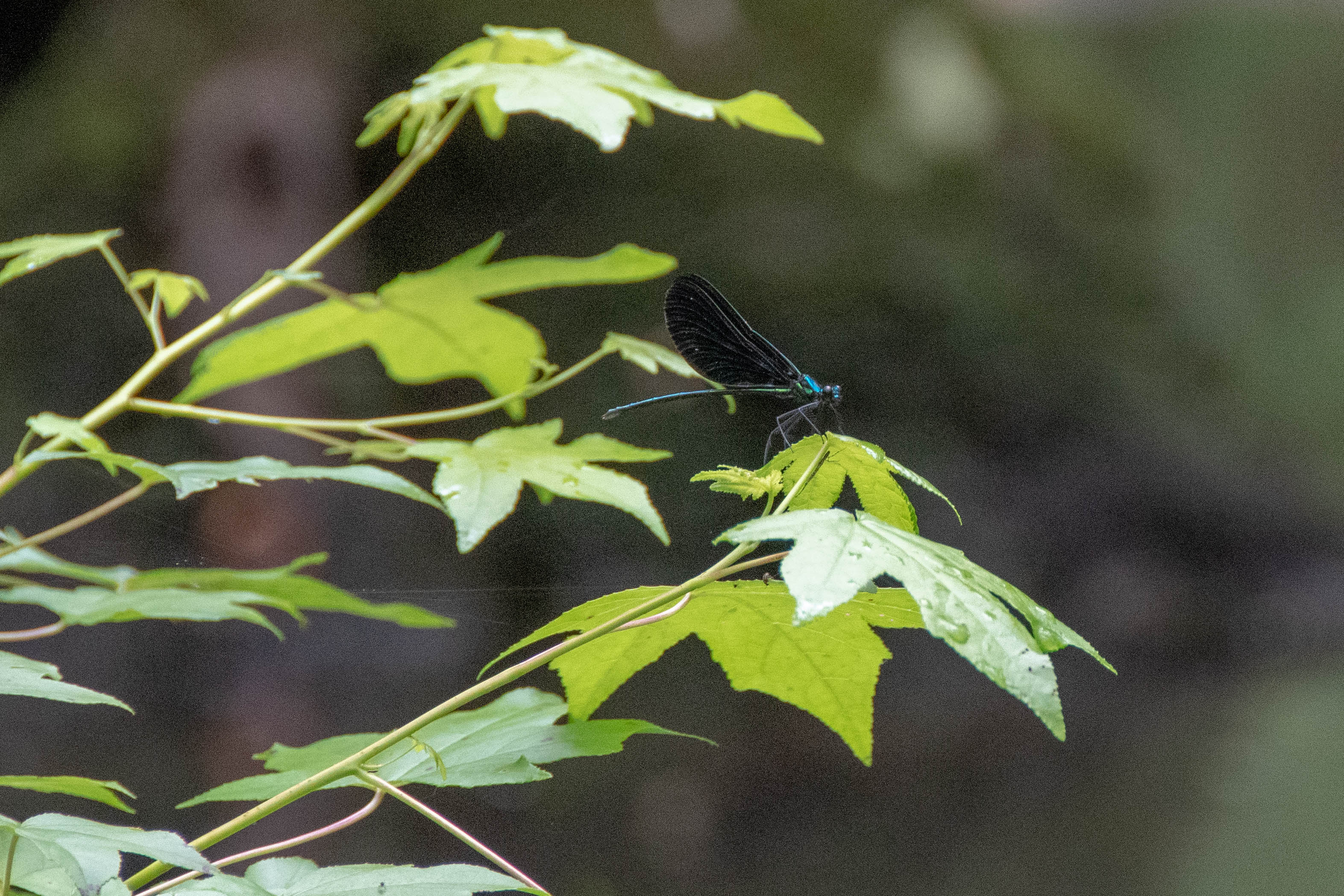 When K. joined us, we marched our gear and boats over several trips from the vehicles to the launch. K. and D. went to drop off K.’s car at the pull-out while I sat on the deck of a pirogue and waited. Ebony jewelwing damselflies were everywhere, their dark wings harmonizing with the wet bark of the trees and the dark of the forest floor, while their emerald bodies clashed with the dominant shade of the forest’s green and highlighted their presence. A few large, gorgeous wolf spiders worked their way through the leaf litter. I heard a repeated buzzy, high-pitched chirp on the same note and began scanning the lower canopy for prothonotary warblers, and there they were – several drops of lemony sunlight skimming through the leafy ends of tree branches.