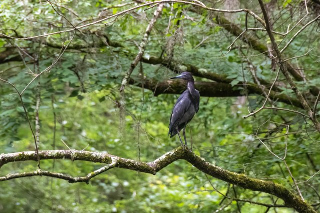 You will find, of course, all manner of waterfowl in a cypress swamp, from anhingas and cormorants to night herons and wood ducks. This trip, it was the little blue heron that we saw in relative abundance as they stalked their prey from thick branches and fallen logs near the water’s surface. These are a small heron, hence the name, in a rich purplish blue, once again the name. Their young are all white and look very much like those other white herons we call egrets. We may have seen some egrets on this paddle, but given the number of little blue herons we were encountering, I suspect it was the juvenile little blues who we were startling into flight before we even knew they were there.