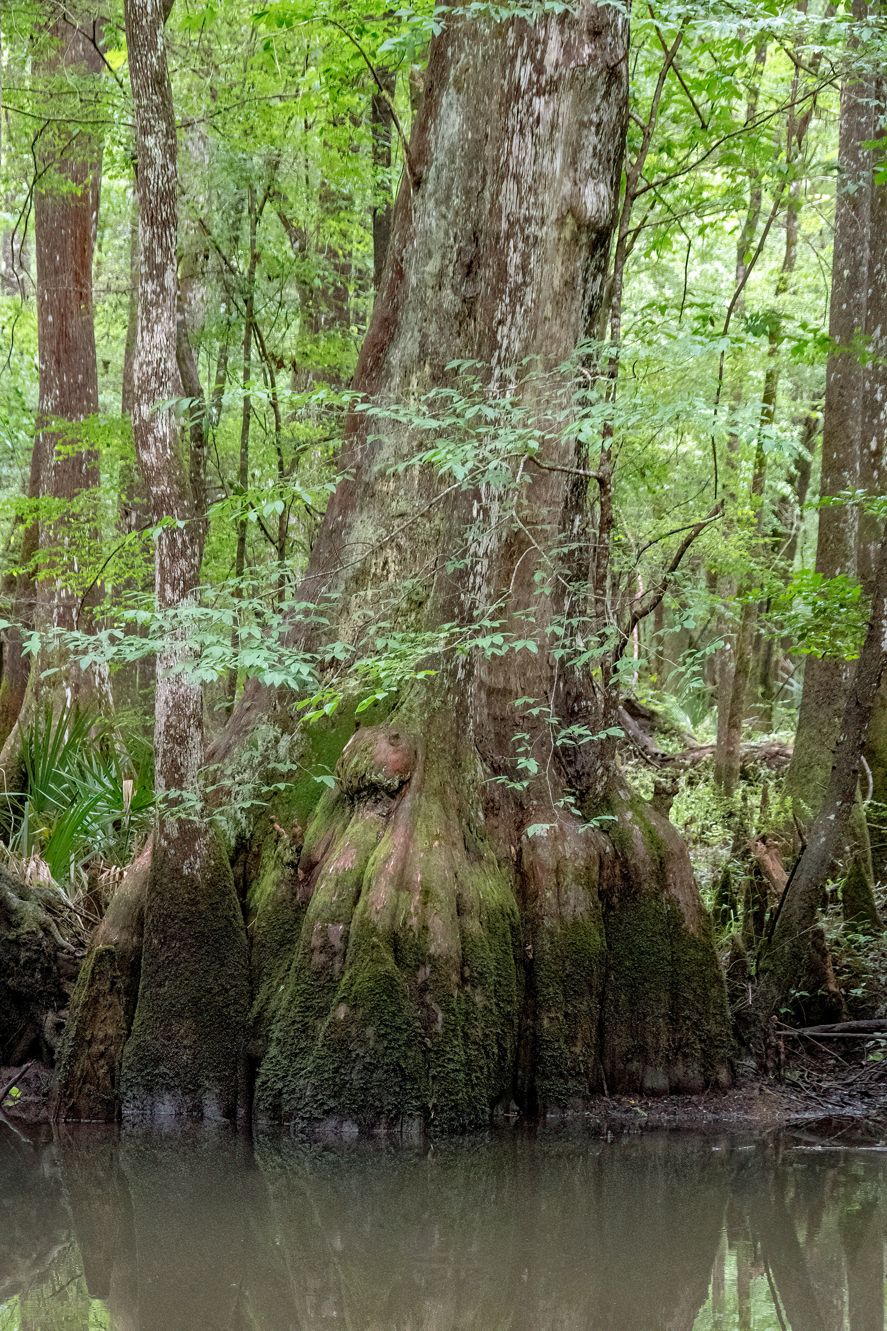 Water tupelos and bald cypresses are swamp trees by nature and share a common feature in the swollen, pyramid-shaped, and buttressed base of their trunks. The cypress distinguishes itself from the tupelo at the water level most significantly through the presence of its knees – knobby protuberances almost like flexed roots with thin peeling bark that surround the bases of the mature trees. Cypress knees are an immediate signifier of blackwater swamps, and an enduring mystery for botanists and dendrologists, who cannot tell us why they exist. The knees are an expression of verdant majesty for the swamp enjoyer, and a major pain in the ass for the paddler. Though no larger in diameter usually than your fist, if the knee rises in your path in a narrow stream of otherwise free water, it is an immovable obstacle to your boat.