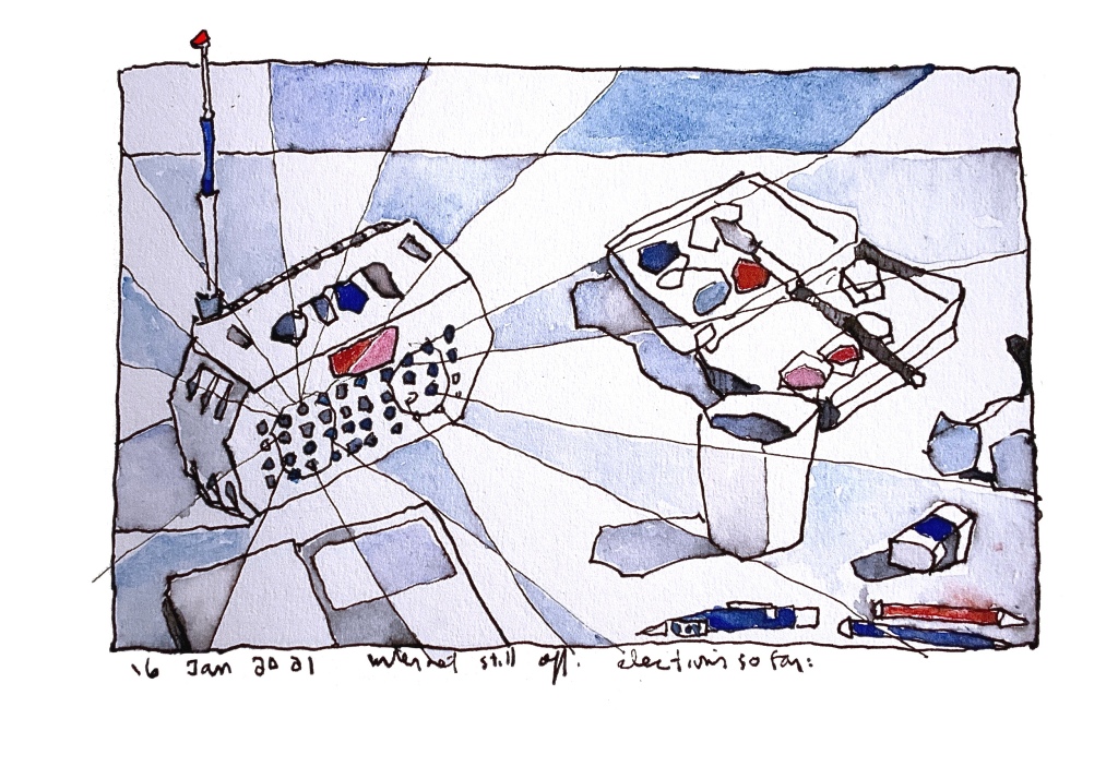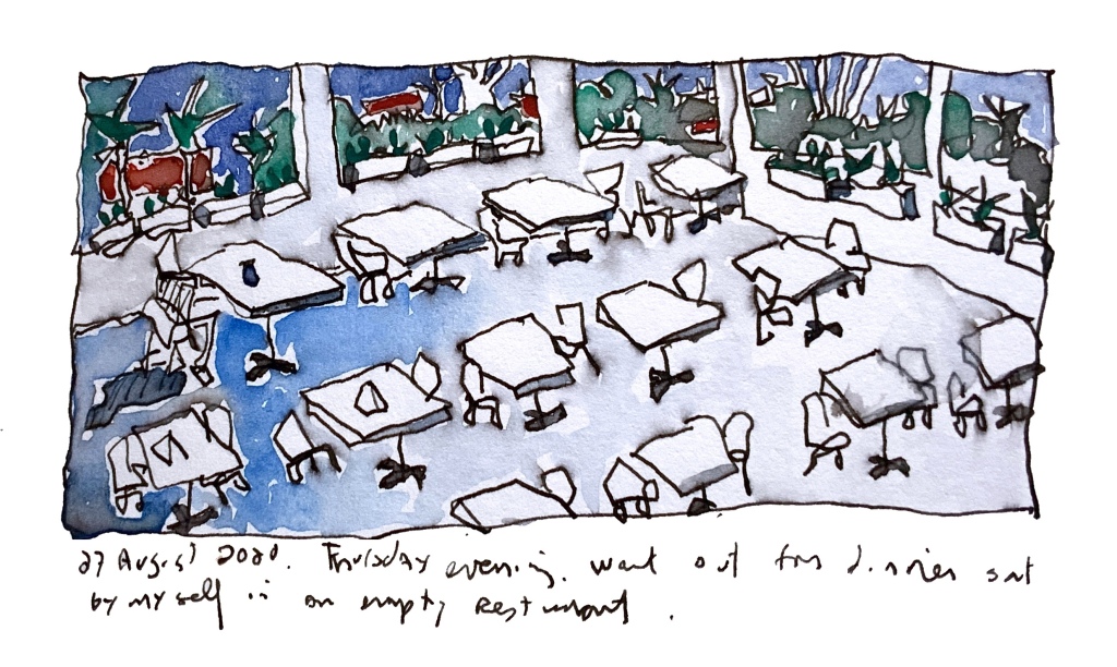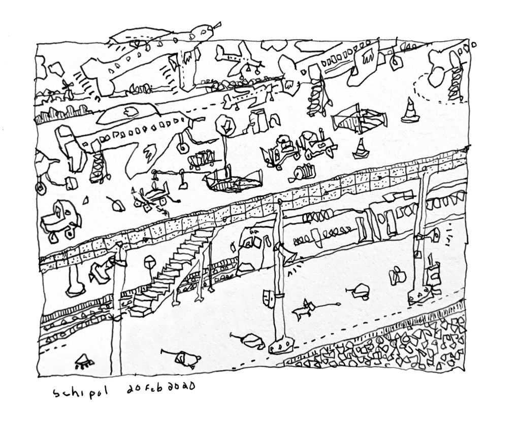 I was there alone from the end of February 2020. This drawing was from Schipol Airport on my last flight before the borders closed. The pandemic was just starting but people were afraid of travel and the airport was nearly empty. People were still concerned and careful.