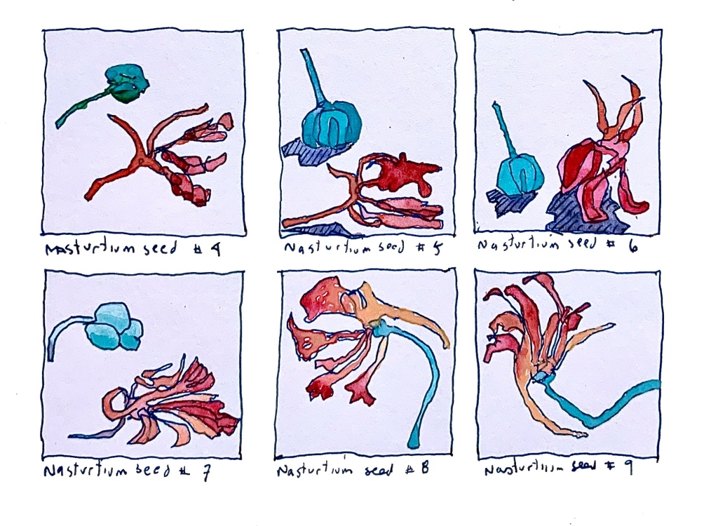 Outside of work I tried to stay busy, growing nasturtiums, marigolds and bamboo to draw. That was pleasant. There were no real seasons here, just wet mornings and maybe not-so-wet mornings, it was almost always sunny in the afternoon. The marigolds, nasturtiums and bamboo thrived. Zinnias didn’t do very well, they all succumbed to some kind of mildew, plus my seeds all came up with wretched pink blossoms so I gave up on zinnias. These are second or third generation seeds and I had carefully culled all the pink flowers in the previous generations but the zinnia color genetics are complex.