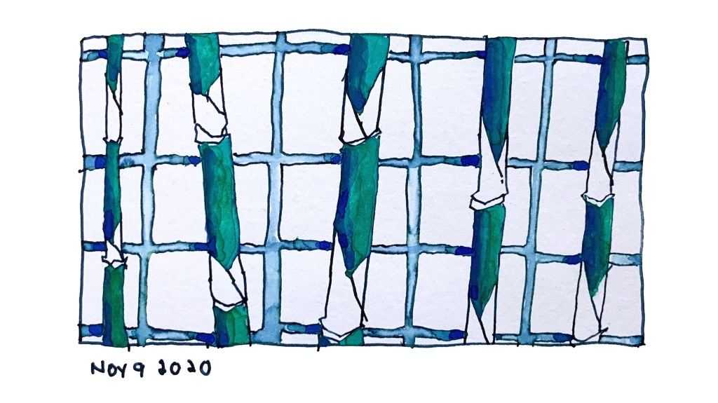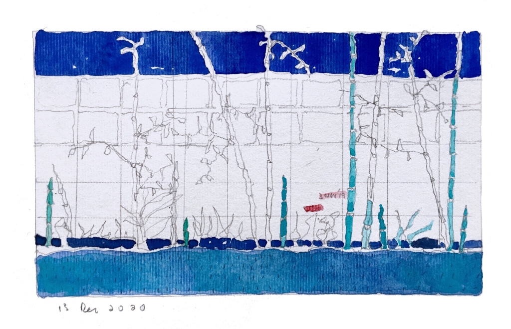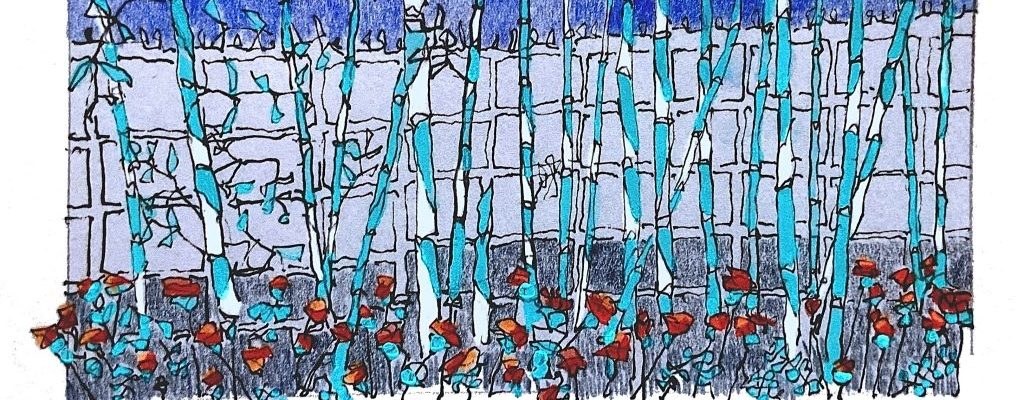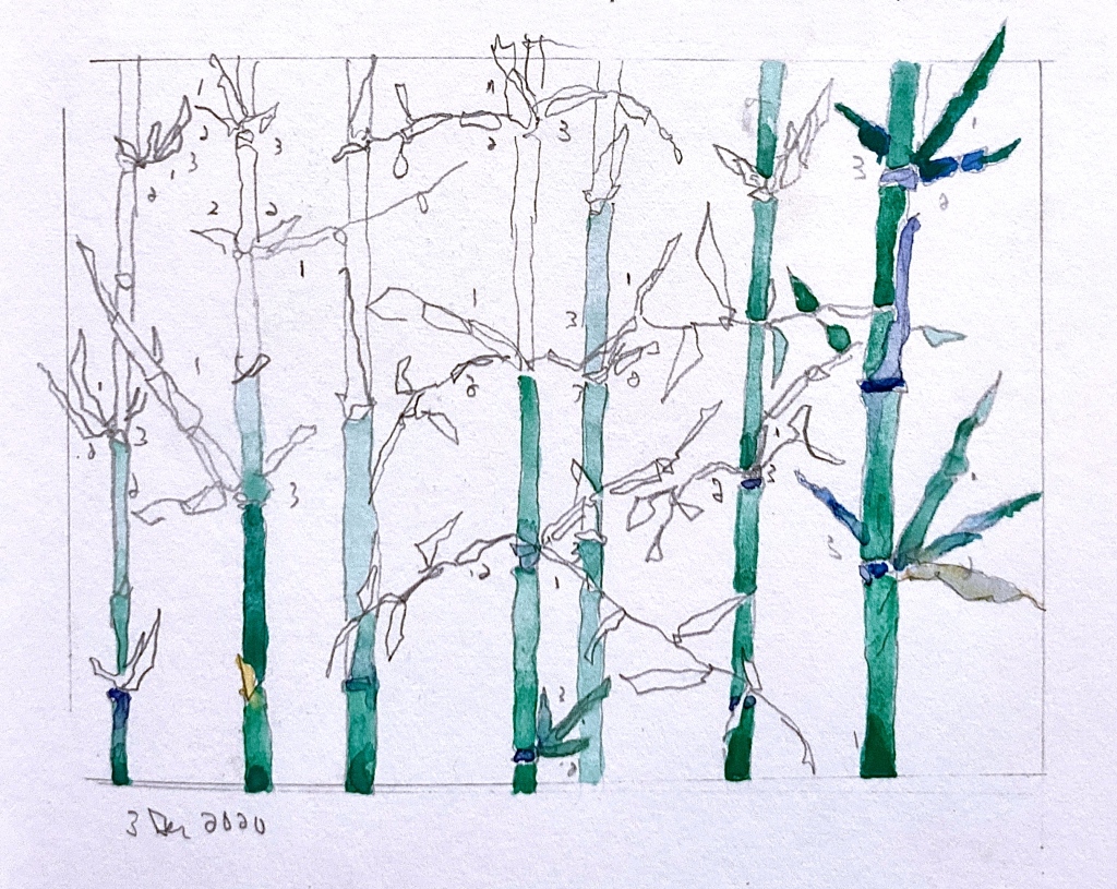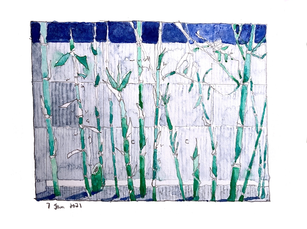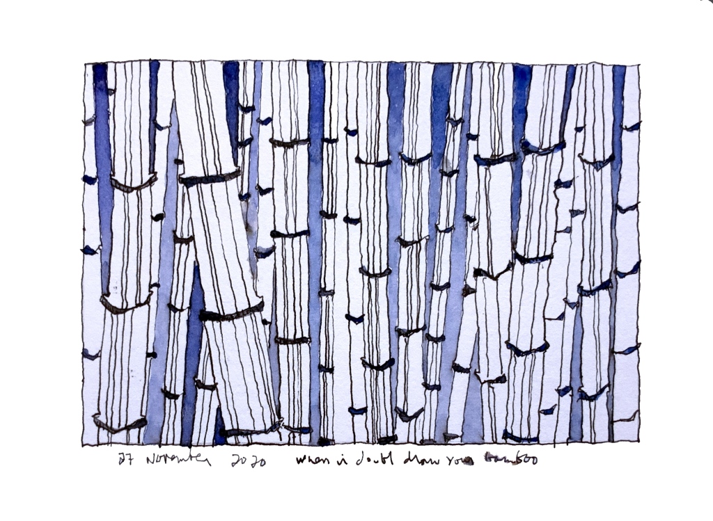 Just before the virus started to spread, we planted 10 bamboo plants. The plants stayed quiet for some months but then started to grow in earnest and for some reason they were very calming to draw. Simple shapes, easy leaf patterns to remember, lovely rich greens. Here are some of my bamboo drawings, of no big importance, fairly useless except as evidence of survival through those awkward times.