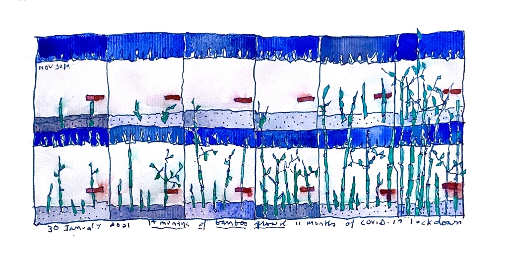 Here was 14 months of bamboo growth, 11 months of COVID lockdown. I had painted a mark on the wall when I first planted the bamboo. The mark has faded and is almost hidden by the bamboo.