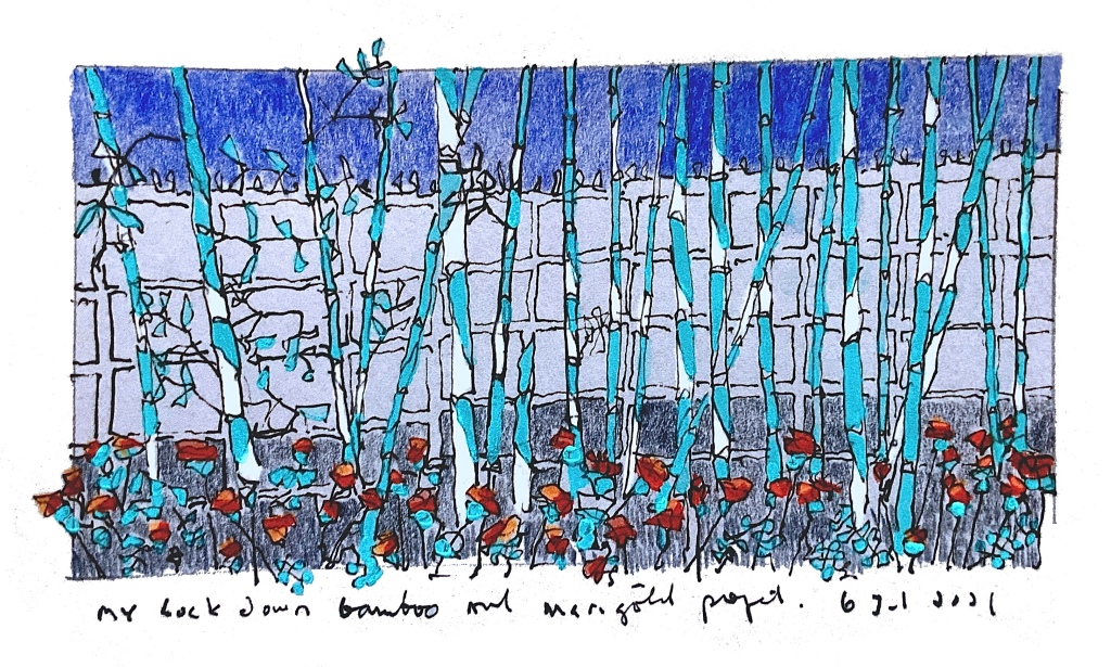 Some months later, after a second lockdown was imposed, the bamboo had grown. It was now much taller than the wall and the bamboo was attracting small birds and providing shade. I had only planted a few marigolds and they spread. This was my last bamboo drawing, gouache and white pencil on grey paper.