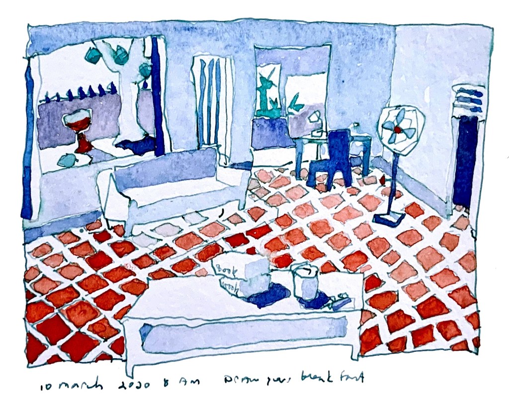 My living room. I spend a lot of time there during lockdown. I could only go to the lab for essential work, all the analysis was done at home. People were ignoring the masking, travel and social distancing rules so it was safer to work from home. There was a nice view of the garden and bamboo. Lovely red brick floors. In the garden there was a bird bath I had made by a local potter, ibises came daily and splashed about with lots of commotion. It was like living next to a children’s wading pool. Woodland kingfishers came often and dove into the water like kingfishers do.