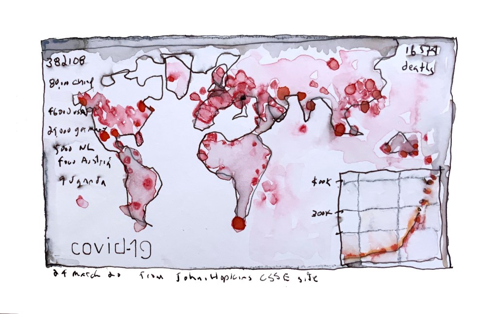 A Johns Hopkins team set up a very useful website to track COVID-19-reported cases. Here is a drawing of the webpage when there were less than 40,000 cases globally. I had planned to draw this page regularly, maybe weekly to track the epidemic but soon the entire map turned entirely red. The virus was everywhere.