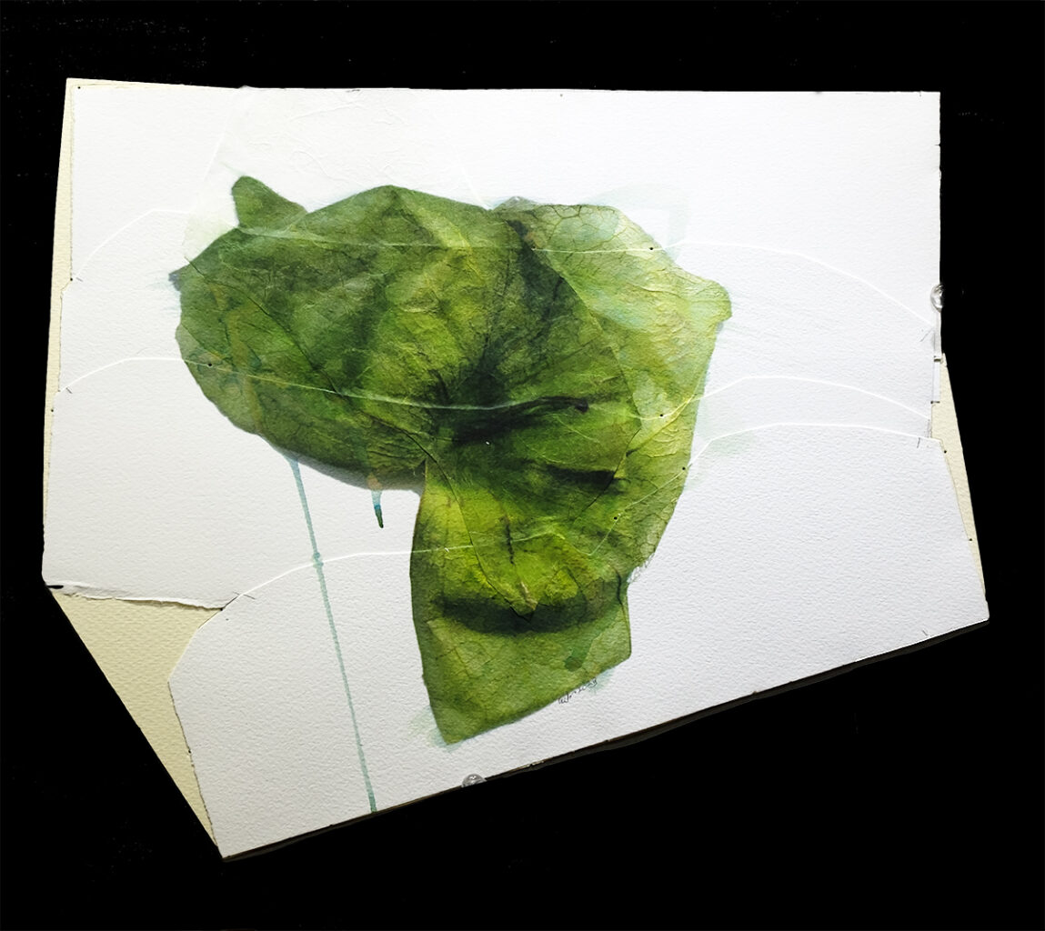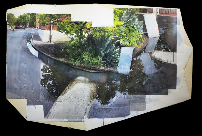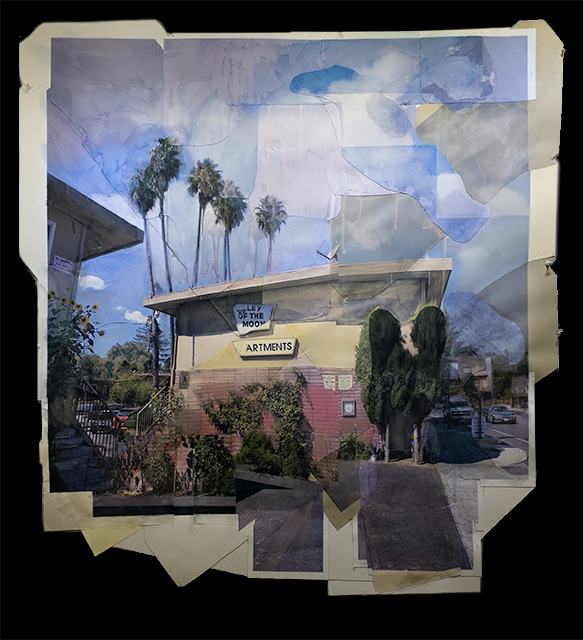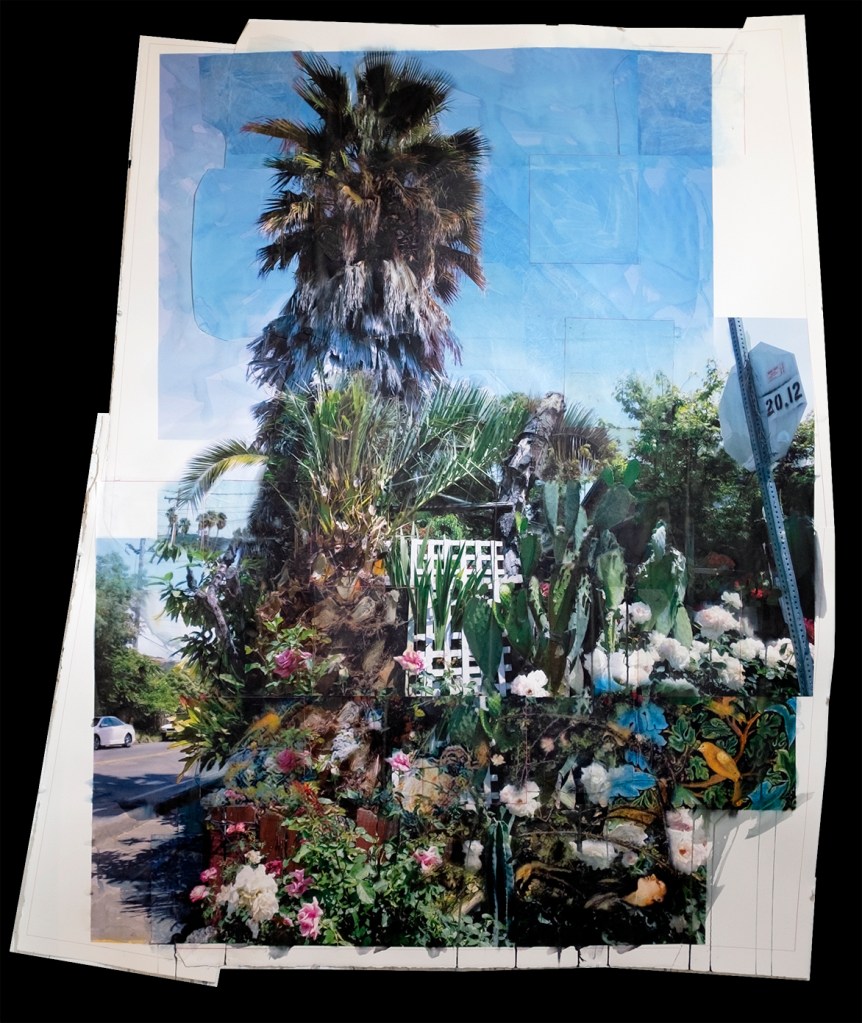 I compose in Photoshop, combining hybrid views from many angles. Then I print out onto watercolor paper, and other papers, and collage in the real world. Next, I paint over them and reprint and re-collage so the surface becomes very rich. I always maintain the original composition, but the layer-on-layer effect I achieve becomes really interesting to look at. You can get kind of lost in the surface, and then your eye pulls back to the overall image. That is the oscillation I’m going for.