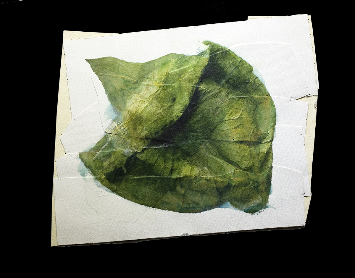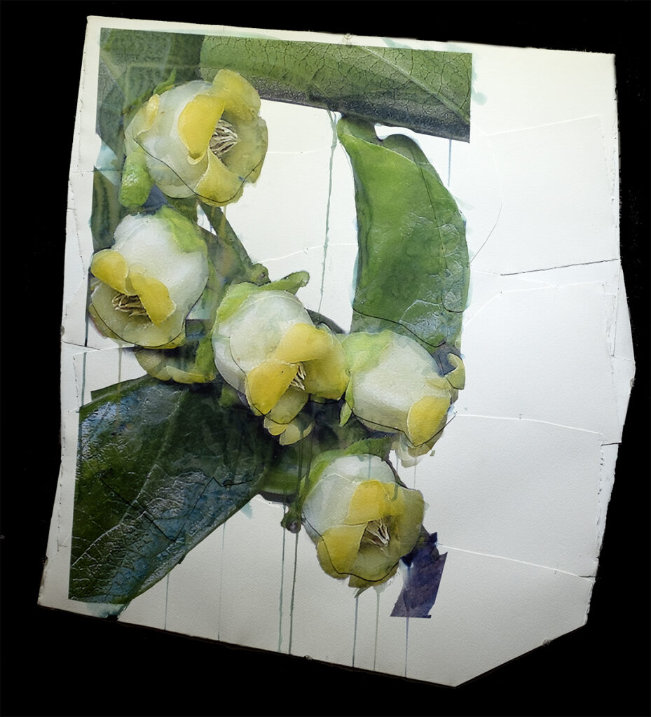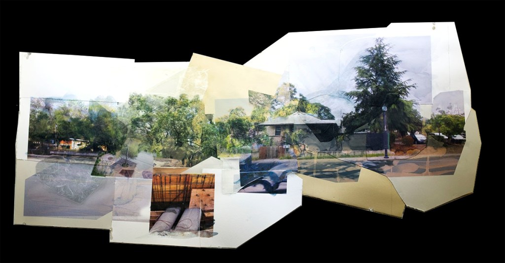 Technical Note: These pieces start with many photographs, taken from different angles, possibly at different times of day or year. I compose in Photoshop, then “cut” the composition into printable sizes and shapes (I never use 8.5×11 paper). I then print onto watercolor paper, possibly other papers, and physically collage. The next step is painting. Then, if the mood strikes me, I will print portions of the composition again and physically collage again. I’m not above altering the size and color balance of any part of the scene that seems to need it.