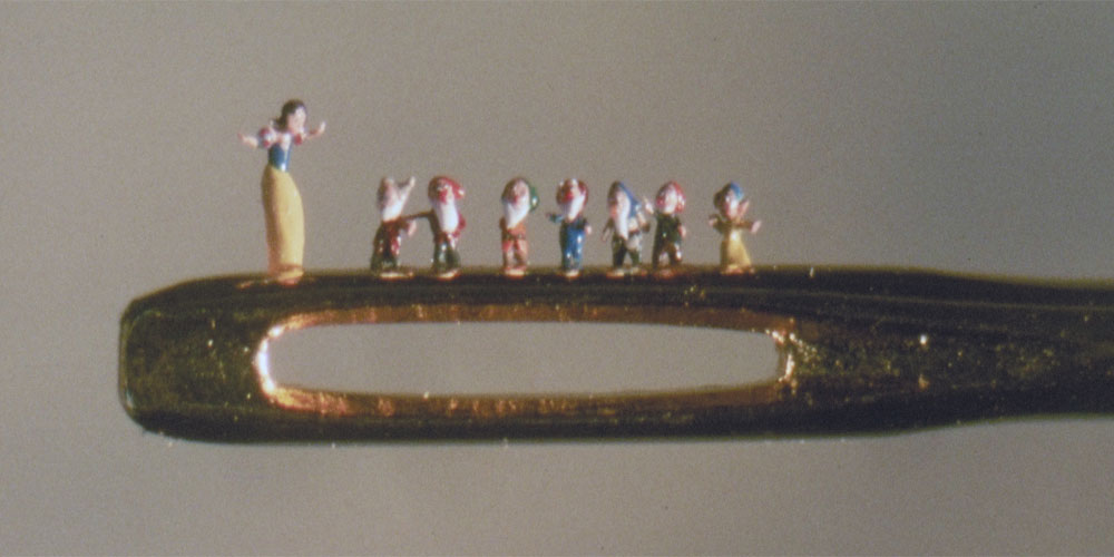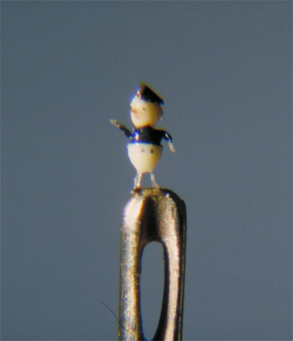 Born of obsessive devotion, an individual figure could take as many as fourteen months to finish. Each sculpted micron represented not only endless hours of toil, but exacting travail fraught with peril, as his work could so easily be destroyed or lost. An unexpected sneeze or misdirected breath could blow away a microminiature with hurricane force, while a casual movement could sabotage the work of months. Since even a pulse in his fingers could cause an accident, Sandaldjian ultimately learned to apply his decisive strokes only between heartbeats.
