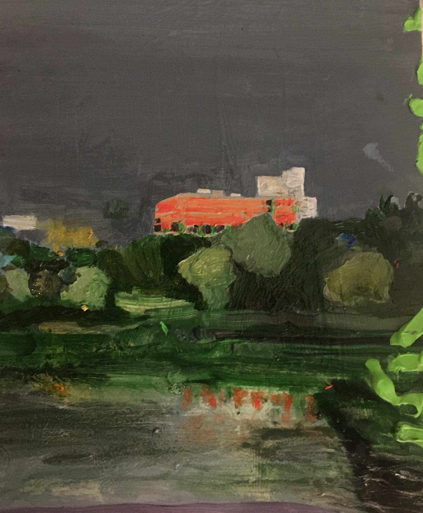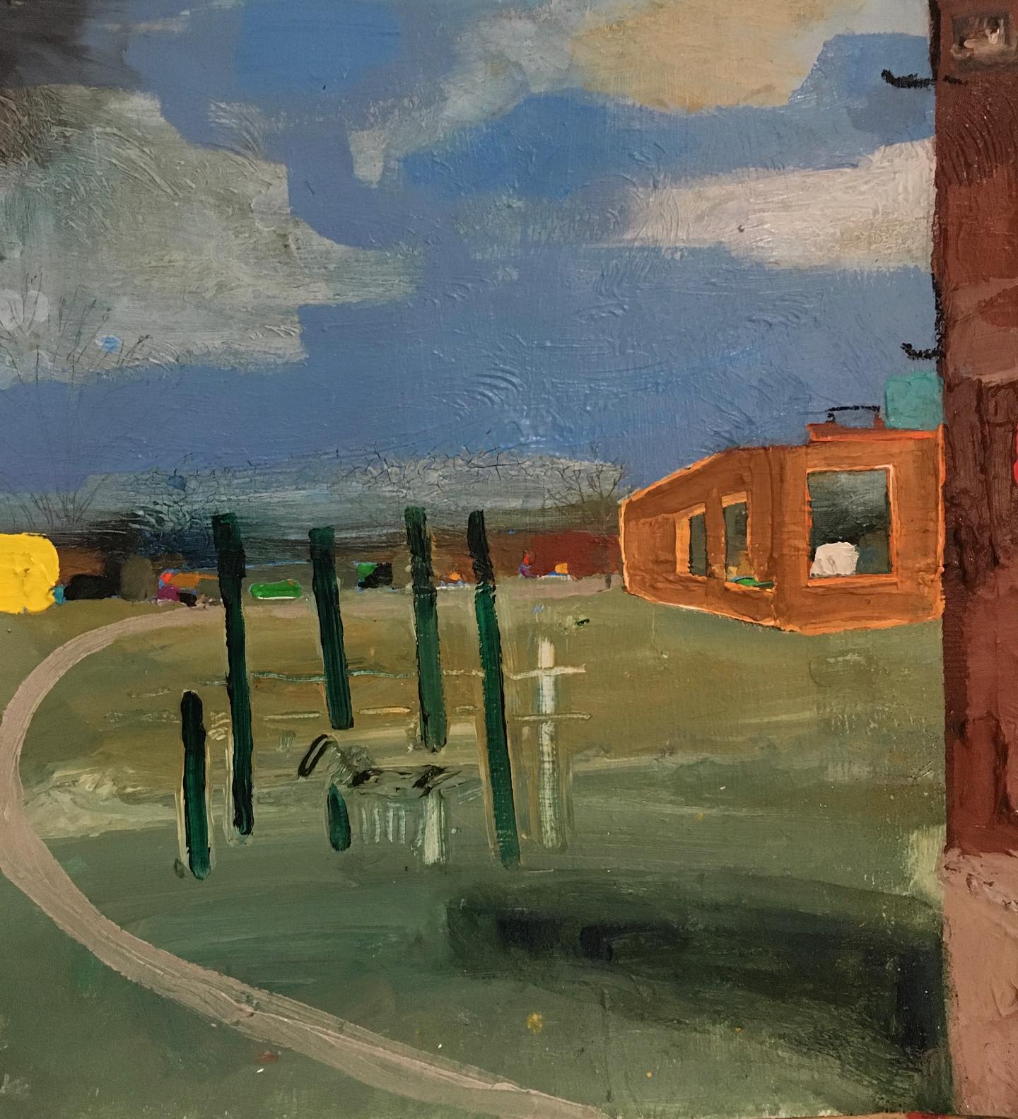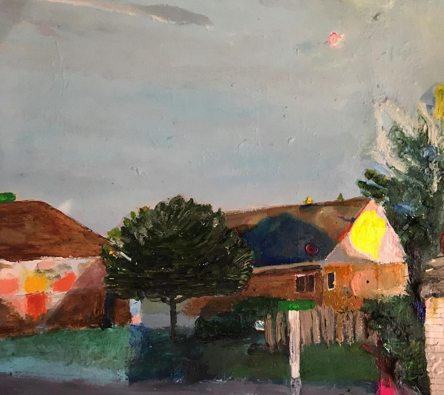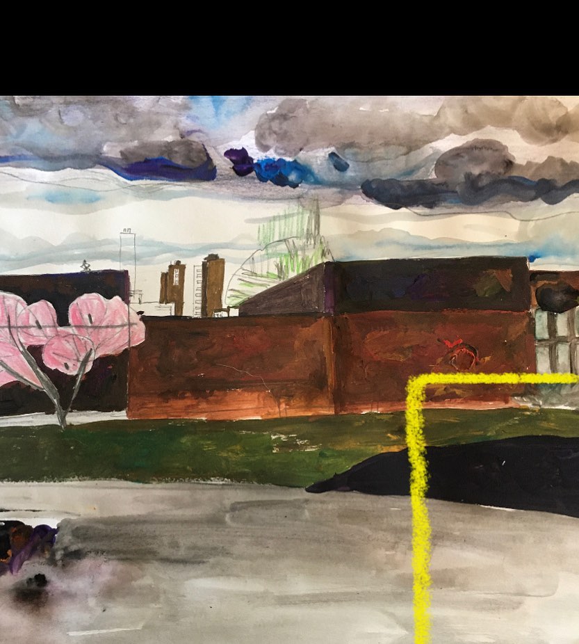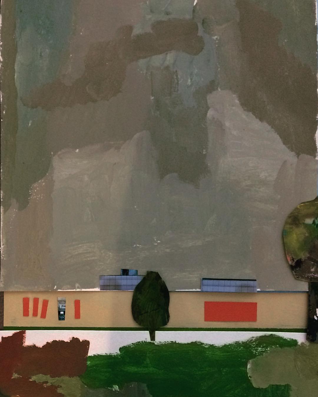 I thought about this work often. It seemed like everything I love in art encapsulated, but in such a beautifully messy though perfectly measured way. Such strange perfect honesty. How does she capture the expressive gestures of inanimate objects — buildings and underpasses — let alone the ever-moving clouds and the ever-shifting light? How does she capture time passing and such specific memories of a moment and place and slant of light? With an absurd and compassionate humor and a depth of melancholy, she achieves a balance of dark and light — in all of the meanings of the words. It’s the edge between everything that sets the shapes and colors humming. Light and shadow, belonging and loneliness, buoyancy and weightiness. Expanses of space, darkness, or blacktop, punctuated by the small clusters of the overlooked buildings in which we spend most of our lives, growing and learning and passing our days. Passing our days.
