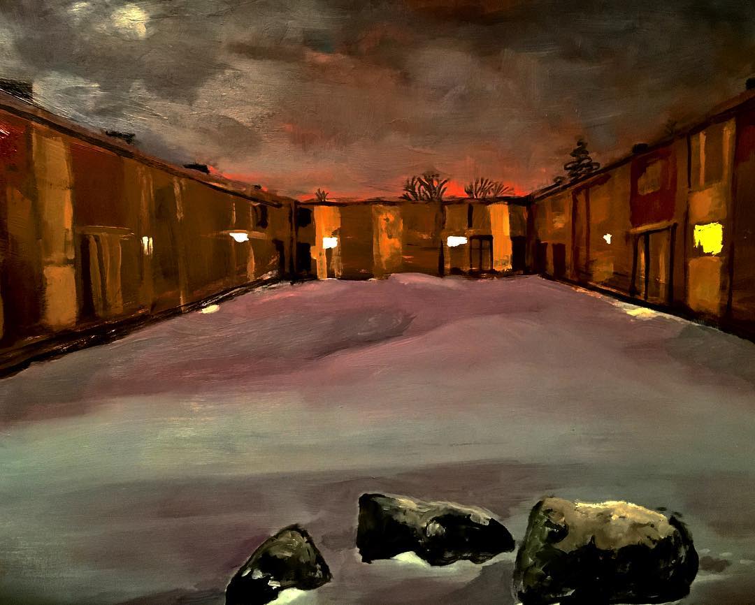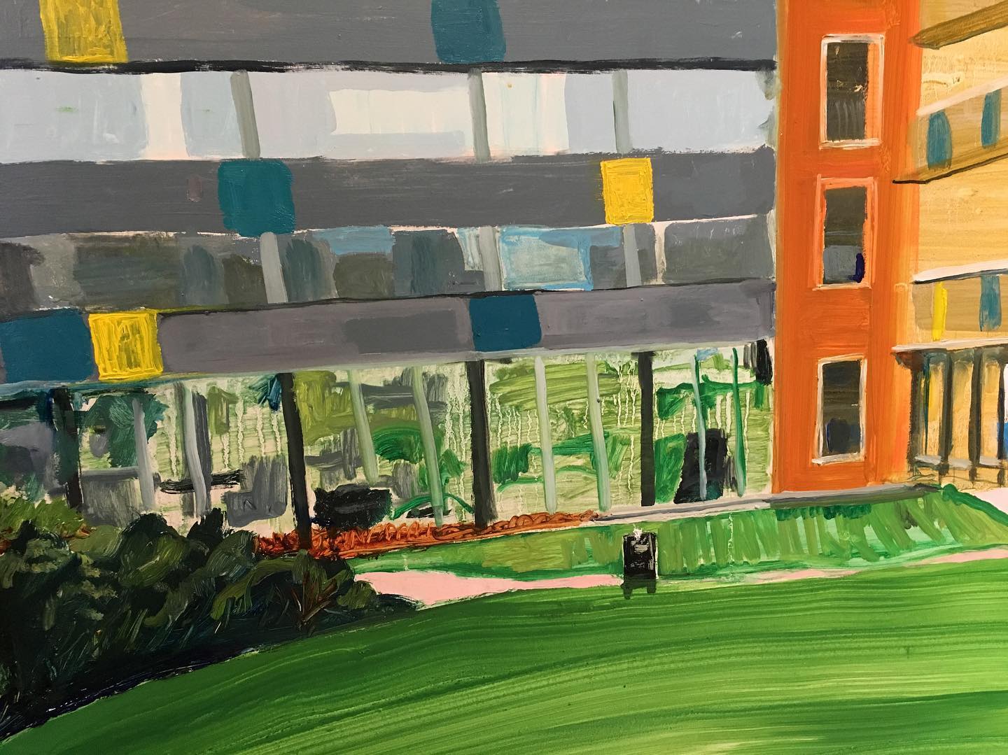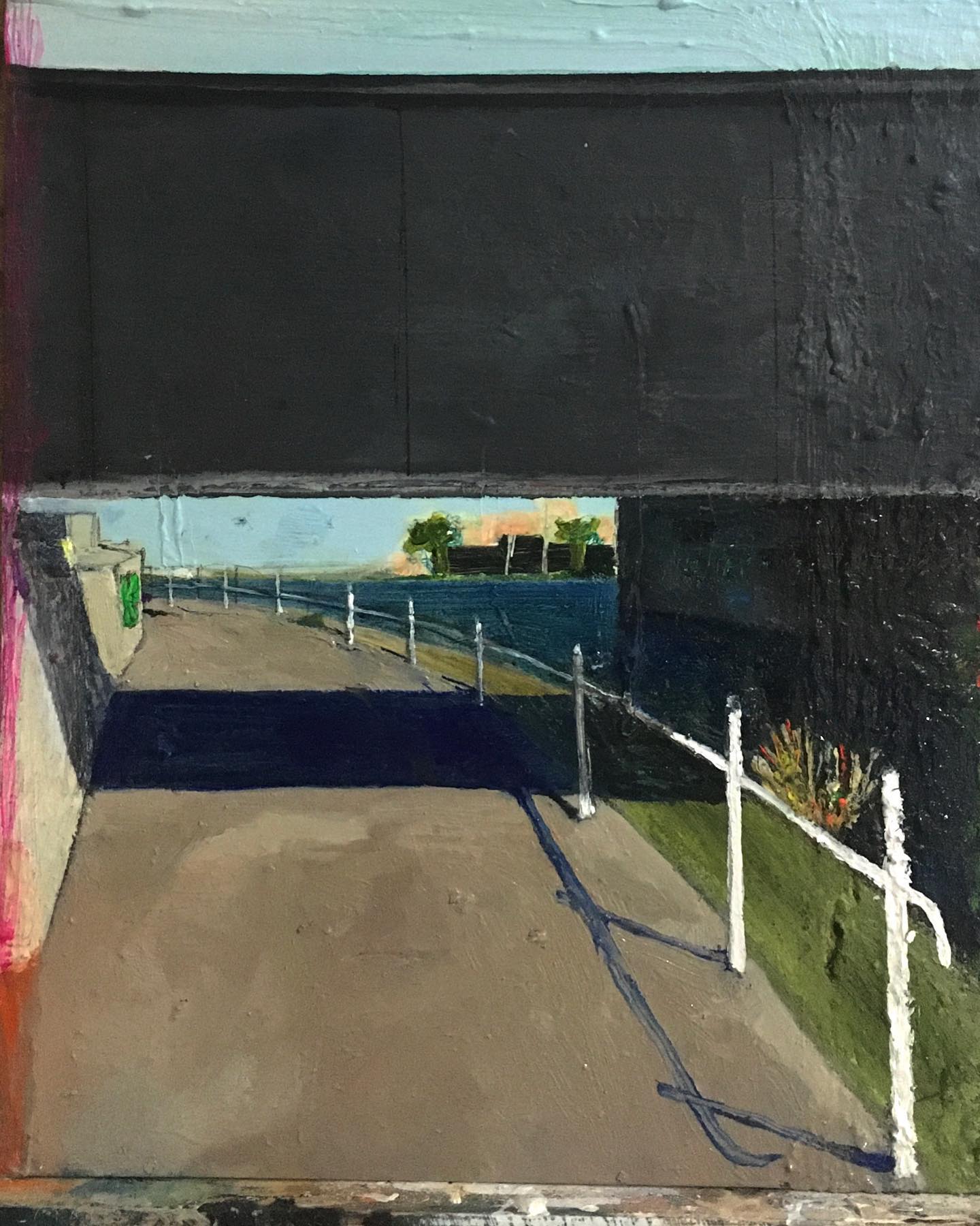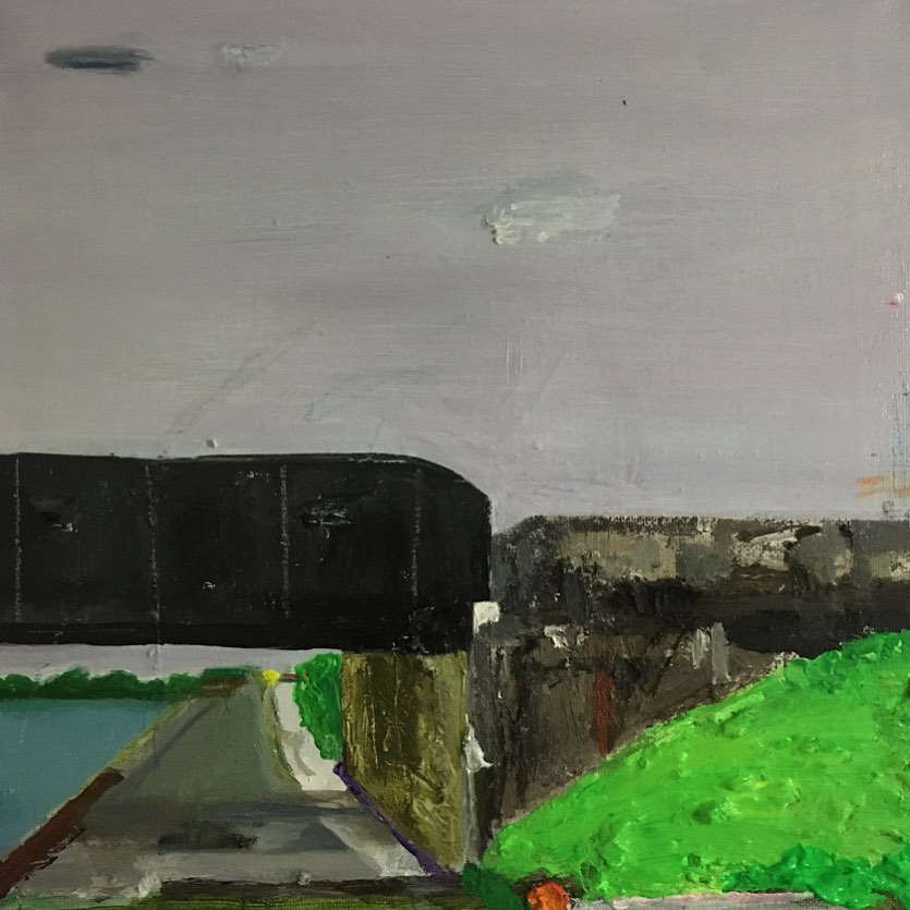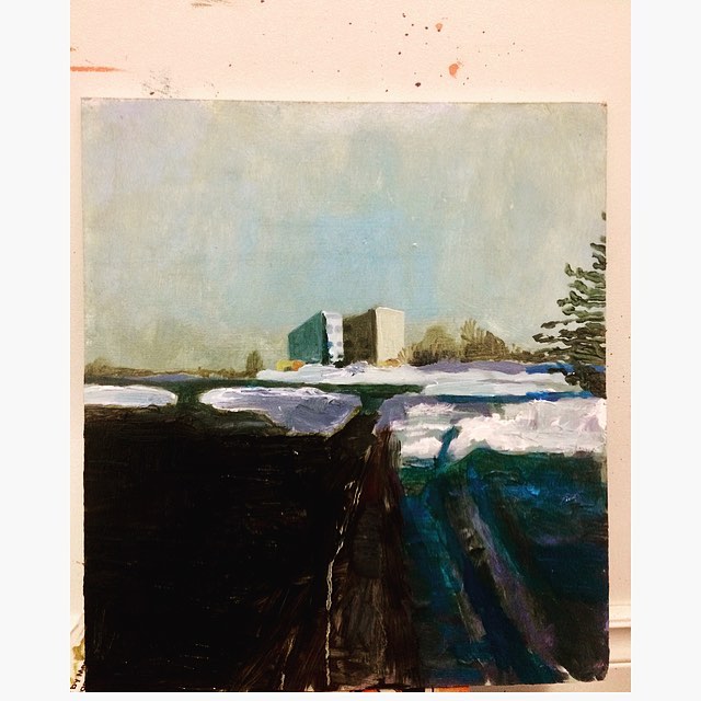 I thought about this work often. It seemed like everything I love in art encapsulated, but in such a beautifully messy though perfectly measured way. Such strange perfect honesty. How does she capture the expressive gestures of inanimate objects — buildings and underpasses — let alone the ever-moving clouds and the ever-shifting light? How does she capture time passing and such specific memories of a moment and place and slant of light? With an absurd and compassionate humor and a depth of melancholy, she achieves a balance of dark and light — in all of the meanings of the words. It’s the edge between everything that sets the shapes and colors humming. Light and shadow, belonging and loneliness, buoyancy and weightiness. Expanses of space, darkness, or blacktop, punctuated by the small clusters of the overlooked buildings in which we spend most of our lives, growing and learning and passing our days. Passing our days.