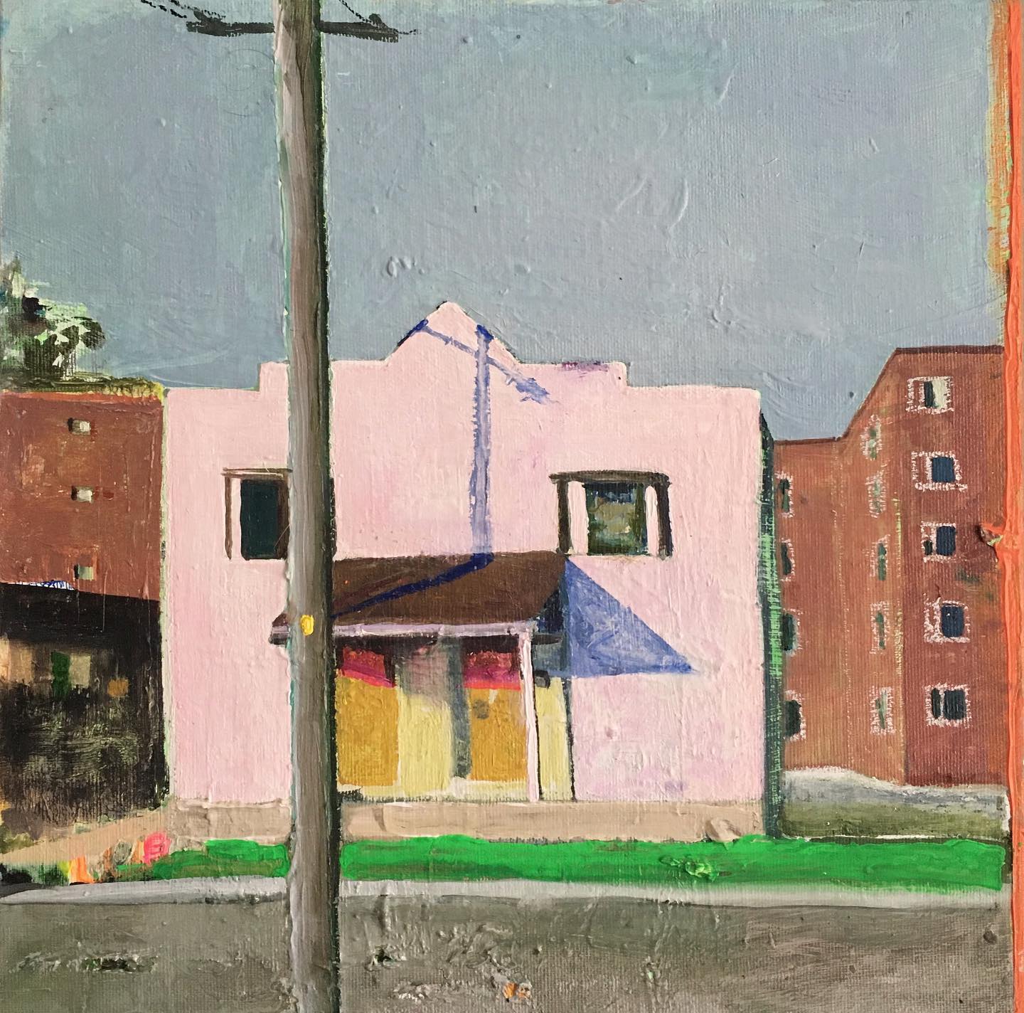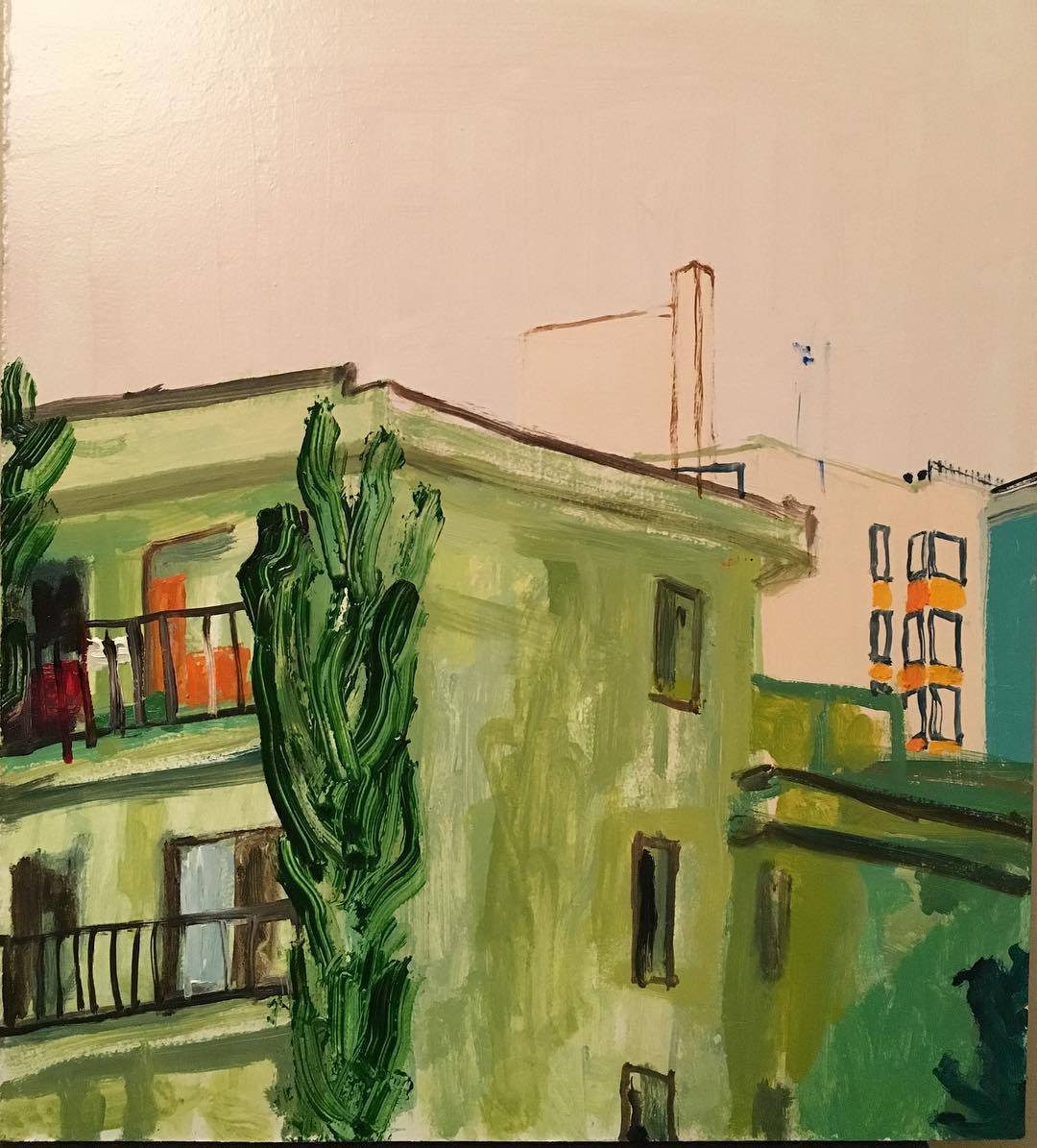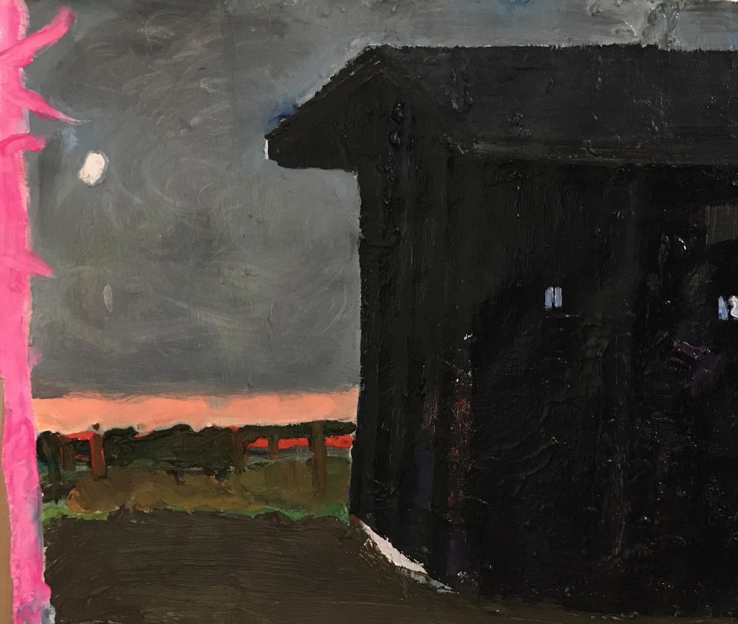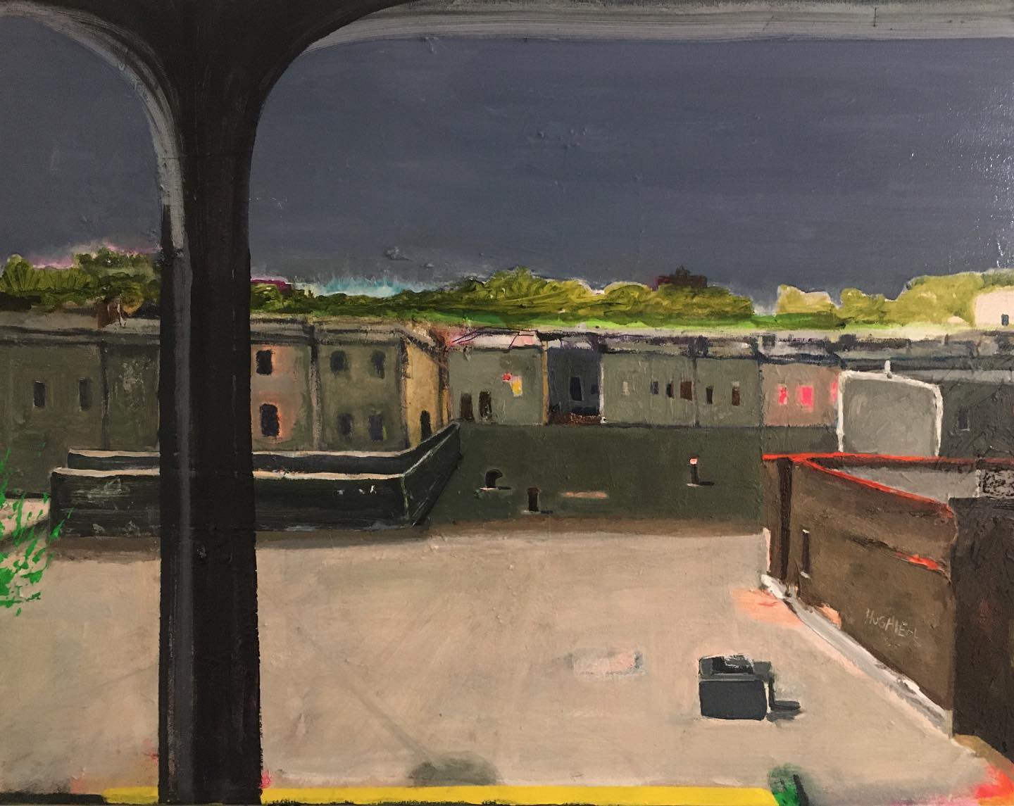 I thought about this work often. It seemed like everything I love in art encapsulated, but in such a beautifully messy though perfectly measured way. Such strange perfect honesty. How does she capture the expressive gestures of inanimate objects — buildings and underpasses — let alone the ever-moving clouds and the ever-shifting light? How does she capture time passing and such specific memories of a moment and place and slant of light? With an absurd and compassionate humor and a depth of melancholy, she achieves a balance of dark and light — in all of the meanings of the words. It’s the edge between everything that sets the shapes and colors humming. Light and shadow, belonging and loneliness, buoyancy and weightiness. Expanses of space, darkness, or blacktop, punctuated by the small clusters of the overlooked buildings in which we spend most of our lives, growing and learning and passing our days. Passing our days.