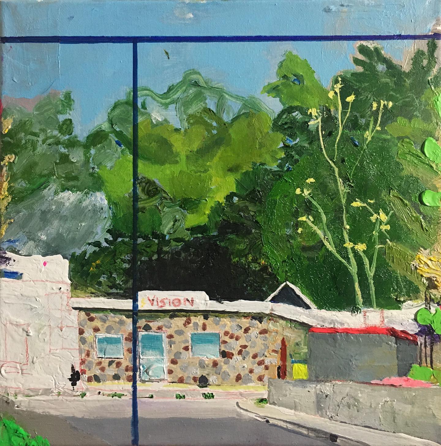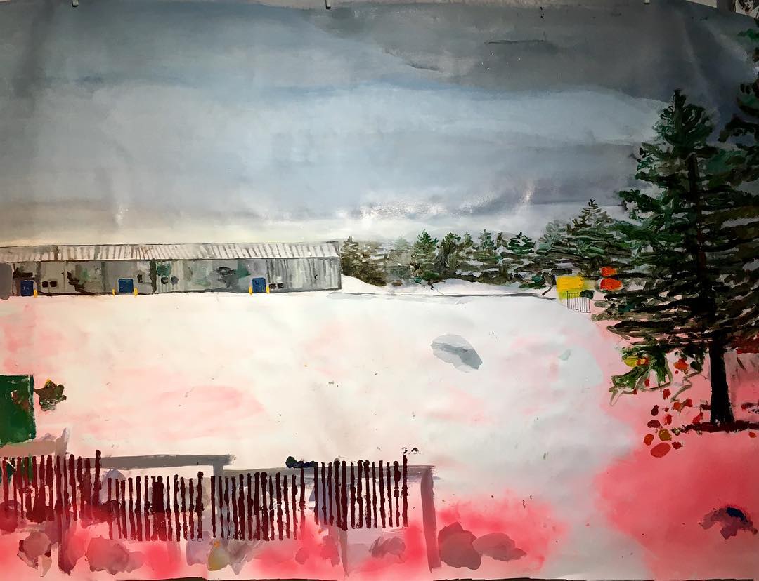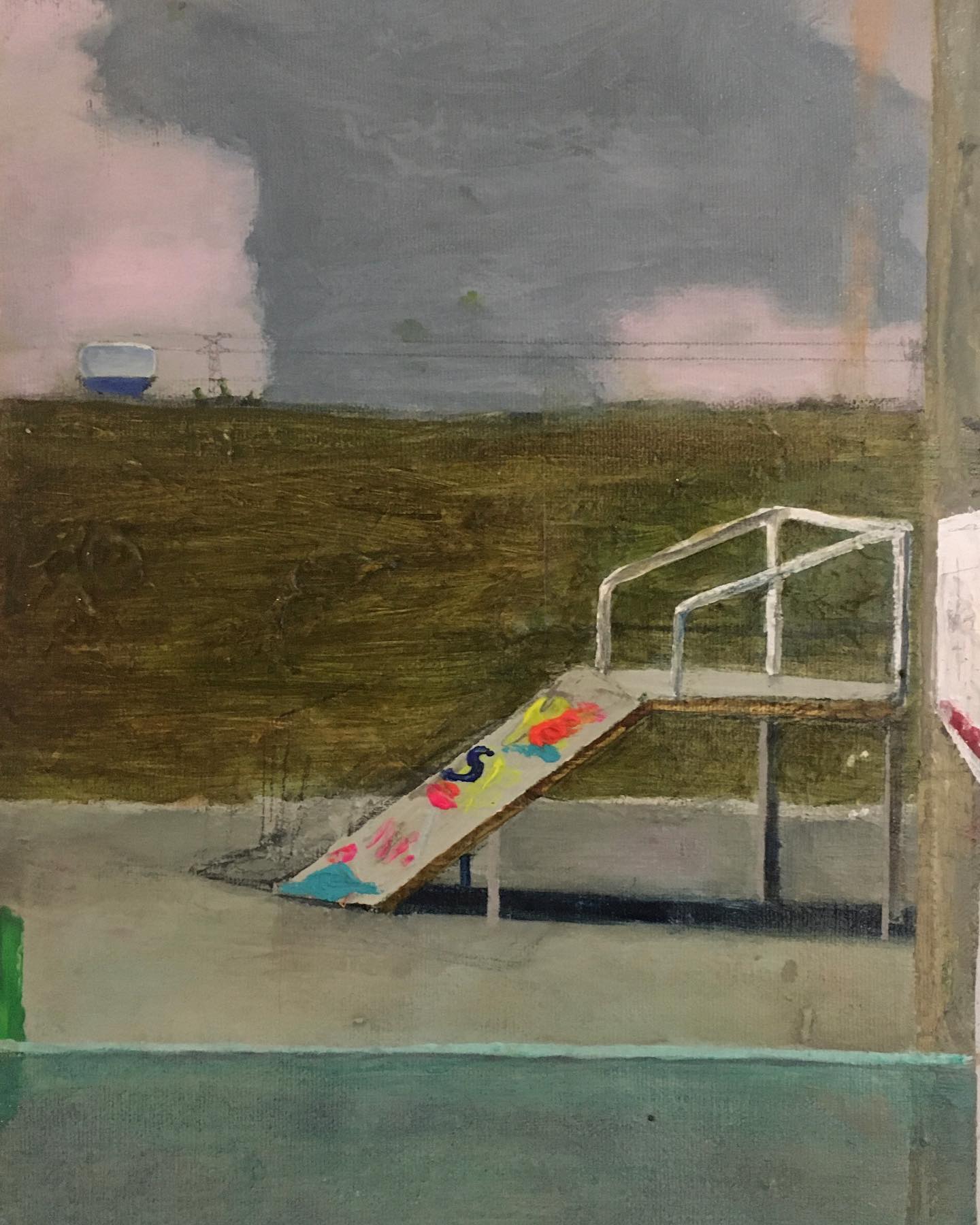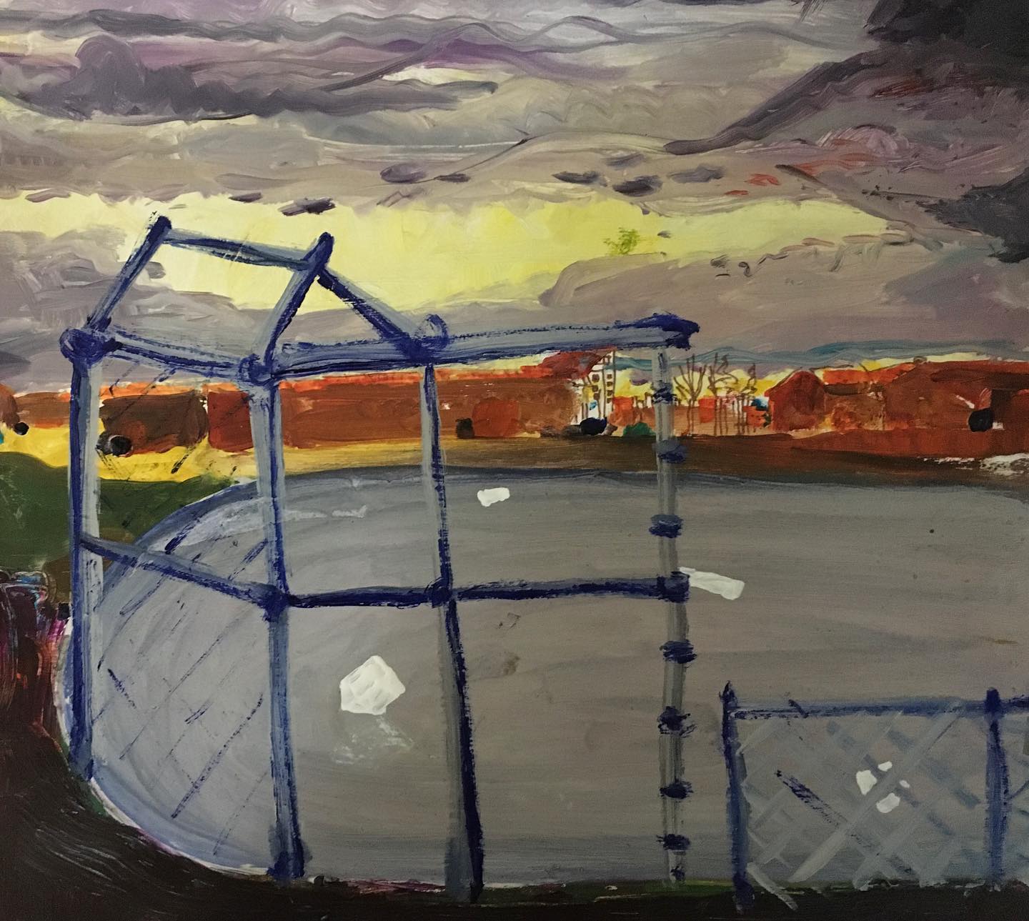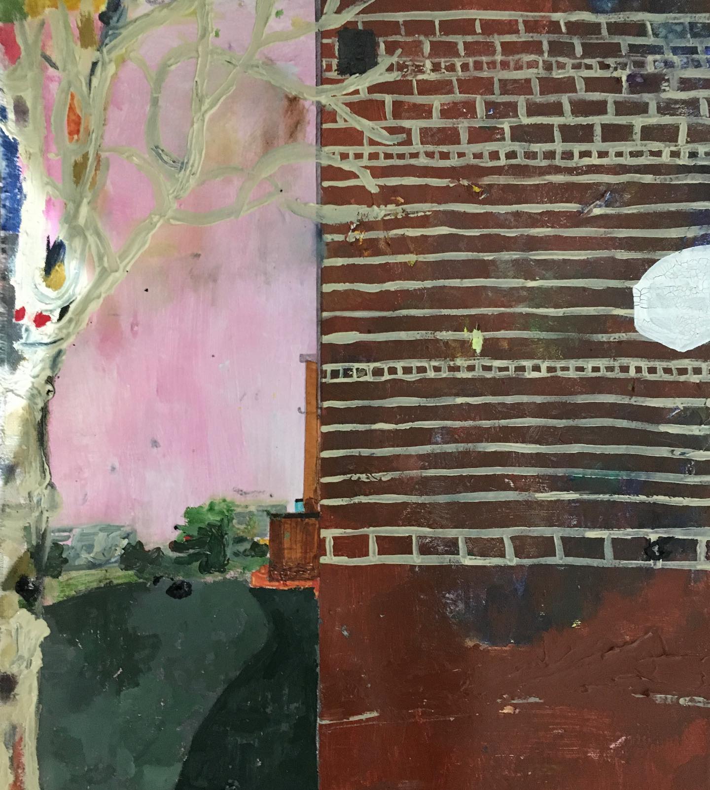 I thought about this work often. It seemed like everything I love in art encapsulated, but in such a beautifully messy though perfectly measured way. Such strange perfect honesty. How does she capture the expressive gestures of inanimate objects — buildings and underpasses — let alone the ever-moving clouds and the ever-shifting light? How does she capture time passing and such specific memories of a moment and place and slant of light? With an absurd and compassionate humor and a depth of melancholy, she achieves a balance of dark and light — in all of the meanings of the words. It’s the edge between everything that sets the shapes and colors humming. Light and shadow, belonging and loneliness, buoyancy and weightiness. Expanses of space, darkness, or blacktop, punctuated by the small clusters of the overlooked buildings in which we spend most of our lives, growing and learning and passing our days. Passing our days.