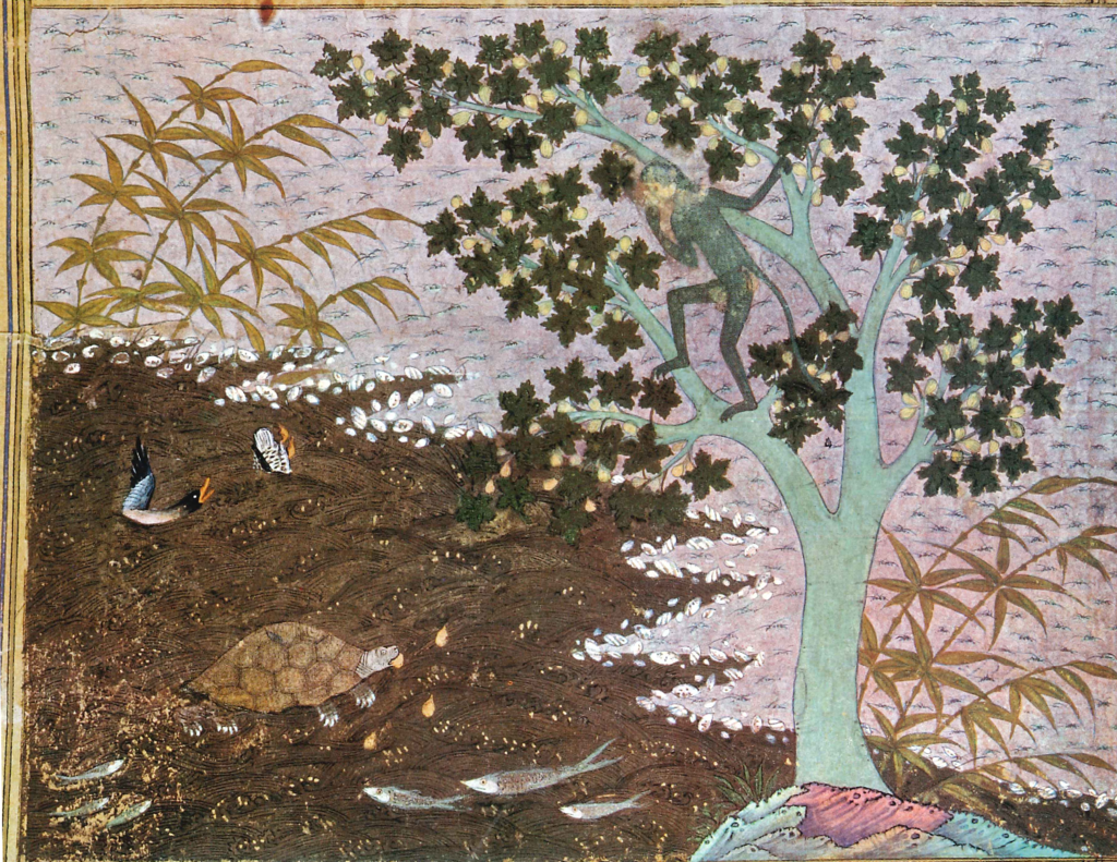 In fact, the question of how to illustrate the text probably arose before its translation into Arabic. It is noteworthy, for example, that one of the earliest prefaces in Arabic already emphasized the importance of iconography in the production of manuscripts.[5] Moreover, there are still archaeological remains carved in stone in India and on the island of Java depicting the fable of “The turtle and the two Ducks”, as well as wall paintings in Central Asia. All these traces and remains corroborate this hypothesis.[6]
