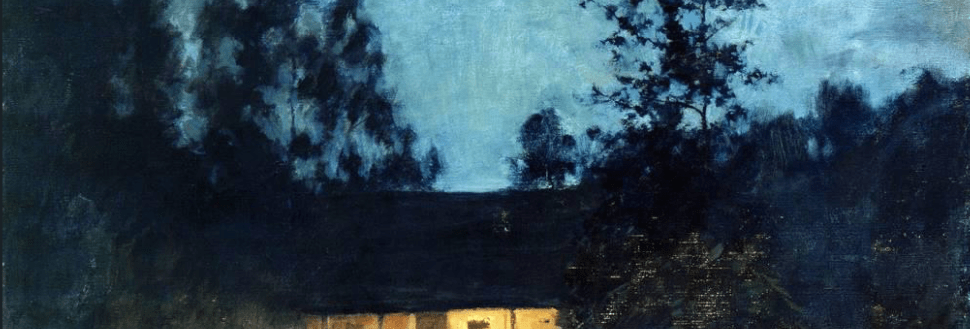 “As though even here in the filtering dusk, here beneath the deep indigo sky, here, alive with looping swifts and darting moths, here in the hereness of the night not yet lighted by the moon that looms blood-red behind the chapel like a fallen sun, its radiance shedding not upon the here-dusk of twittering bats, nor on the there-night of cricket and whippoorwill, but focused short-rayed upon our place of convergence;