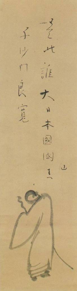 Of his youth, Ryōkan wrote, “When I was a lad,/ I sauntered about town as a gay blade, / Sporting a cloak of the softest down,/ And mounted on a splendid chestnut-colored horse./ During the day, I galloped to the city; / At night, I got drunk on peach blossoms by the river./ I never cared about returning home,/ Usually ending up, with a big smile on my face,/ at a pleasure pavilion!” But he had some sort of spiritual change, and rather than taking over his father’s place as a village headman and accepting a life of business and wealth, he shaved his head, renounced the world, and became a Buddhist monk. He became the disciple of a Zen priest called Kokusen at the age of 22, and studied under him for over a decade.