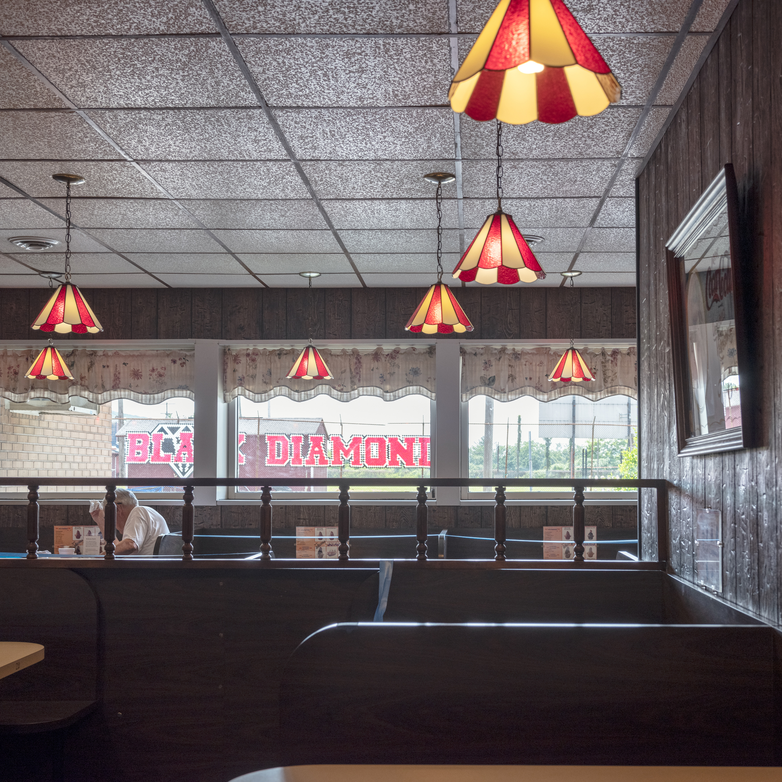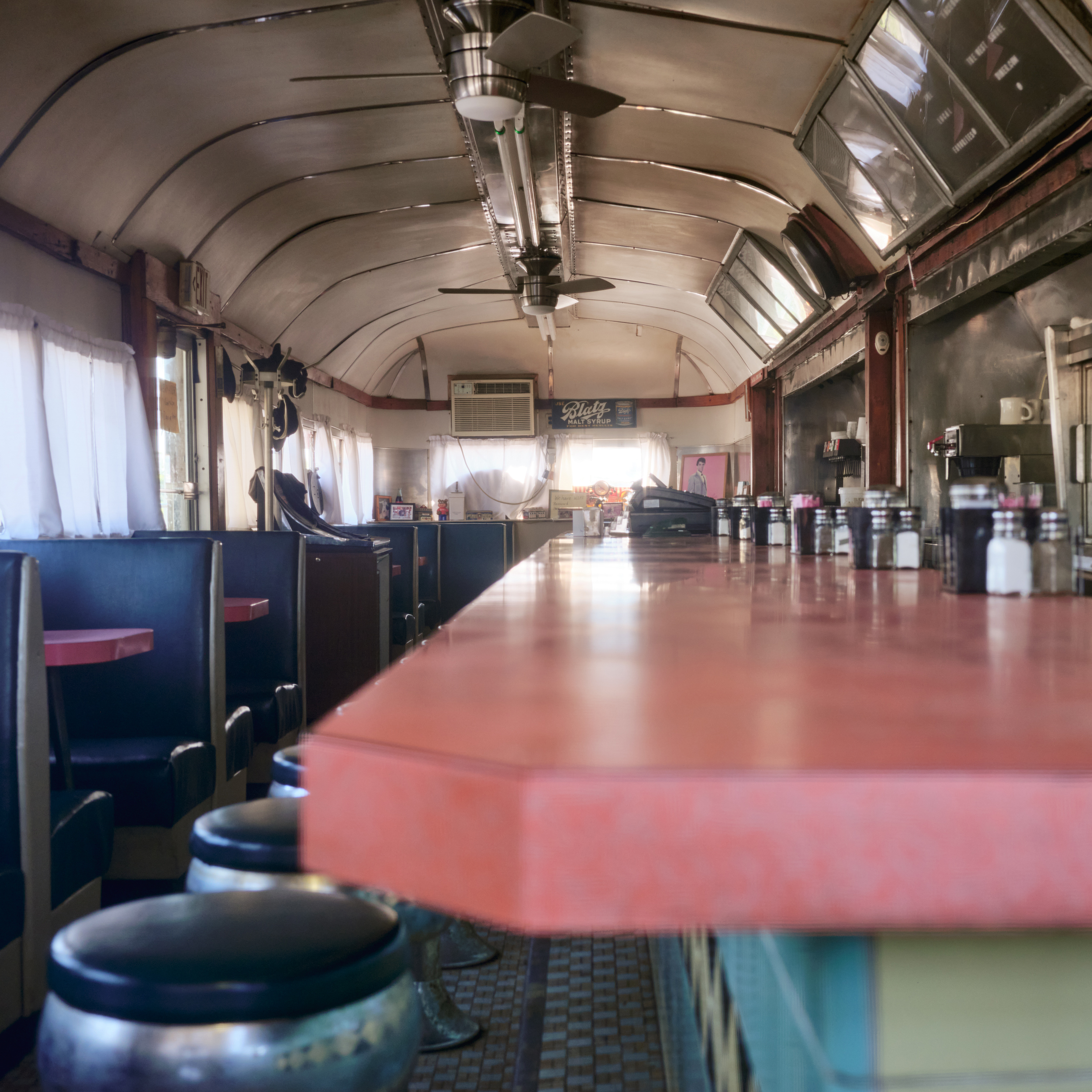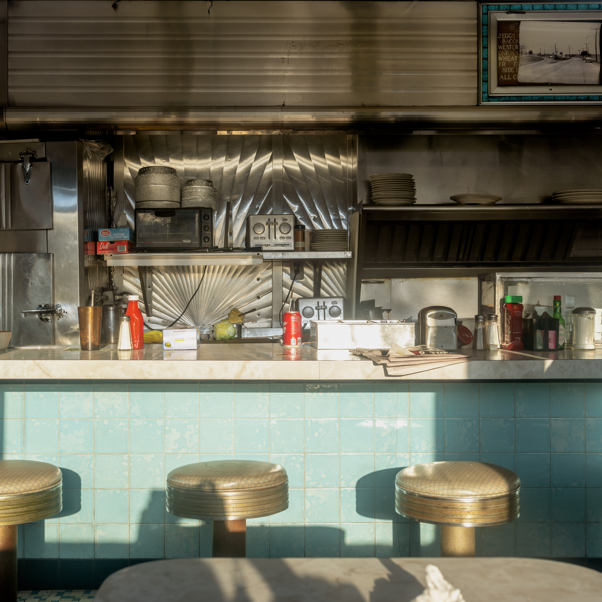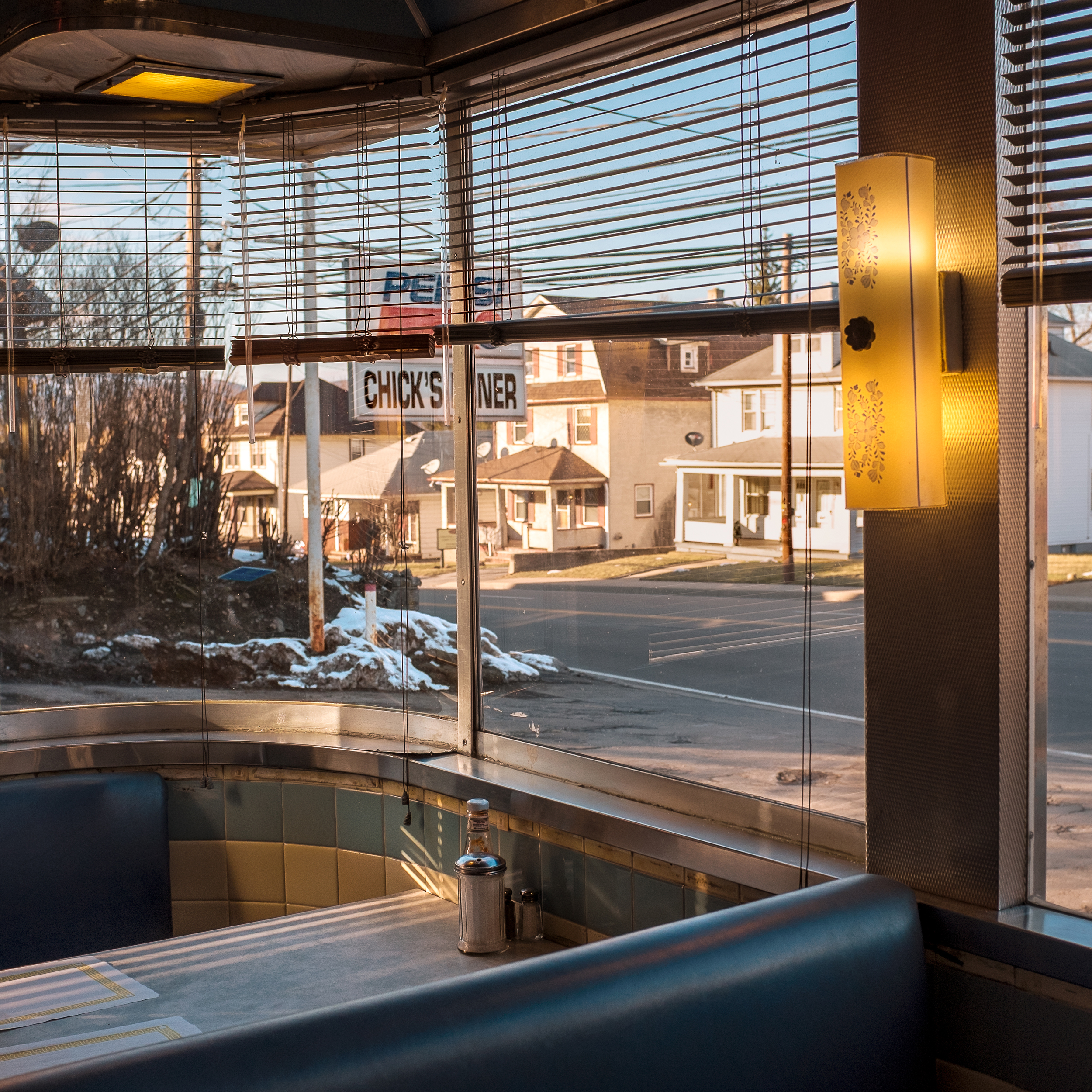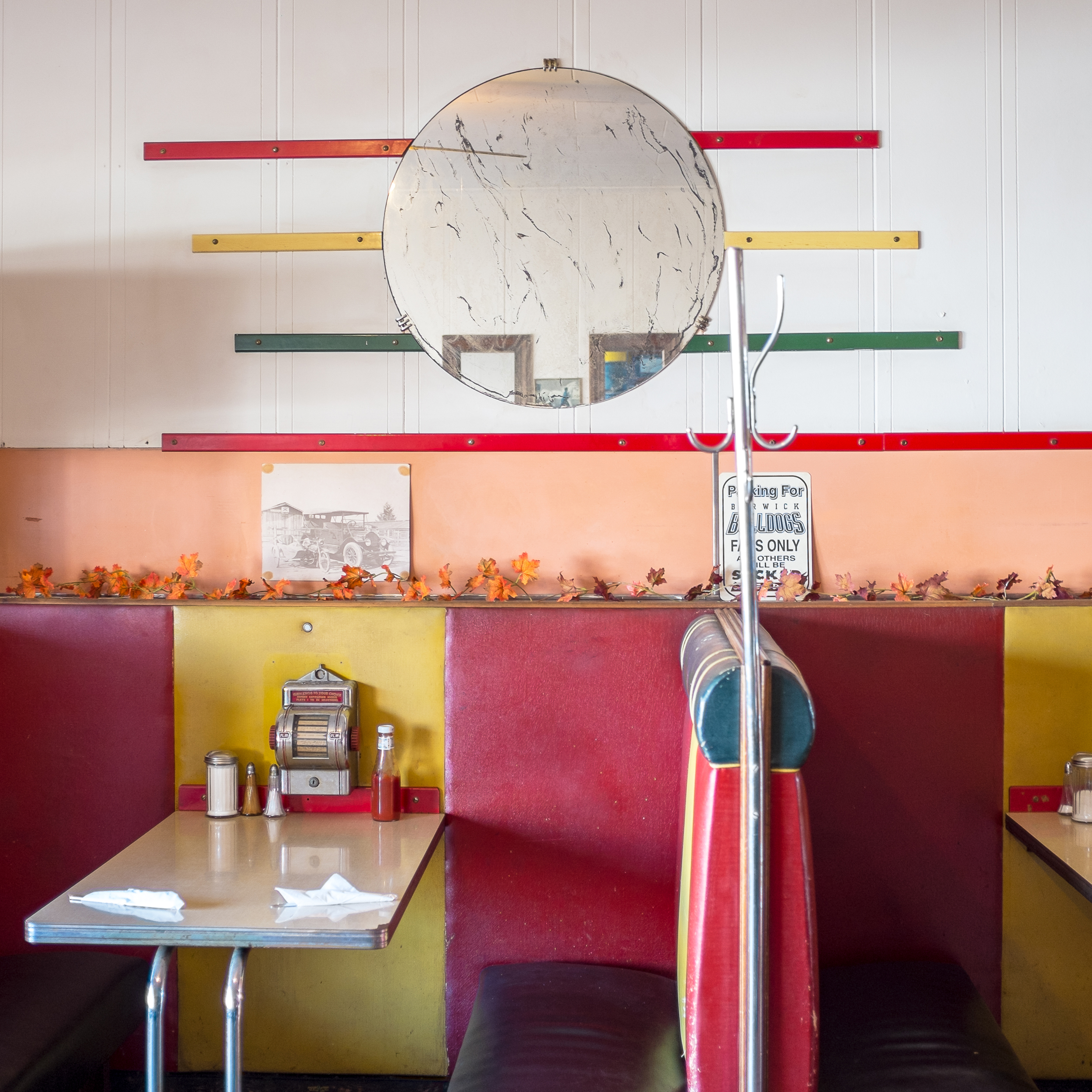 “The photographs in Lunch Poems highlight “third spaces”: communal settings outside of home and work such as taverns, church picnics, diners, restaurants, and movie theaters — sites where we might gather, if we could agree. Actively using photography to explore the residue of time and human effort, I create portraits of place, mindful of the individuals who have been there before and may be there again. Imaginary one-to-one conversations with these ghosts, so to speak, allow me to invest in the possibility that within this divided nation, we might, one day, understand and respect each other. Harnessing light to grasp at moments of joy in complicated environments, with these images I hope to forge an opening for deep looking and the exploration of multiple layers of meaning, an encounter with complex histories rather than one-dimensional, familiar tropes.” – Leah Frances
