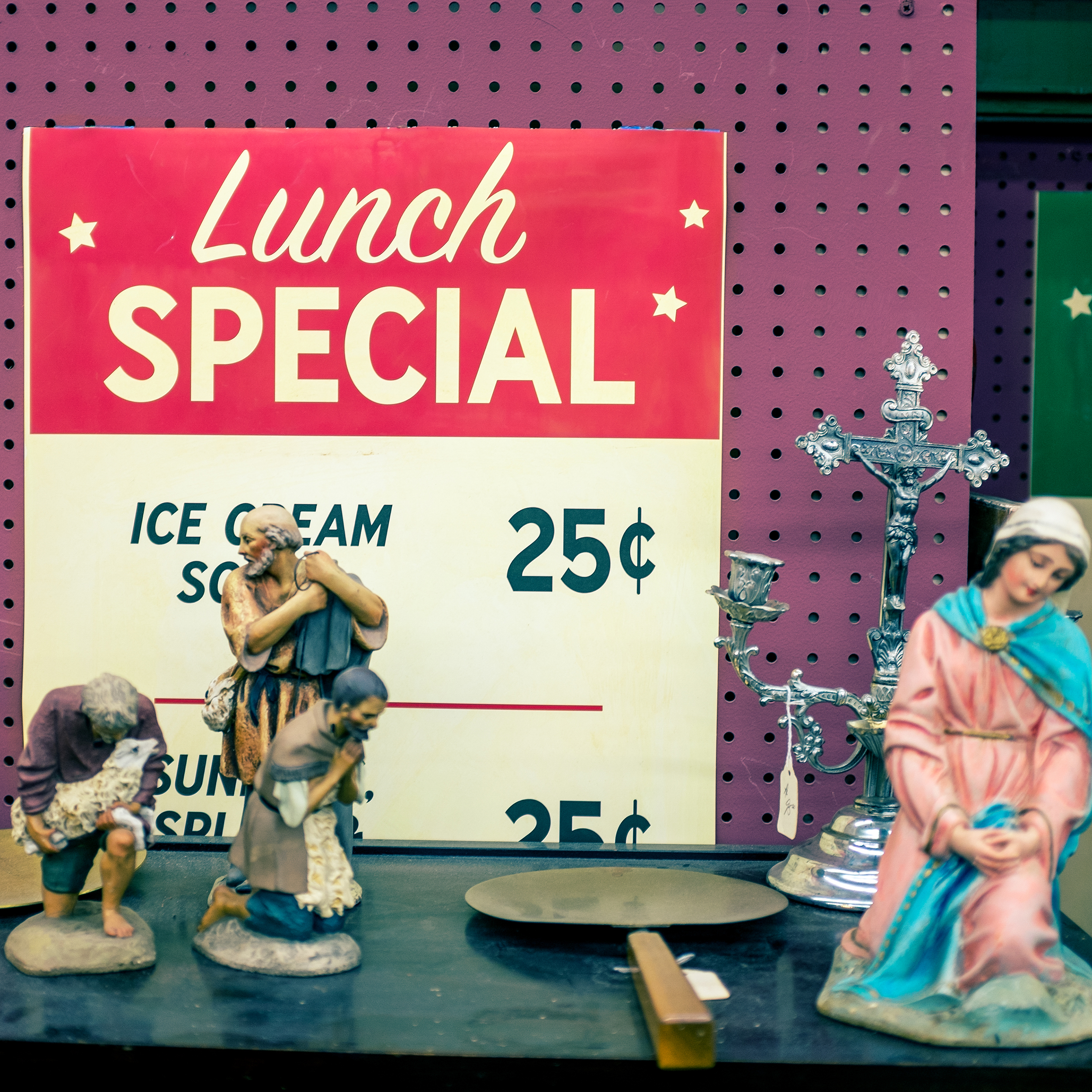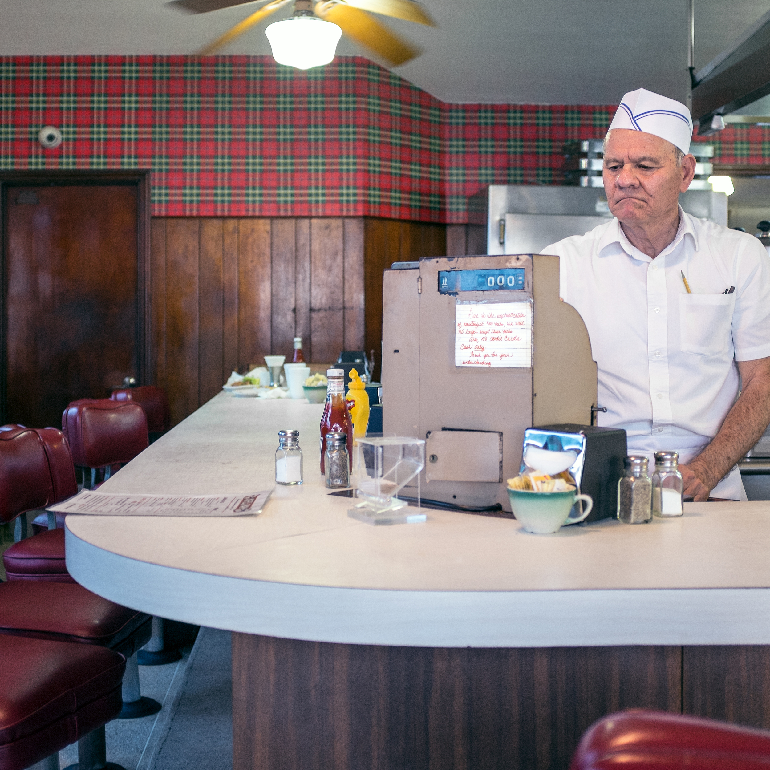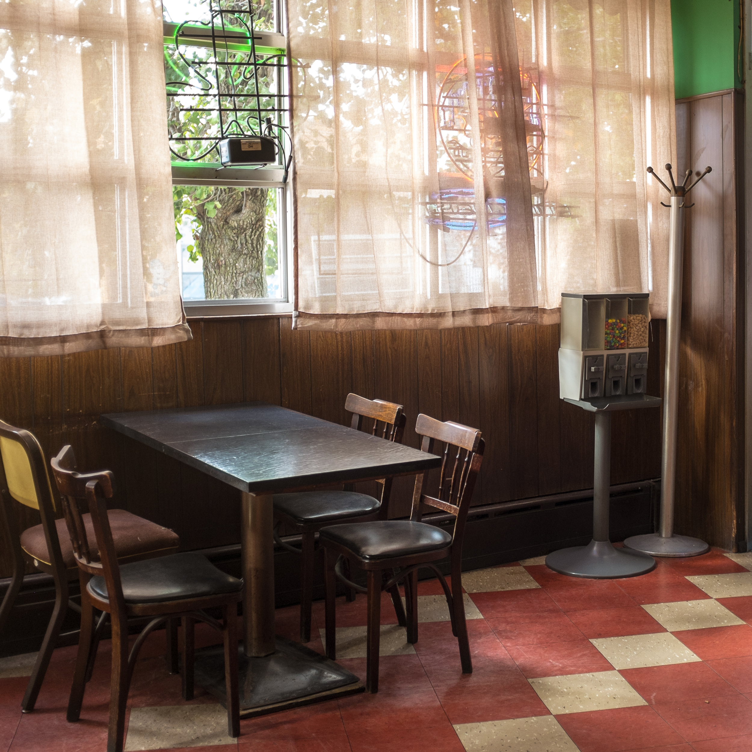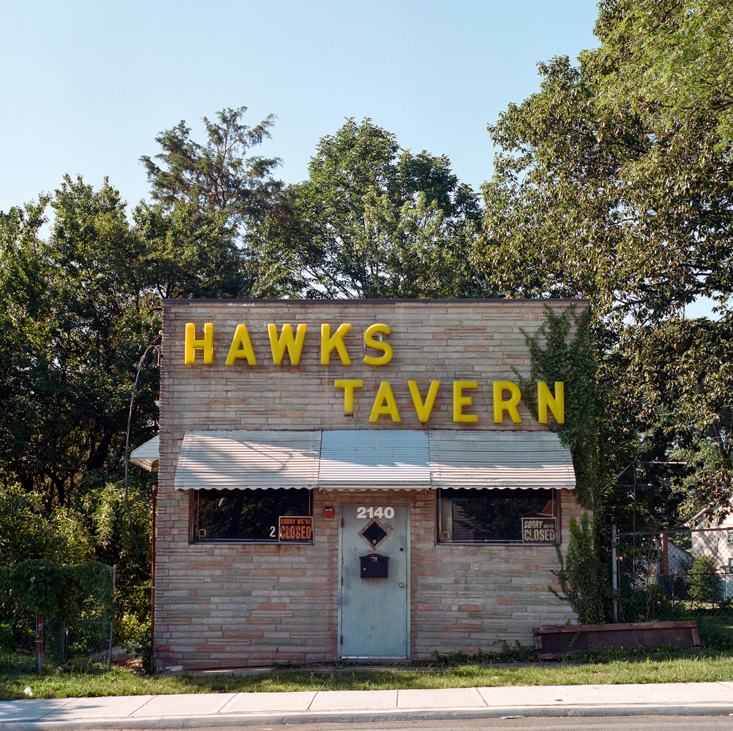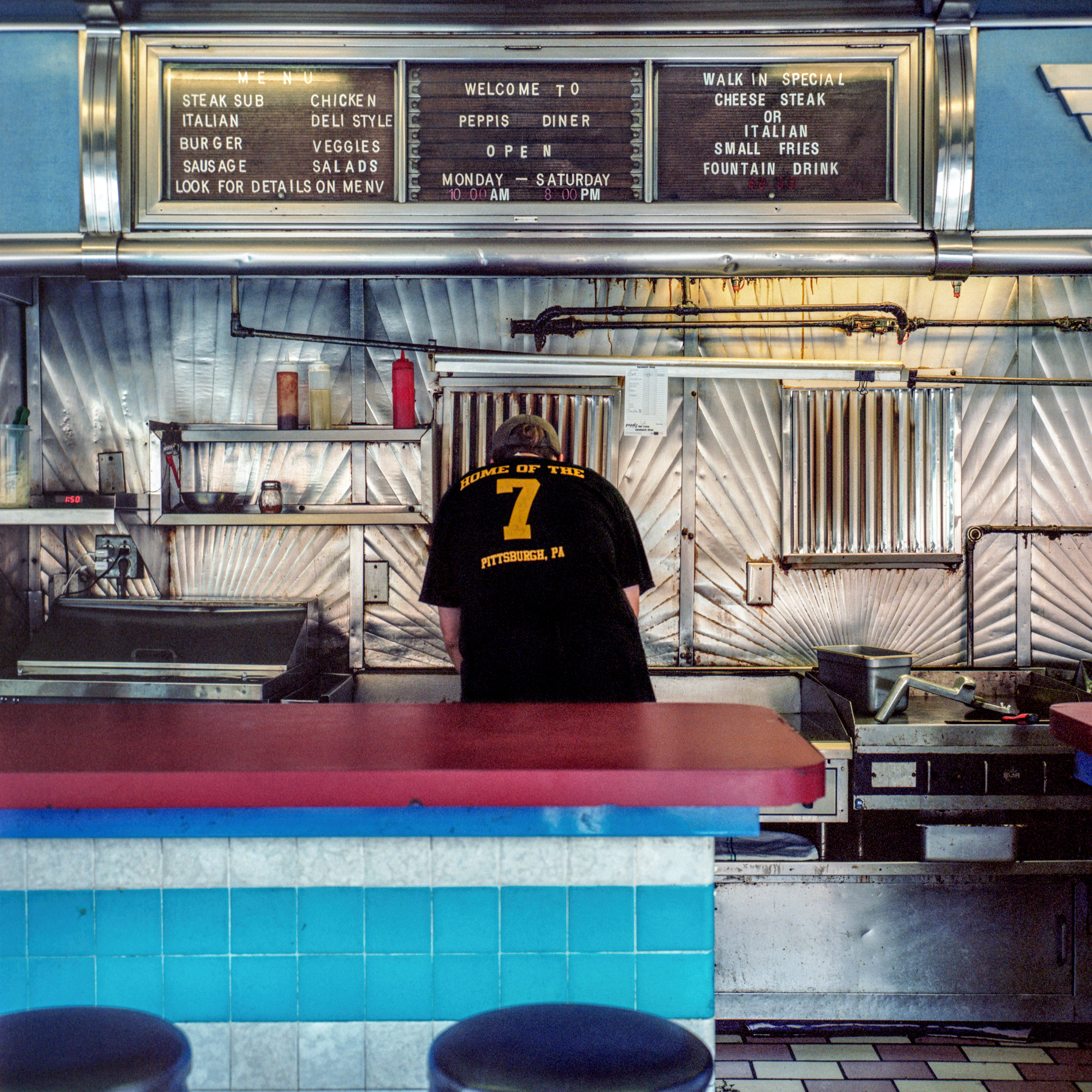 “The photographs in Lunch Poems highlight “third spaces”: communal settings outside of home and work such as taverns, church picnics, diners, restaurants, and movie theaters — sites where we might gather, if we could agree. Actively using photography to explore the residue of time and human effort, I create portraits of place, mindful of the individuals who have been there before and may be there again. Imaginary one-to-one conversations with these ghosts, so to speak, allow me to invest in the possibility that within this divided nation, we might, one day, understand and respect each other. Harnessing light to grasp at moments of joy in complicated environments, with these images I hope to forge an opening for deep looking and the exploration of multiple layers of meaning, an encounter with complex histories rather than one-dimensional, familiar tropes.” – Leah Frances