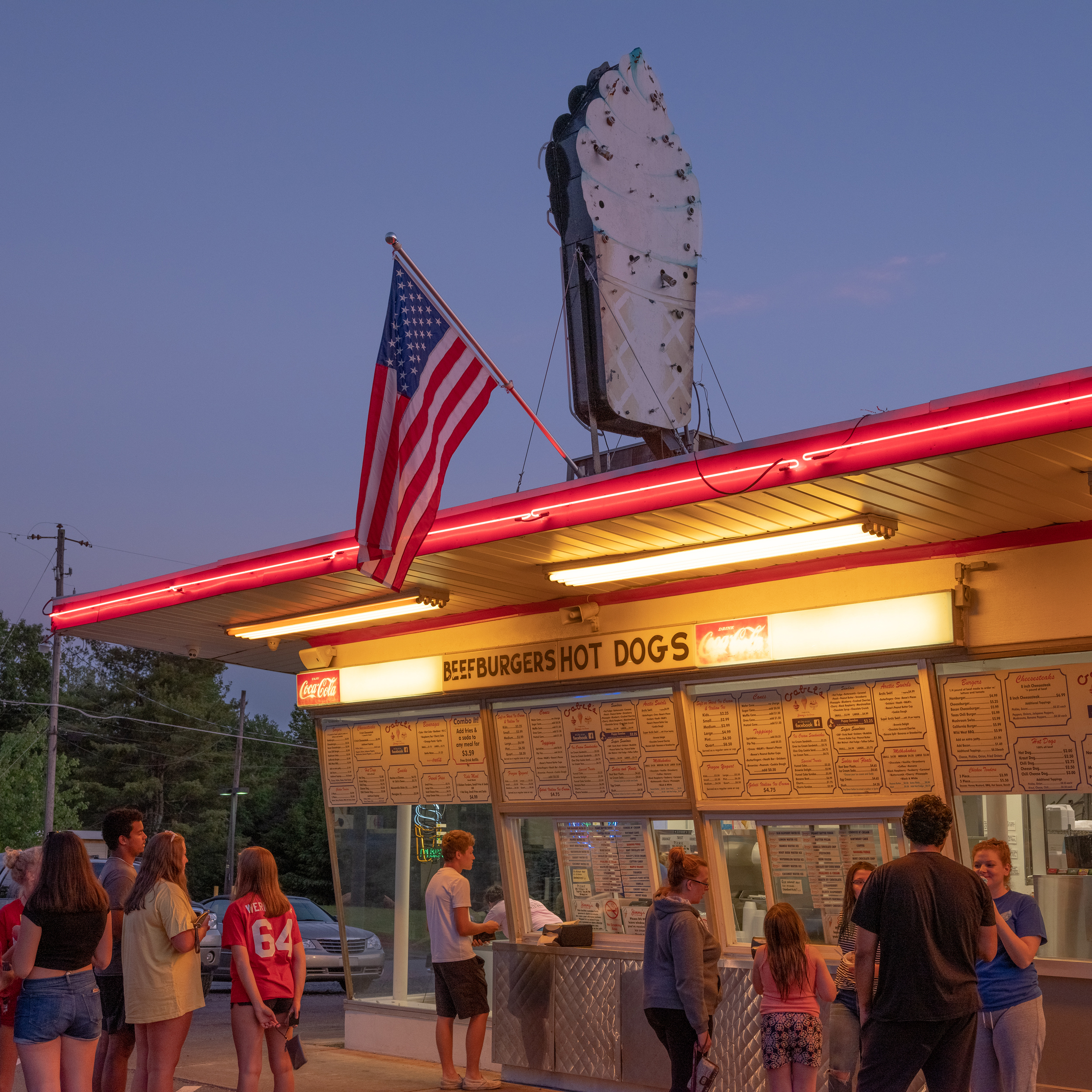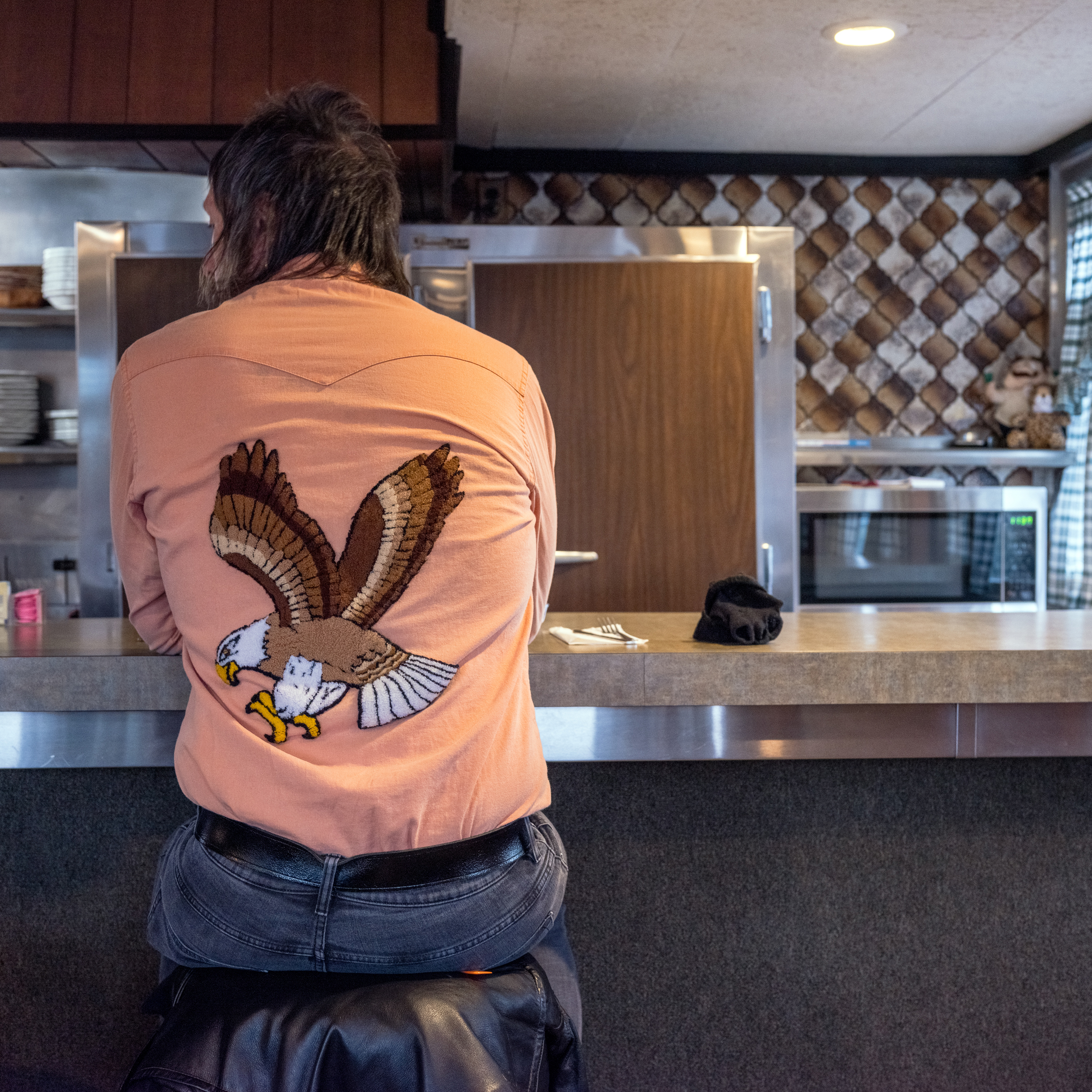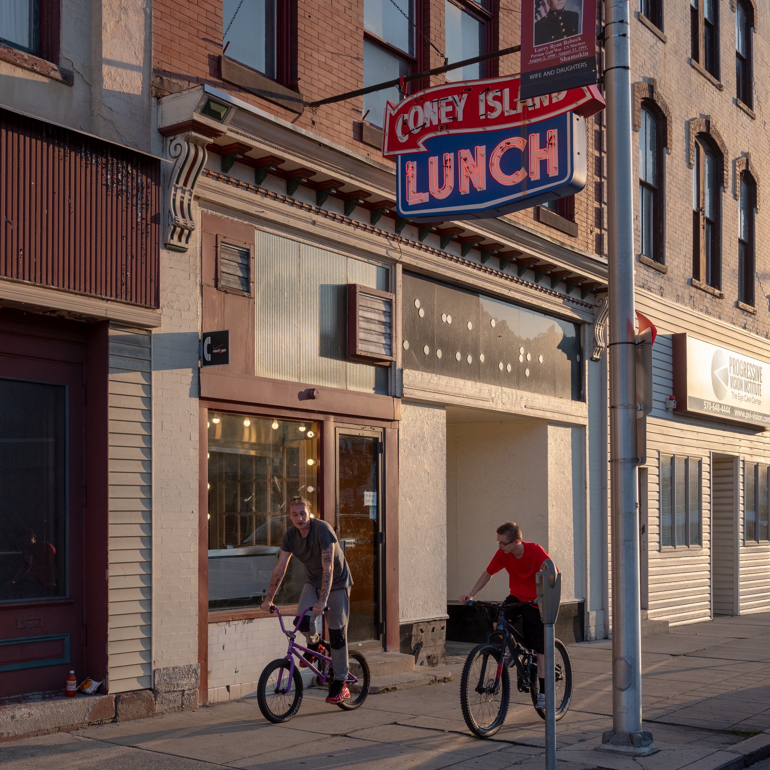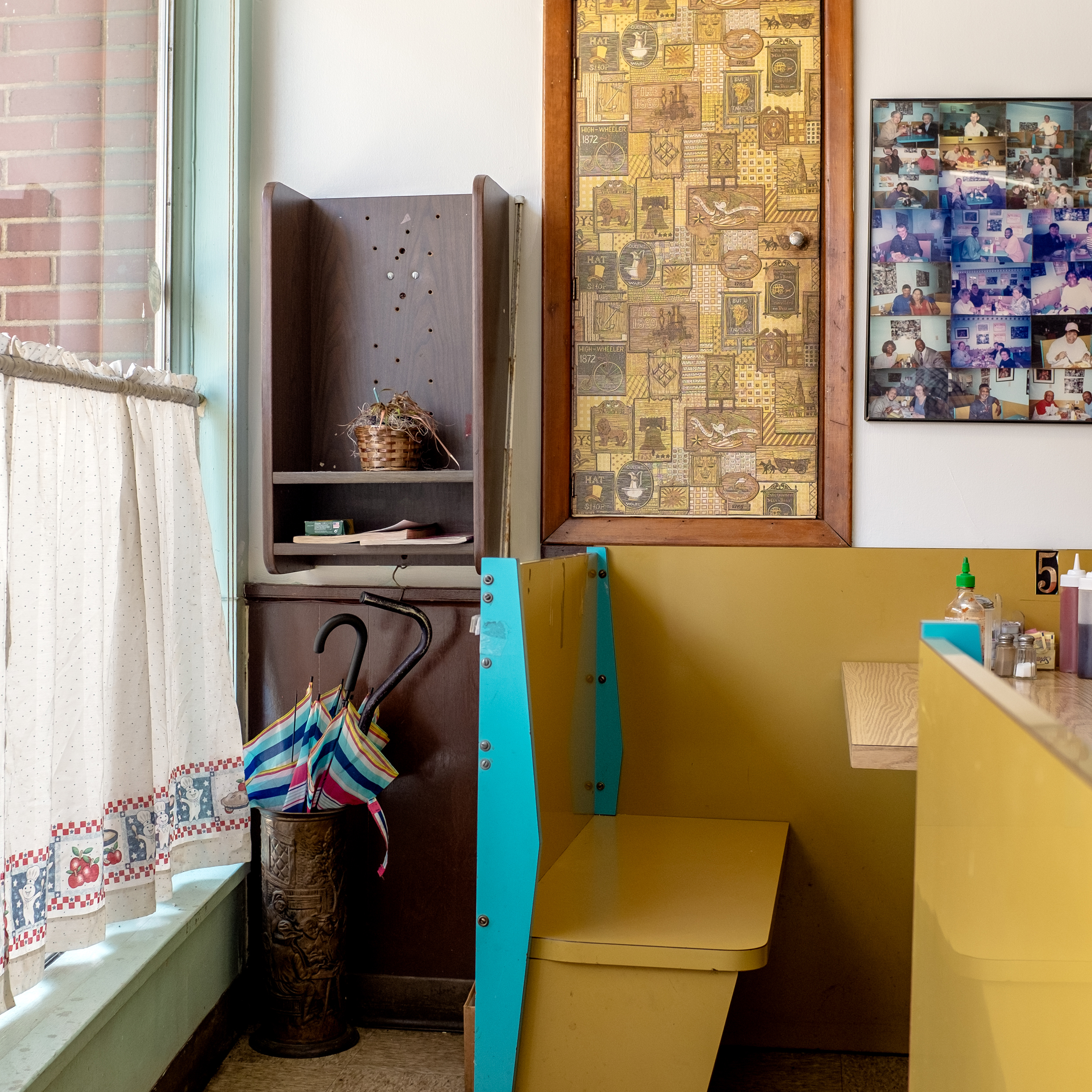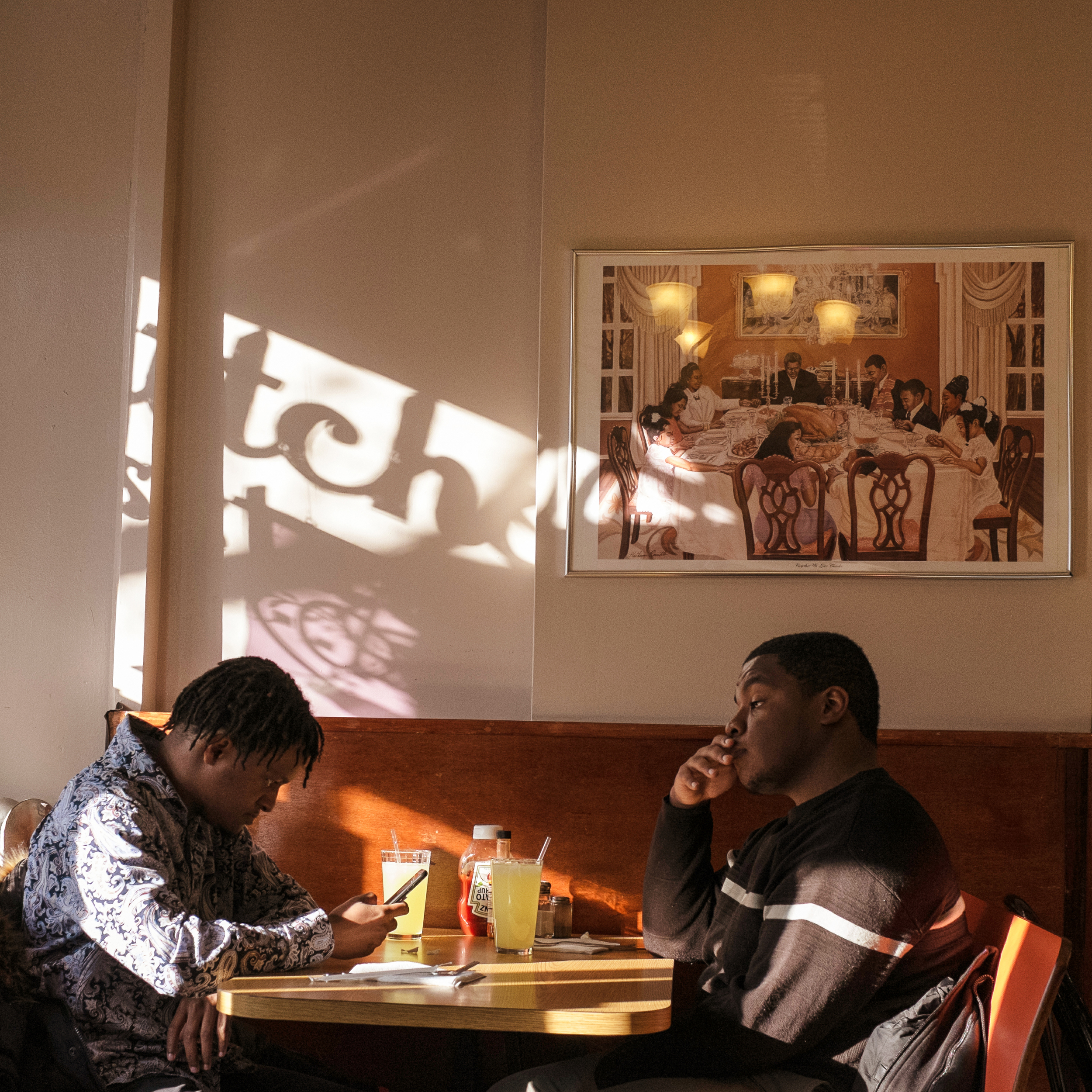 “The photographs in Lunch Poems highlight “third spaces”: communal settings outside of home and work such as taverns, church picnics, diners, restaurants, and movie theaters — sites where we might gather, if we could agree. Actively using photography to explore the residue of time and human effort, I create portraits of place, mindful of the individuals who have been there before and may be there again. Imaginary one-to-one conversations with these ghosts, so to speak, allow me to invest in the possibility that within this divided nation, we might, one day, understand and respect each other. Harnessing light to grasp at moments of joy in complicated environments, with these images I hope to forge an opening for deep looking and the exploration of multiple layers of meaning, an encounter with complex histories rather than one-dimensional, familiar tropes.” – Leah Frances
