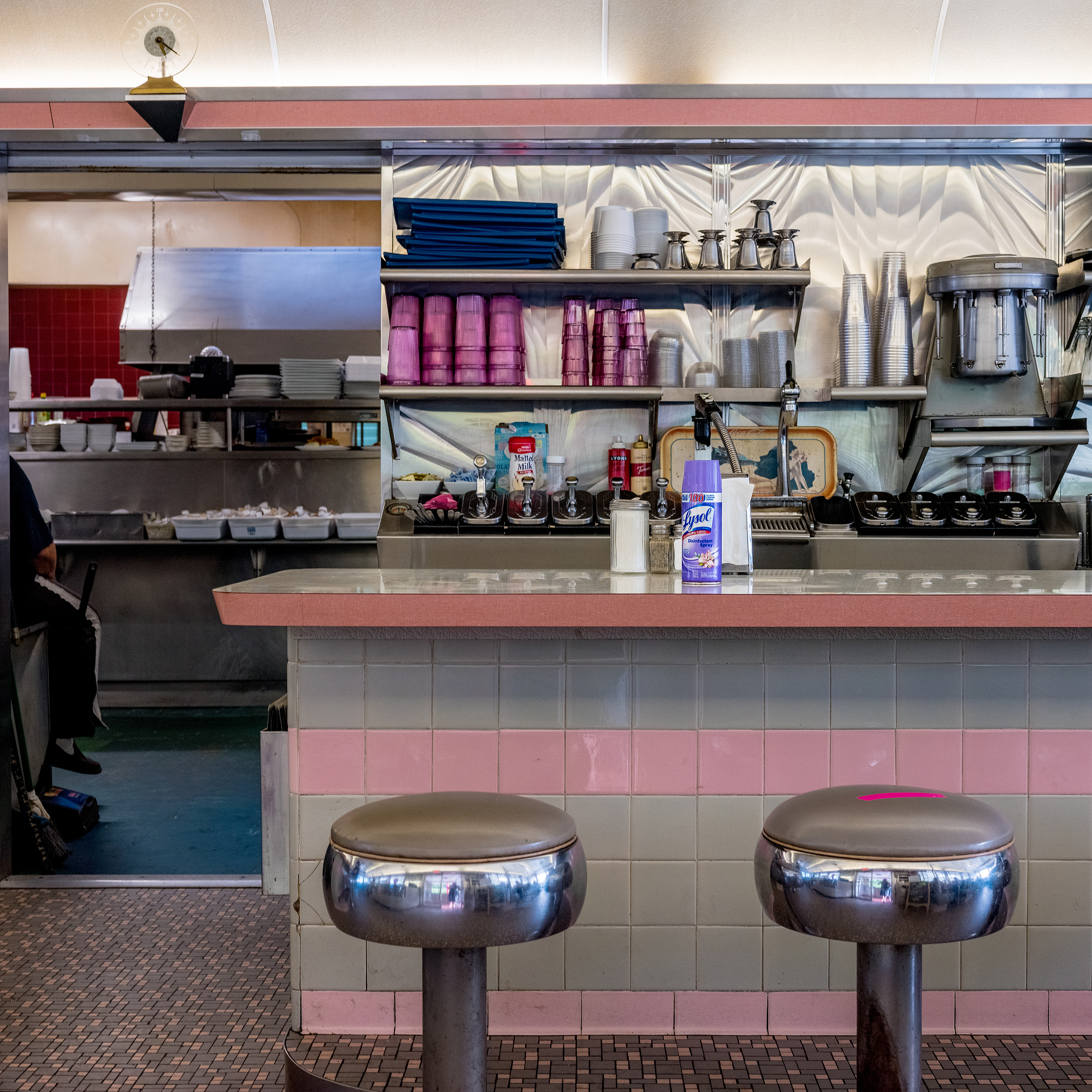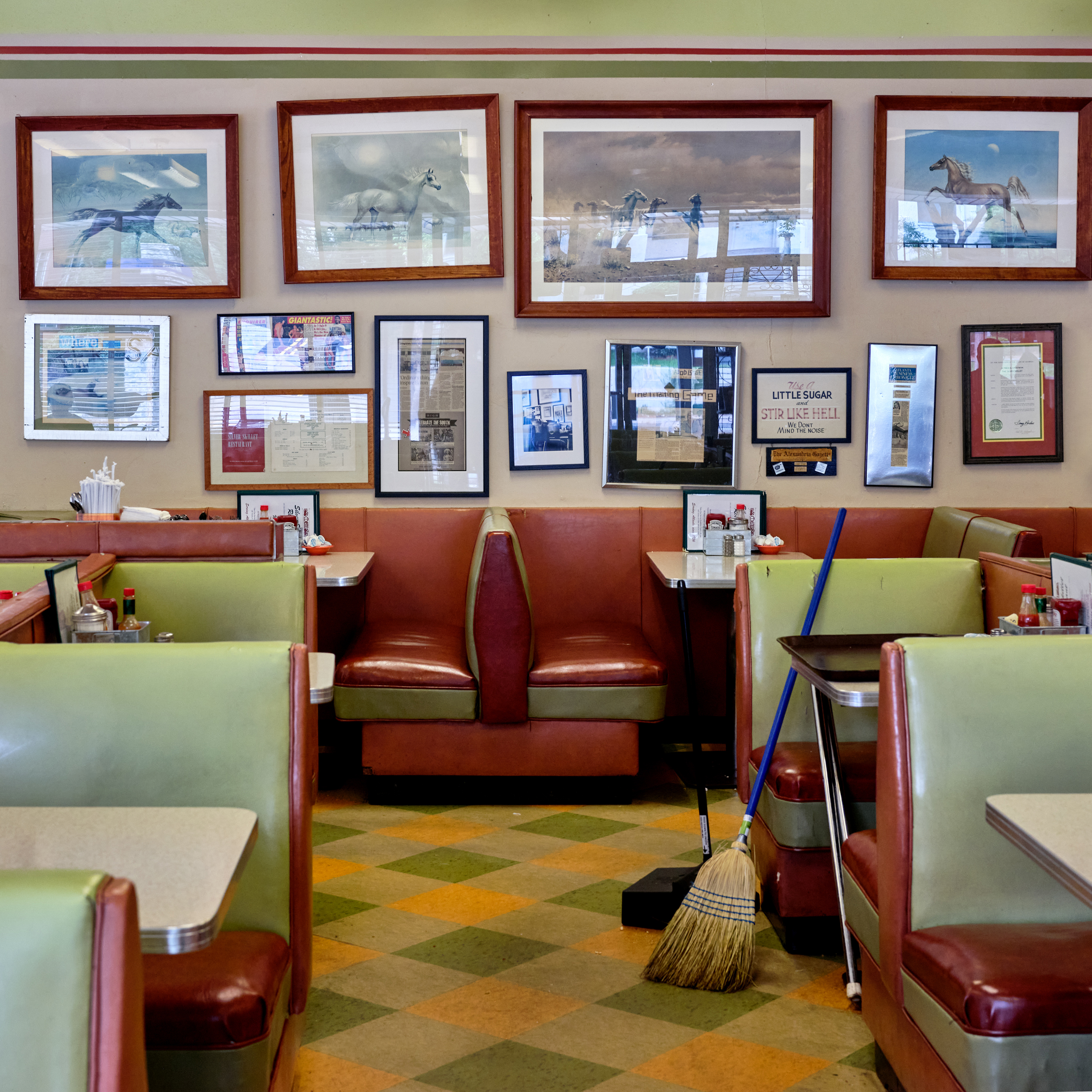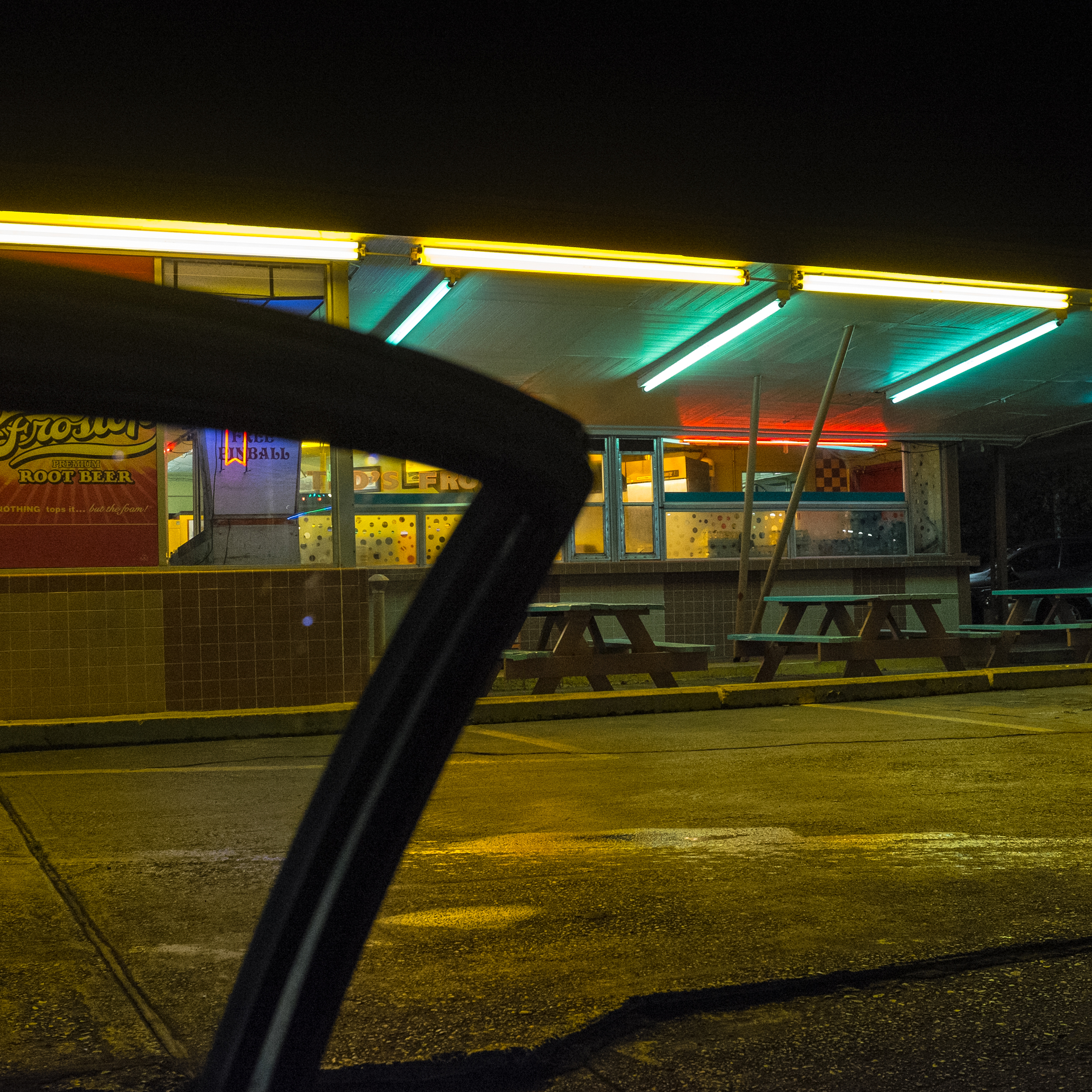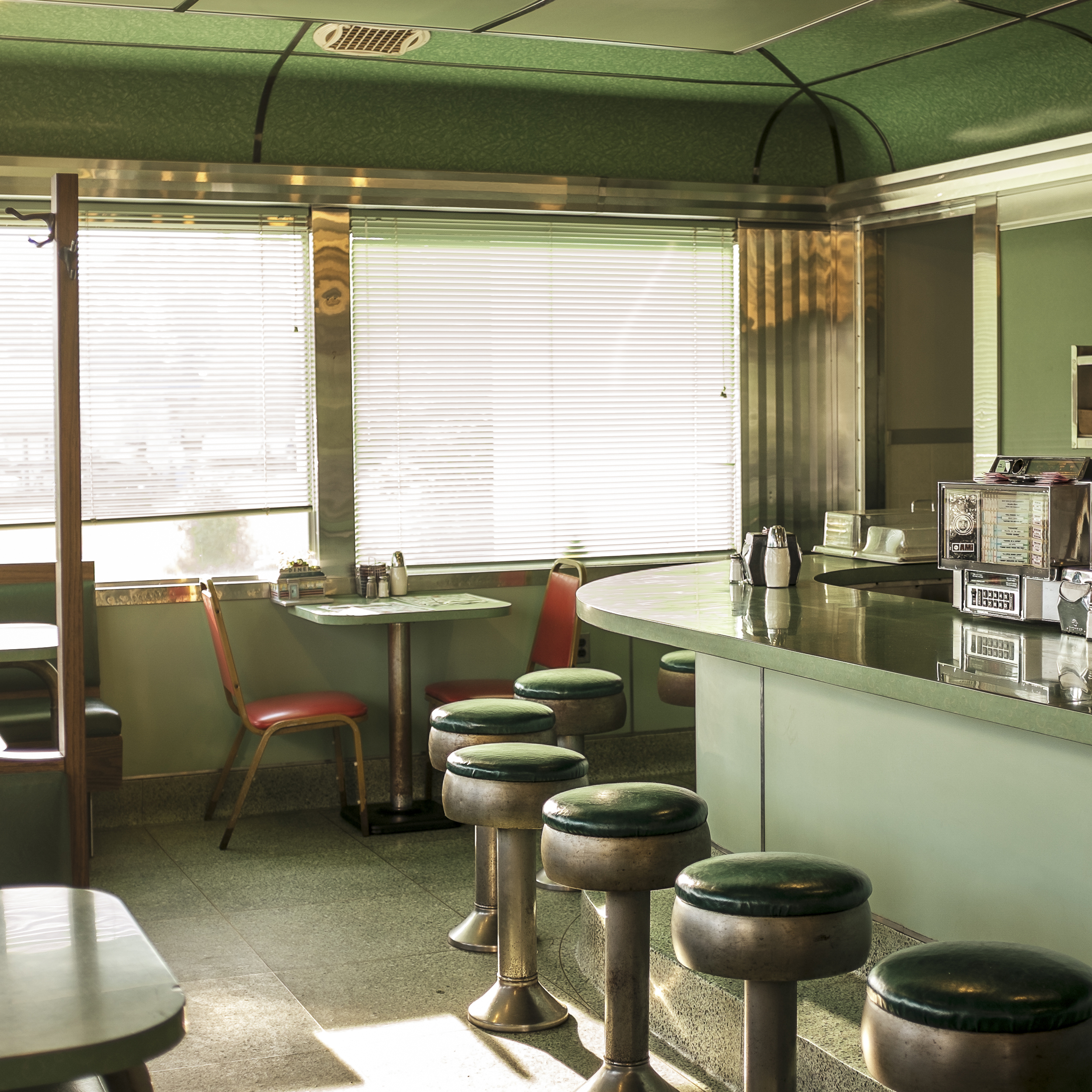 In the mid-thirties, photographer Berenice Abbott and her friend Elizabeth McCausland planned a trip to visit all forty-eight states and to produce a book which, in McCausland’s words, “could be the great democratic book, the great book for masses of people conditioned by reading newspapers and tabloids.” They never found the funding and the trip never happened. But their work and their ideal is being carried on in the work of photographers like Leah Frances. Frances’ work focuses on shared spaces — diners and bars and churches and ice cream stands — places we gather to eat, drink, pray, and talk to one another. Places we communicate in real life, outside of the modern-day tabloids that are internet chatrooms and comments sections. She finds these spaces in their off times, before shifts or after shifts or between shifts. Or their after times — long after people talked and laughed and lived there, when they are boarded up, defunct. There’s a hanging silence in the spaces, a grace in the light that catches in iconic chrome and Naugahyde and neon. These empty places are an expression of our shared loneliness, but they also radiate with a ragged sort of hope. When we share stories over lunch, when we sit and actually speak with one another, when we serve one another and clean up after one another, we realize how much else we share — every foolish wonderful needy kind despairing hopeful thing that makes us human. We see this in Frances’ photographs, layer upon layer upon layer of it. She captures the heavy warmth of nostalgia, both personal and national, and all the ways it sustains us and holds us back. She finds the poetry in it all. -Magpies