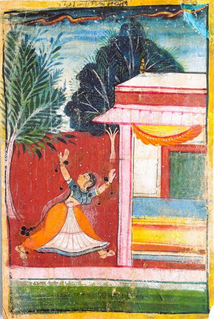 These paintings are of a woman waiting for her lover, a sense of joyous anticipation is heightened by the time of day, early evening and by the rain and lightning that characterize the monsoon season. The woman is startled by the lightning. A verse about Madhu madhavi says –