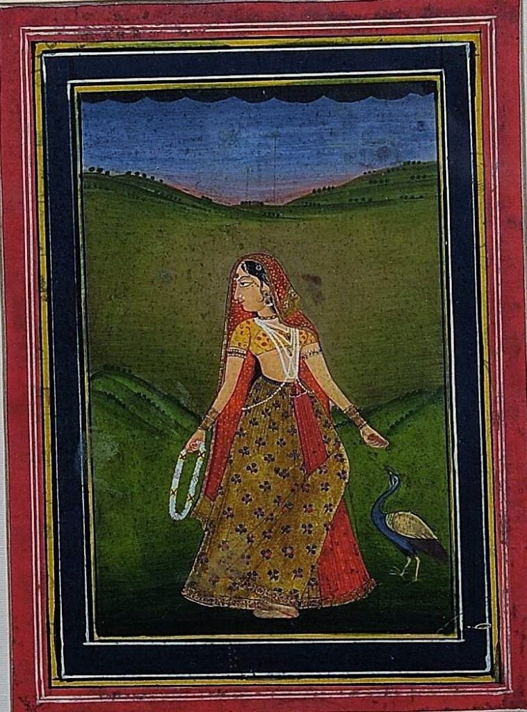 The essence of Kamodi Ragini is viraha, the pain of solitude and longing. Kamodi is a woman who adorns herself, creates a flower-garland, and waits all night for her lover. A garland is symbolic of the tryst of love. Here she is shown with a peacock who may be representing the absent beloved. A verse to Kamodi says of her –
