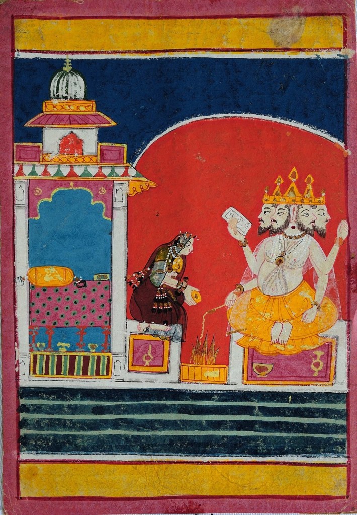 This painting illustrates the musical mode Khambavati Ragini, one of the wives of Malkos, the raga is associated with autumn. It is to be played in the early evening. The painter in the depiction of the melody portrays Khambavati as a beautiful young woman performing a fire ritual to the four-headed god Brahma, the creator of the Hindu trinity of Gods. A verse related to Khambavati says –
