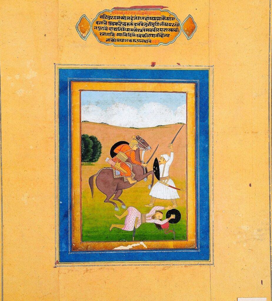 Nata Ragini is from the main Raga Hindol and depicts a scene in a war field. There is a warrior on a horse who has subdued one of his opponents who is lying on the ground. He is fighting with the other in the depiction. The character of Nata is martial. A verse on Nata says –