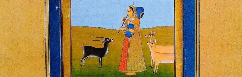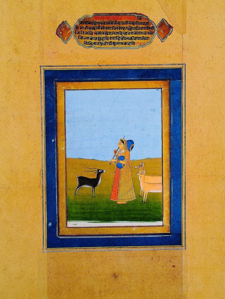 Ragini Todi, the wife of Raga Malkos is portrayed as a lovelorn nayika or heroine searching for her lover in the forest or grove. The deer is a symbolic representation of a companion to the desperate nayika. They are mesmerised by her music as she plays the Todi ragini on her instrument. Here the deer include an antelope and two doe who are with her. A verse to Todi –