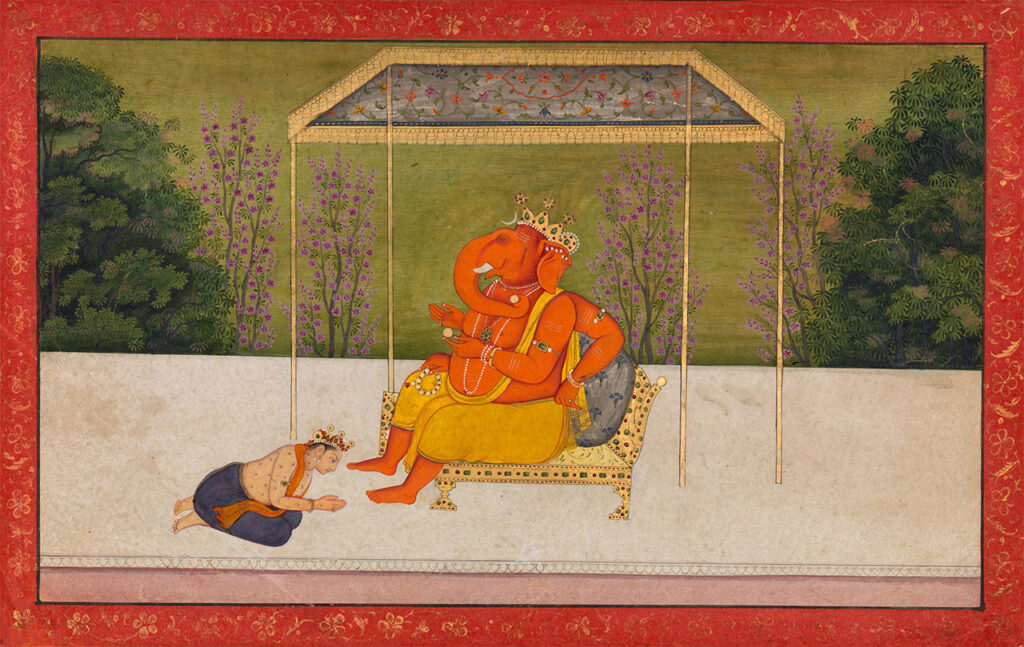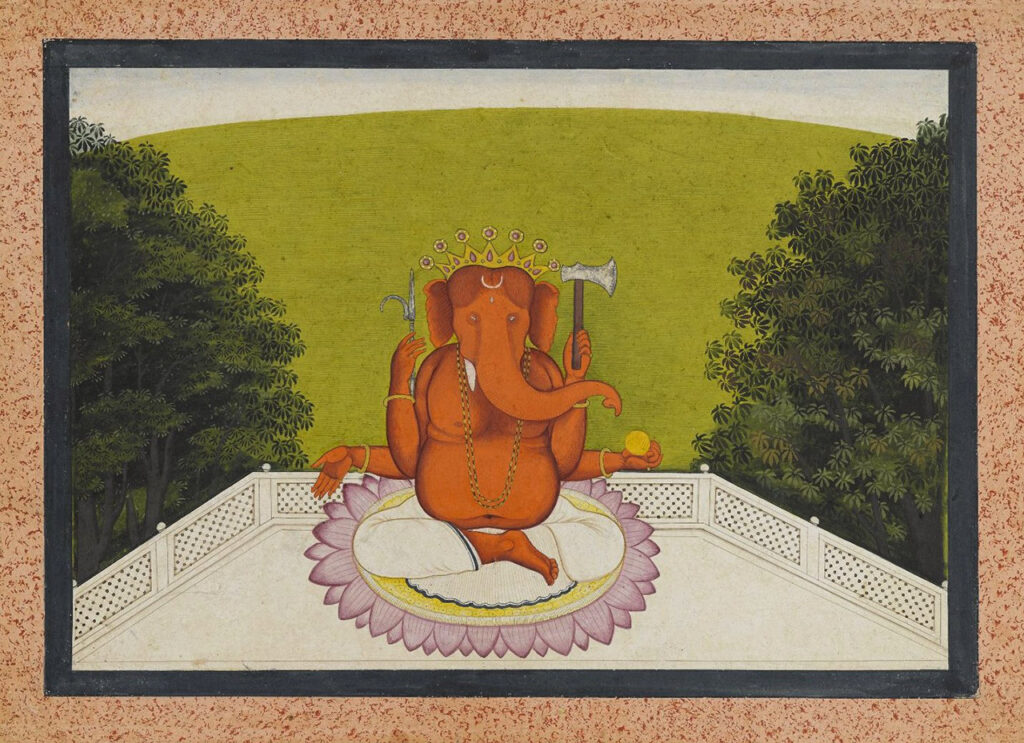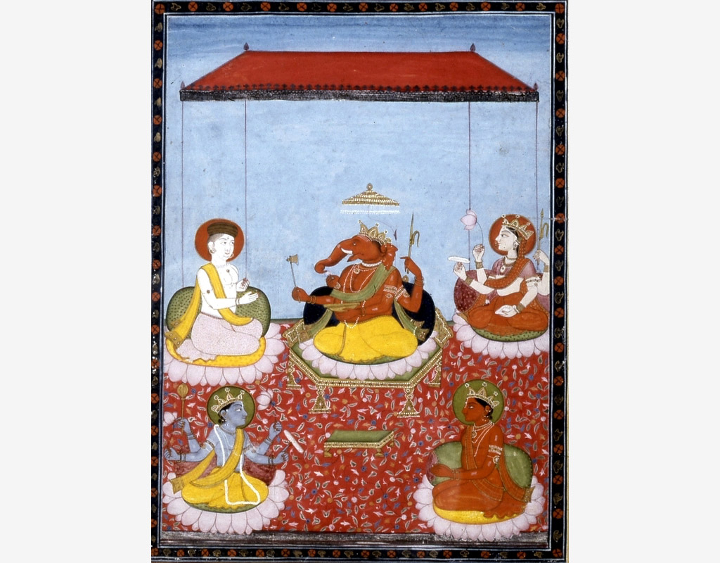 This Kangra composition resembles an Indian ruler’s court with Ganesha as the main judge. But actually, it is a format of Ganesha panchayatana. Panchayatana puja has been attributed to Adi Shankara, the 8th-century Hindu saint, but there is evidence that it might have been there before his birth. The form has Ganesha in the centre with Lord Shiva at the top left, Durga or Adi Shakti at the top right, Lord Vishnu at the bottom left, and God Surya at the bottom right. The five gods represent five elements, ether, fire, air, earth, and water. Lord Ganesha corresponds to water.