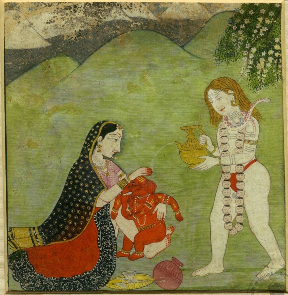 This miniature painting from the Kangra School depicts a scenario happening on Mount Kailash, the abode of Shiva and Parvati. Ganesha, who is depicted red, is being bathed by his parents; Shiva is pouring the water while Parvati is bathing him. There are mountains in the background though they are in a green space with a flowering tree. Goddess Parvati is dressed in finery along with pearl jewellery and mahawar, a red lac dye on her hands. Shiva is shown with a garland of skulls holding a ‘kamandal’ like vessel from which he is pouring the water. This beautiful miniature capturing a domestic scene is from the Allahabad Museum, Prayagraj, India.