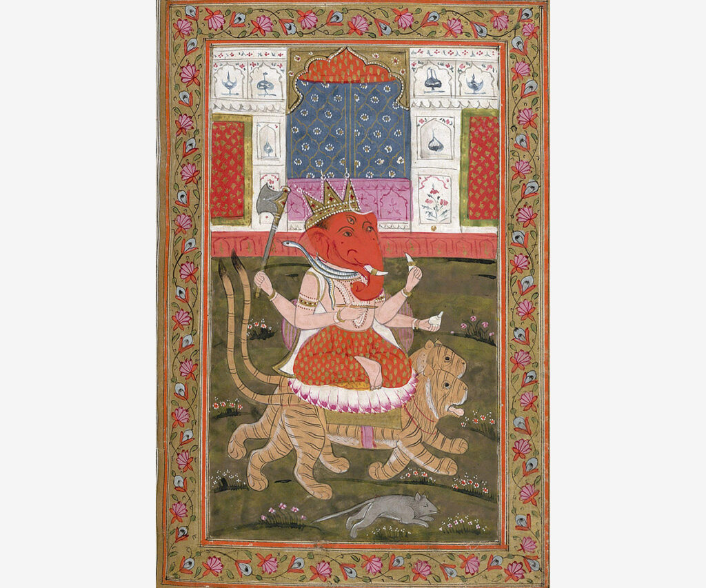 This miniature painting is one of 12 miniatures from a manuscript of Hindu rituals and devotional tracts written in the Sanskrit language, in Sarada script with 74 pages and kept in the British Library at London, U.K. In this composition, Ganesha is sitting on a lotus throne carried by tigers, which is a very rare depiction in paintings. He is holding his emblems and has a snake around his neck. The composition shows Mughal influence with arches having ewers and flagons in the backdrop; also, an arch and some ‘parchinkari’ or pietra dura kind of inlay work design. The floral scroll adds beauty to the composition of Ganesha who is traversing a grassy floral landscape with his vehicle mooshaka. Simha Ganesha has many forms. He maybe seated on a tiger and also display another lion, emblems could include a twig from the kalpavriksha, the musical instrument veena, a lotus flower, a floral bouquet and a pot of gems in his hands. He may have a mixed face of a lion and an elephant. This form symbolizes courage and strength to the devotees.