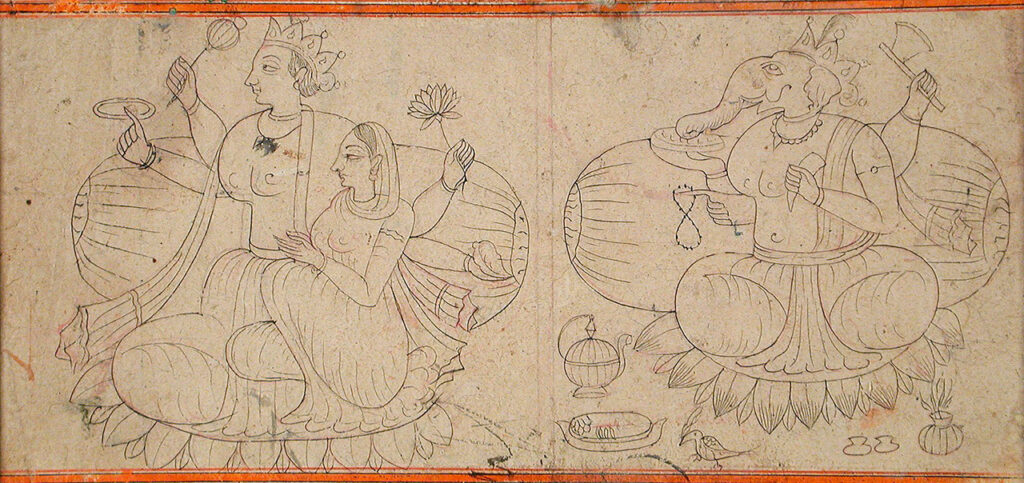 This drawing from Chamba shows Ganesha and Lord Vishnu and Goddess Lakshmi. It was meant to be filled with colour but is an unfinished composition. However, the drawing is very clear and we can see the emblems of the gods depicted. They are seated on lotus thrones with bolsters.