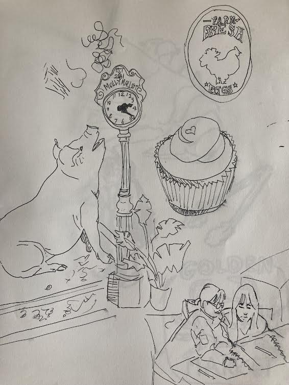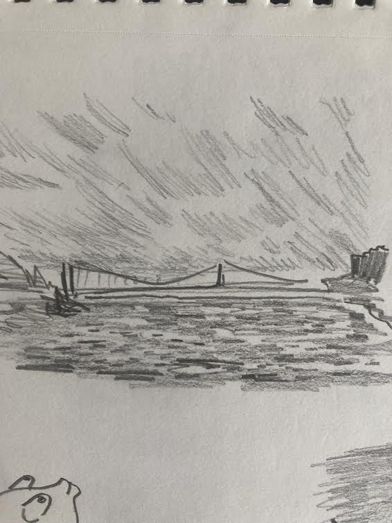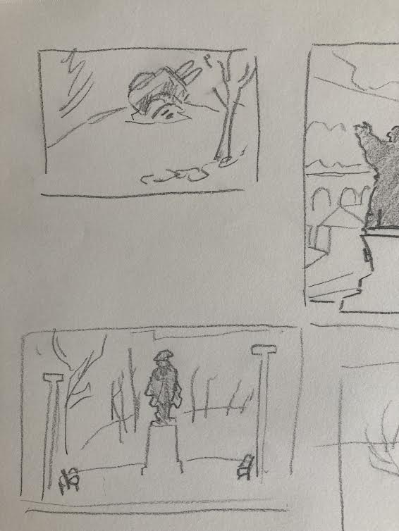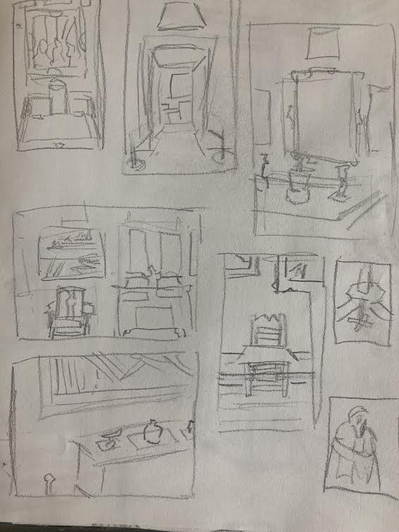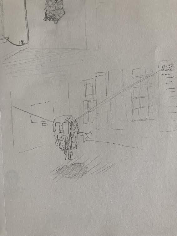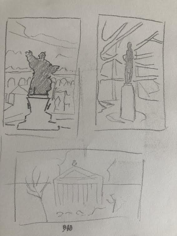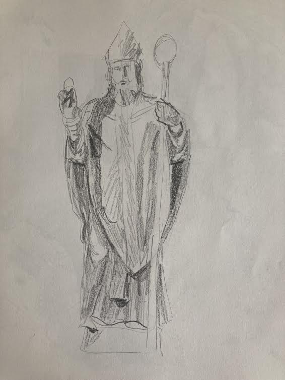 We met with the rest of the class in the front of the building. A group of my classmates had huddled into the space behind one of the columns of the facade to escape the tide of wind. I craned my neck up to try to take in all of the intricate details of its design but found that it was simply too large and ornate to do so. A plaque on the front detailed the construction and dedication of the church, revealing that it was almost 200 years old. In a small entrance hallway, our professor told us the day’s assignment. We were to cut out a hole in a piece of paper and use it as a viewfinder, replicating what we saw onto a page as if it were a window. I wondered what kind of view I would try to replicate, settling on the idea of focusing on something with large defined shapes.